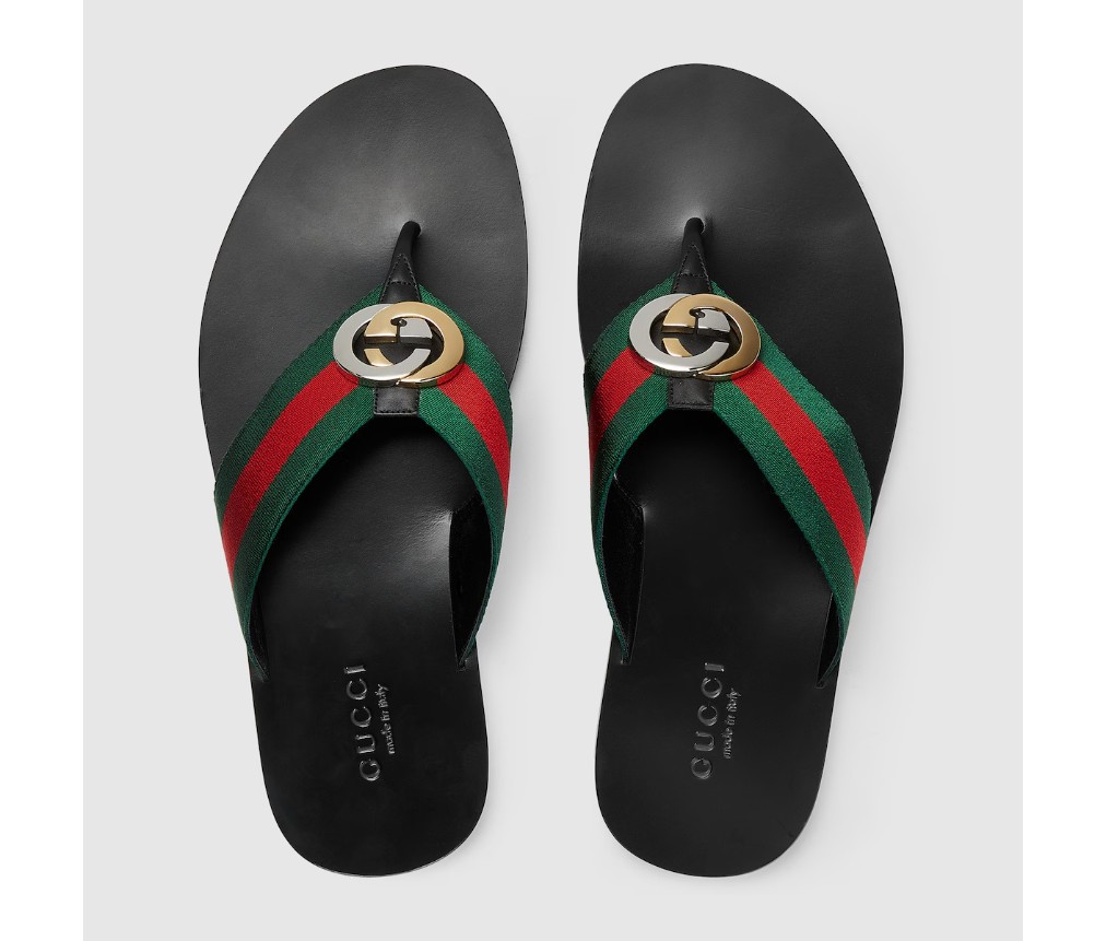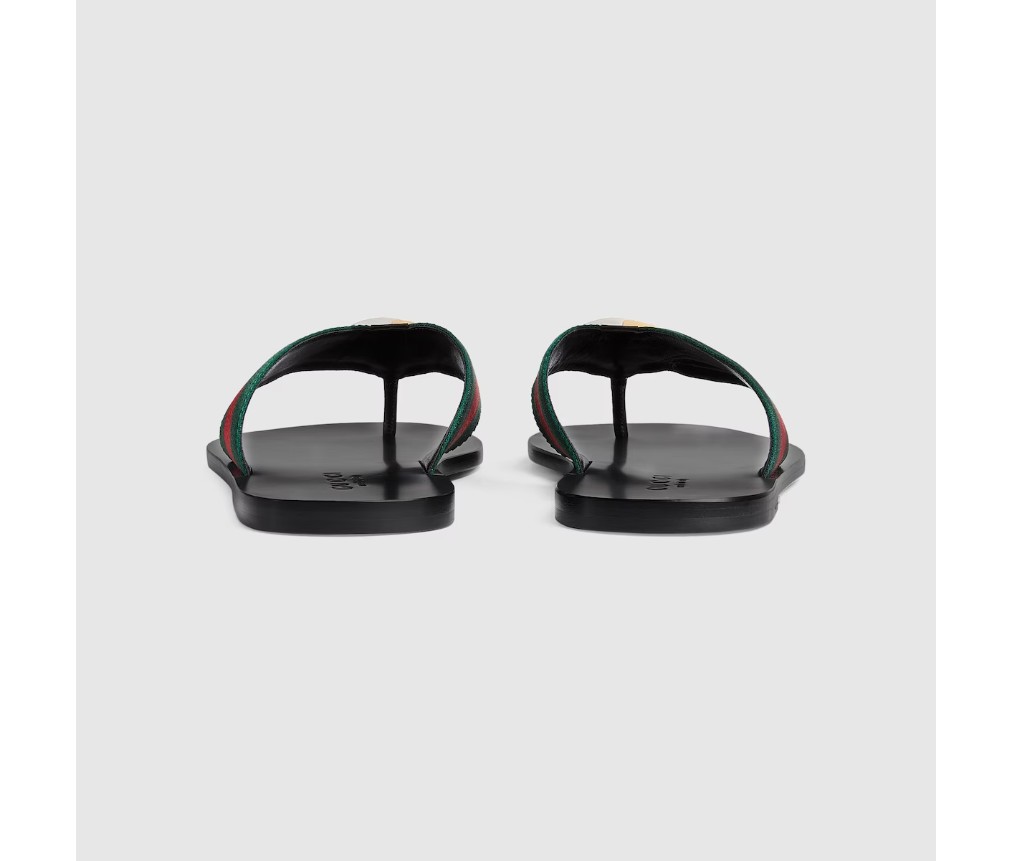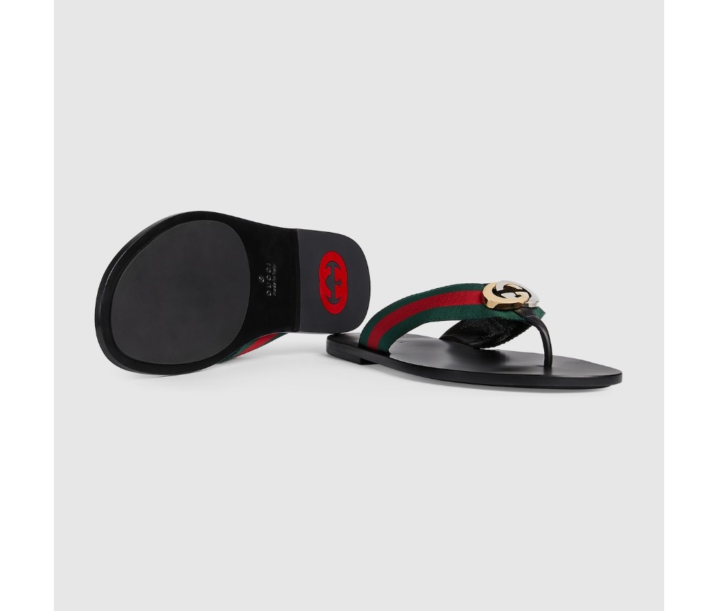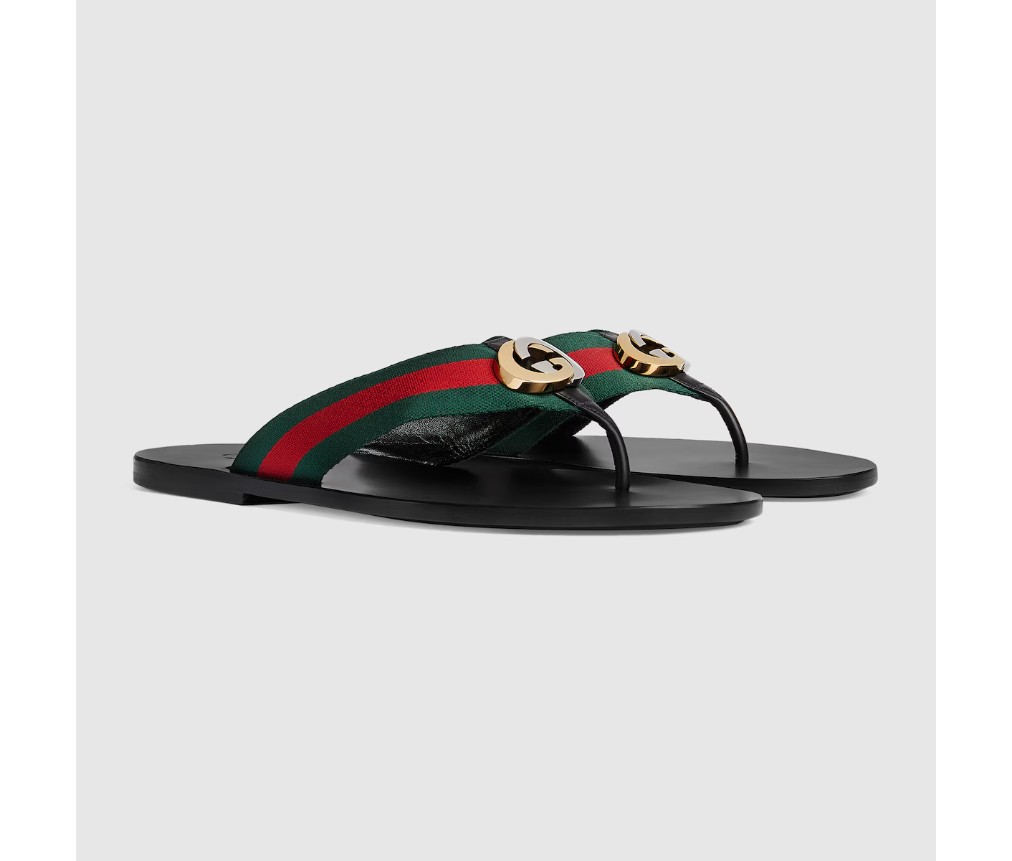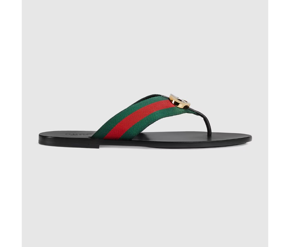 하우스 코드는 전통적인 통 샌들을 정의하며, 스트랩에 녹색과 빨간색 웹이 표현되었고, 대조적인 금속 톤의 상호 잠금식 G 디테일이 병치되었습니다.