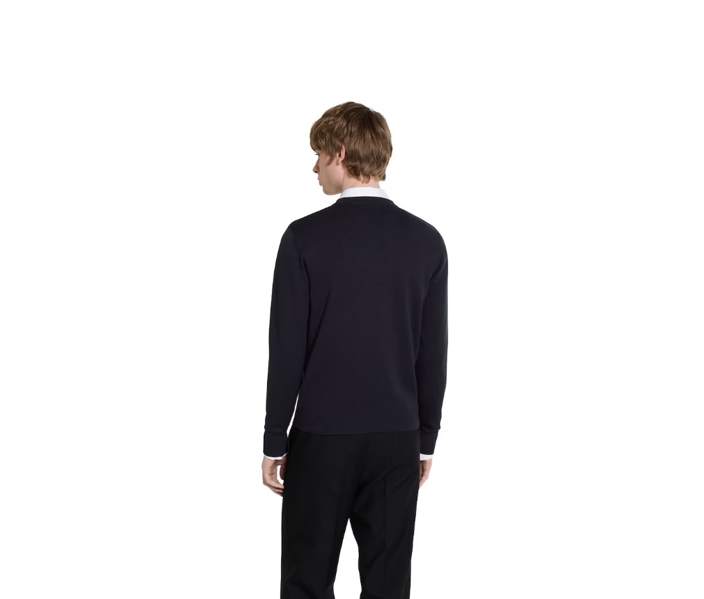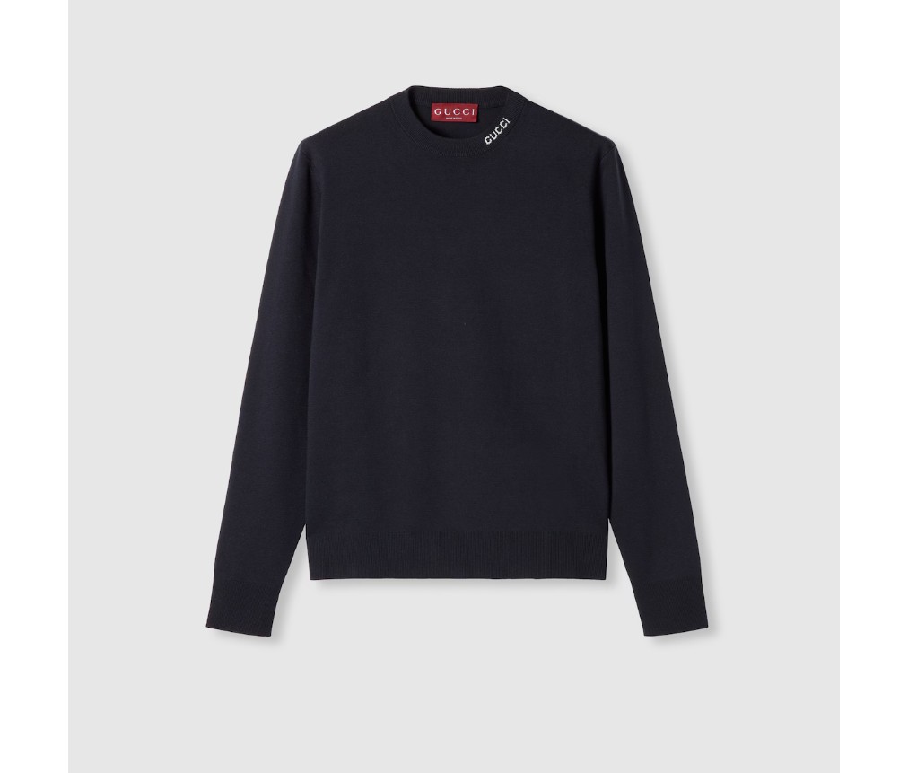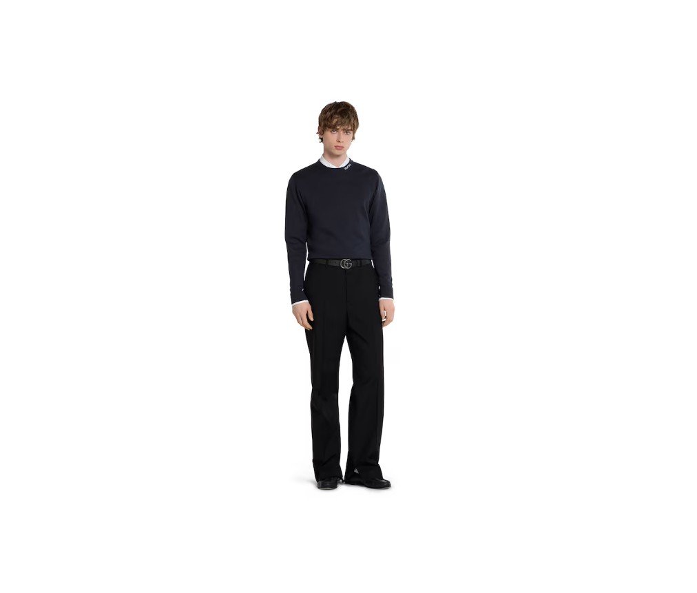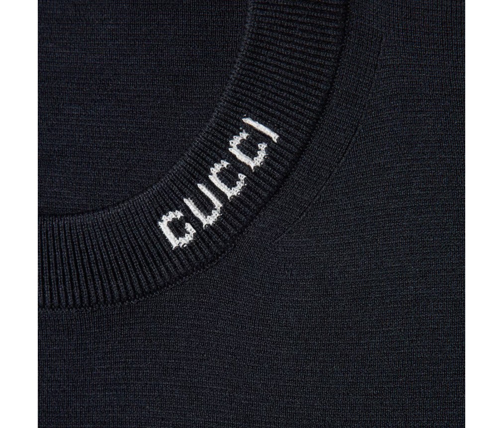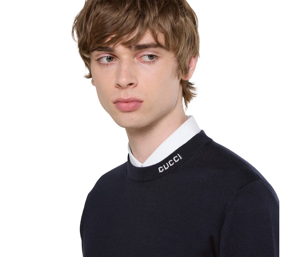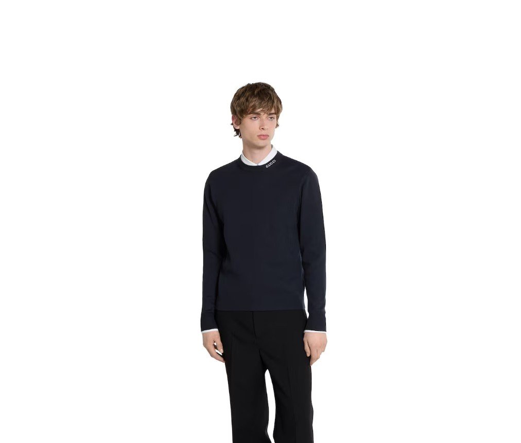 2025 프리폴 컬렉션은 데이웨어부터 이브닝 웨어까지, 상징적인 디테일이 돋보이는 에센셜 실루엣을 선보입니다. 이 스웨터는 네이비 실크 코튼 니트 소재에 구찌 인타르시아 장식이 더해졌습니다.