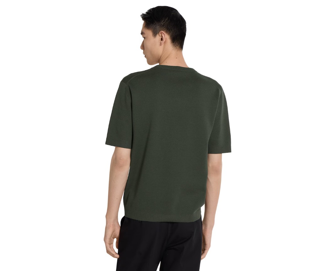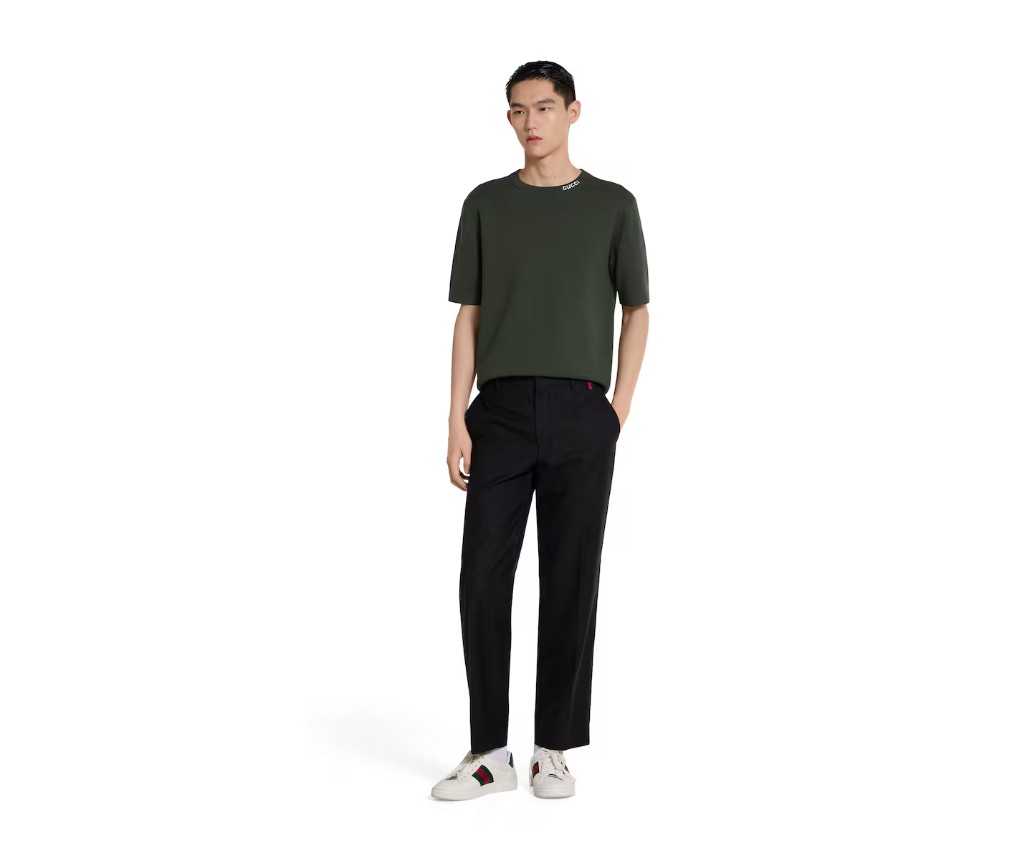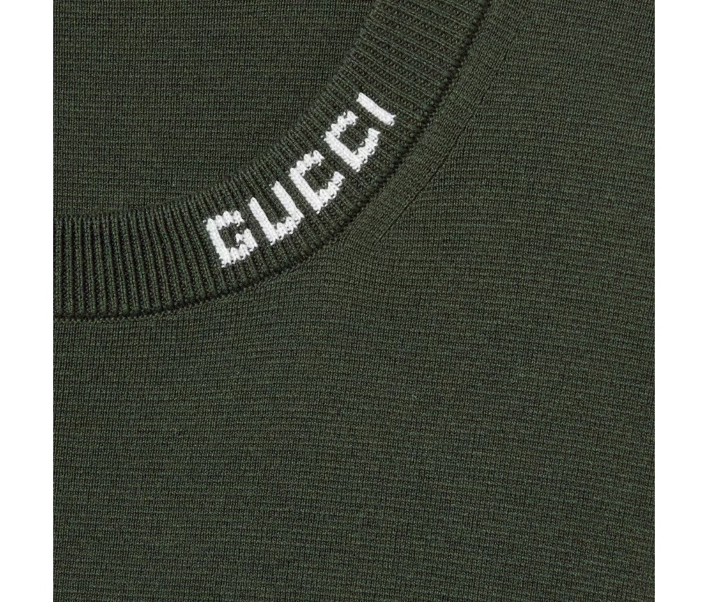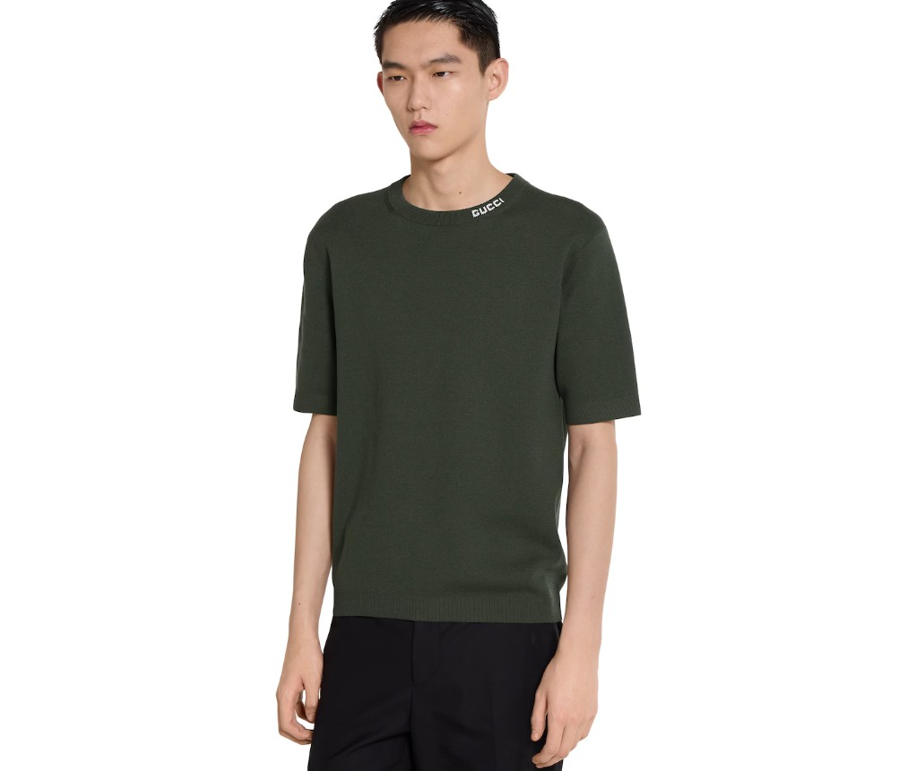 2025 프리폴 컬렉션은 데이웨어부터 이브닝 웨어까지, 상징적인 디테일이 돋보이는 에센셜 실루엣을 선보입니다. 이 티셔츠는 포레스트 그린 실크 코튼 니트 소재로 제작되었으며, 구찌 인타르시아 장식이 더해졌습니다.