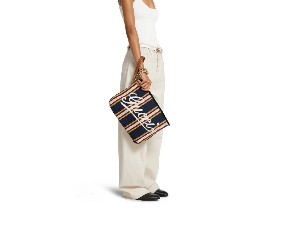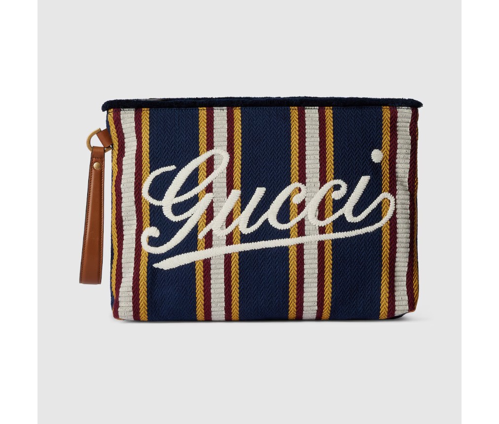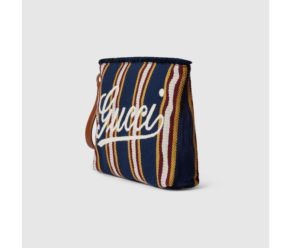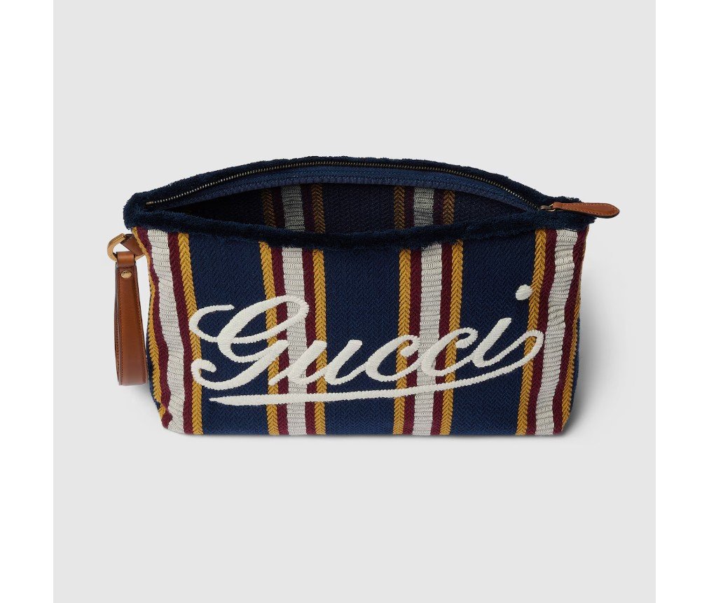 스타일 822870 FAEF8 87962025 봄/여름 남성 컬렉션은 새로운 모험에 어울리는 최신 스몰 가죽 제품과 남성용 가방을 통해 자유, 에너지, 그리고 공동체 의식을 표현합니다. 이 파우치는 시선을 사로잡는 스트라이프 헤링본 코튼 캔버스 소재로 제작되었으며, 앞면에는 구찌 스크립트 자수가 더해졌습니다.