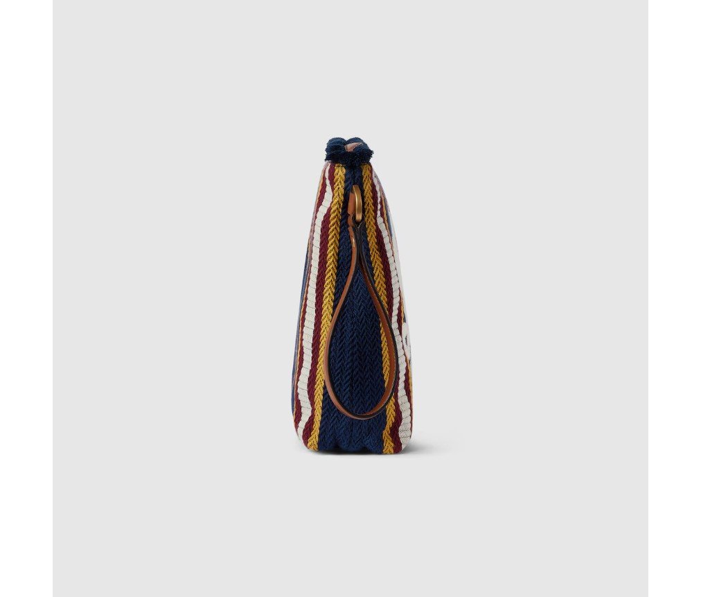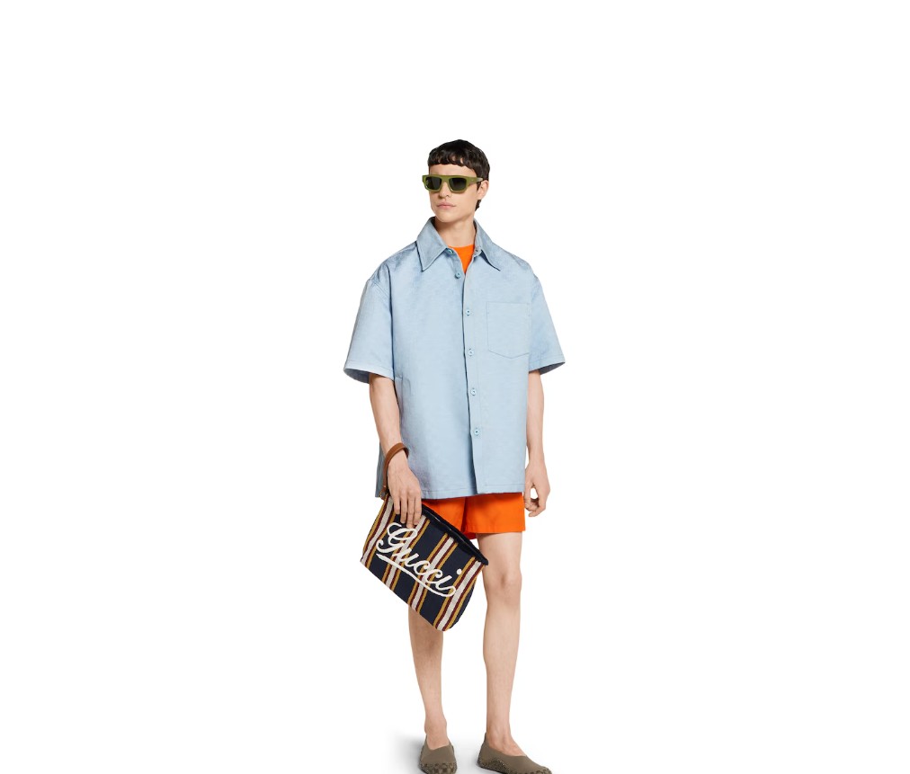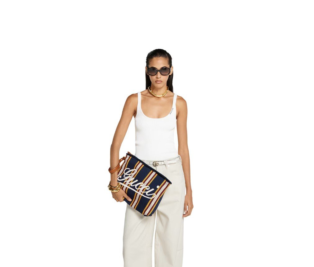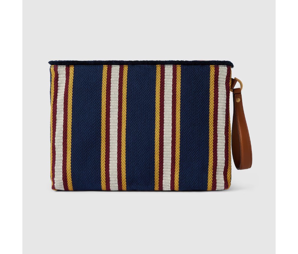 스타일 822870 FAEF8 87962025 봄/여름 남성 컬렉션은 새로운 모험에 어울리는 최신 스몰 가죽 제품과 남성용 가방을 통해 자유, 에너지, 그리고 공동체 의식을 표현합니다. 이 파우치는 시선을 사로잡는 스트라이프 헤링본 코튼 캔버스 소재로 제작되었으며, 앞면에는 구찌 스크립트 자수가 더해졌습니다.