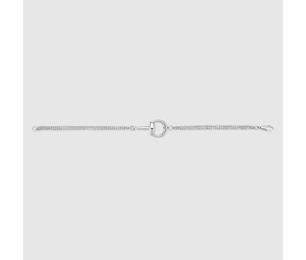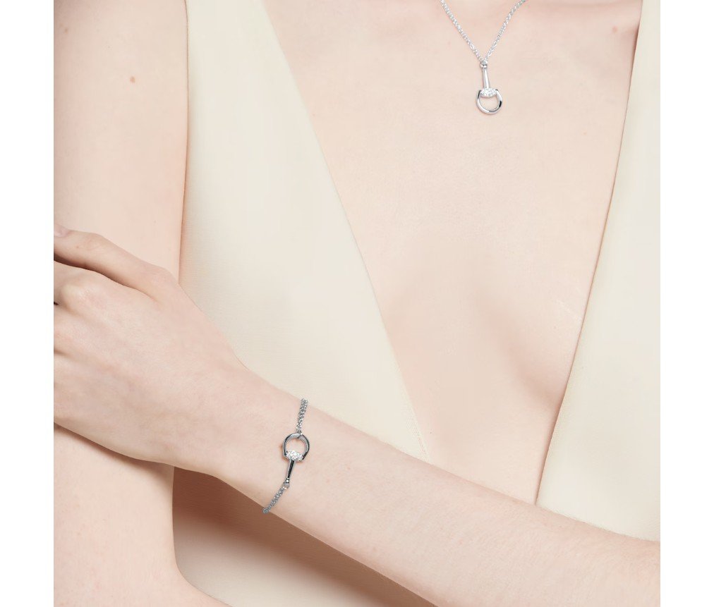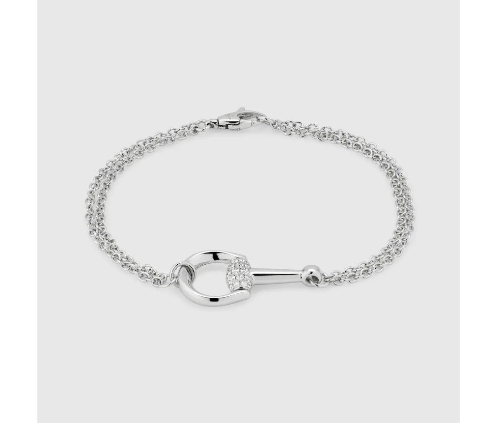 Horsebit 라인의 확장으로 눈길을 사로잡는 다이아몬드가 화이트 골드와 로즈 골드 주얼리 컬렉션에 새롭게 추가되었습니다. 이 18k 화이트 골드 체인 브레이슬릿은 Horsebit 디테일 위에 파베 다이아몬드가 세팅되어 있습니다.