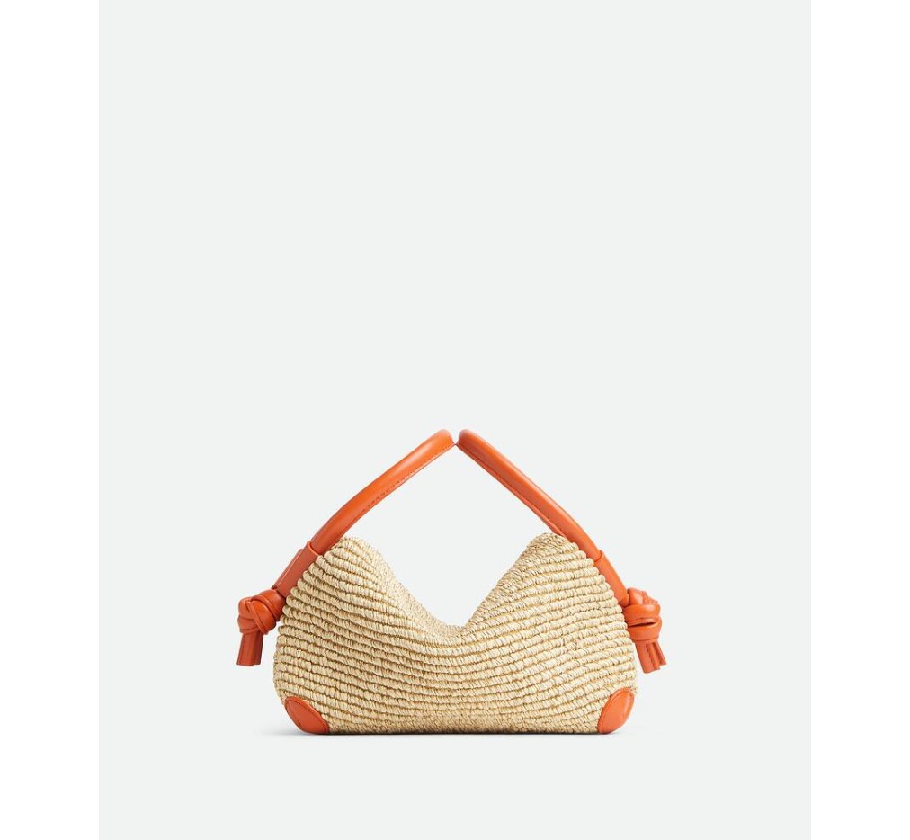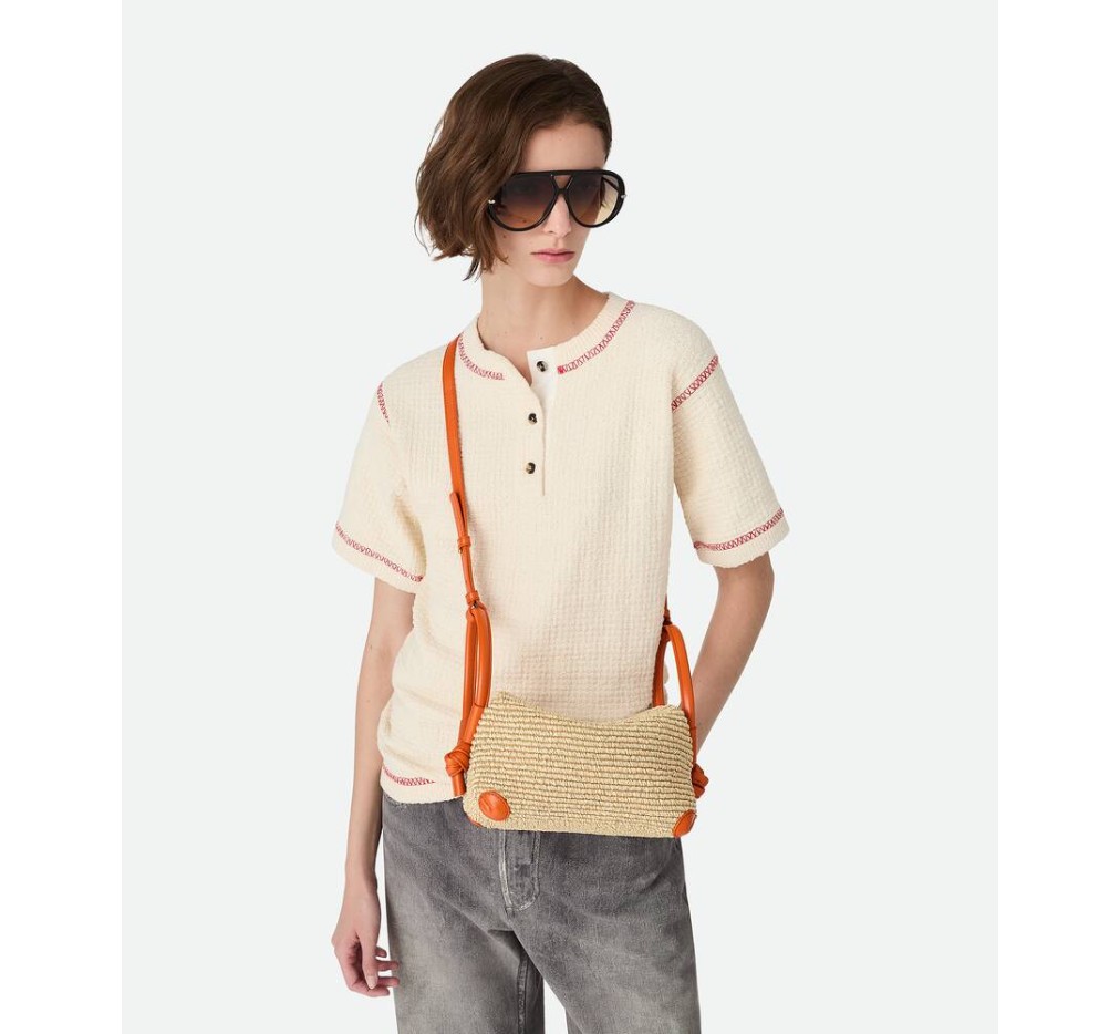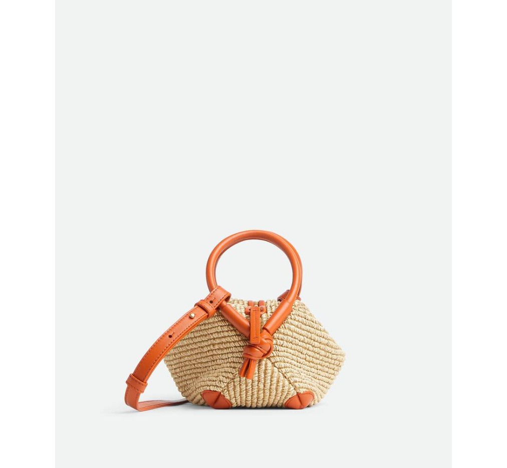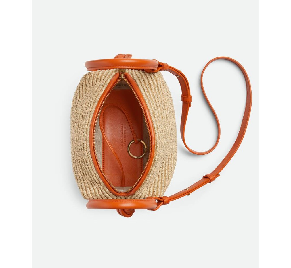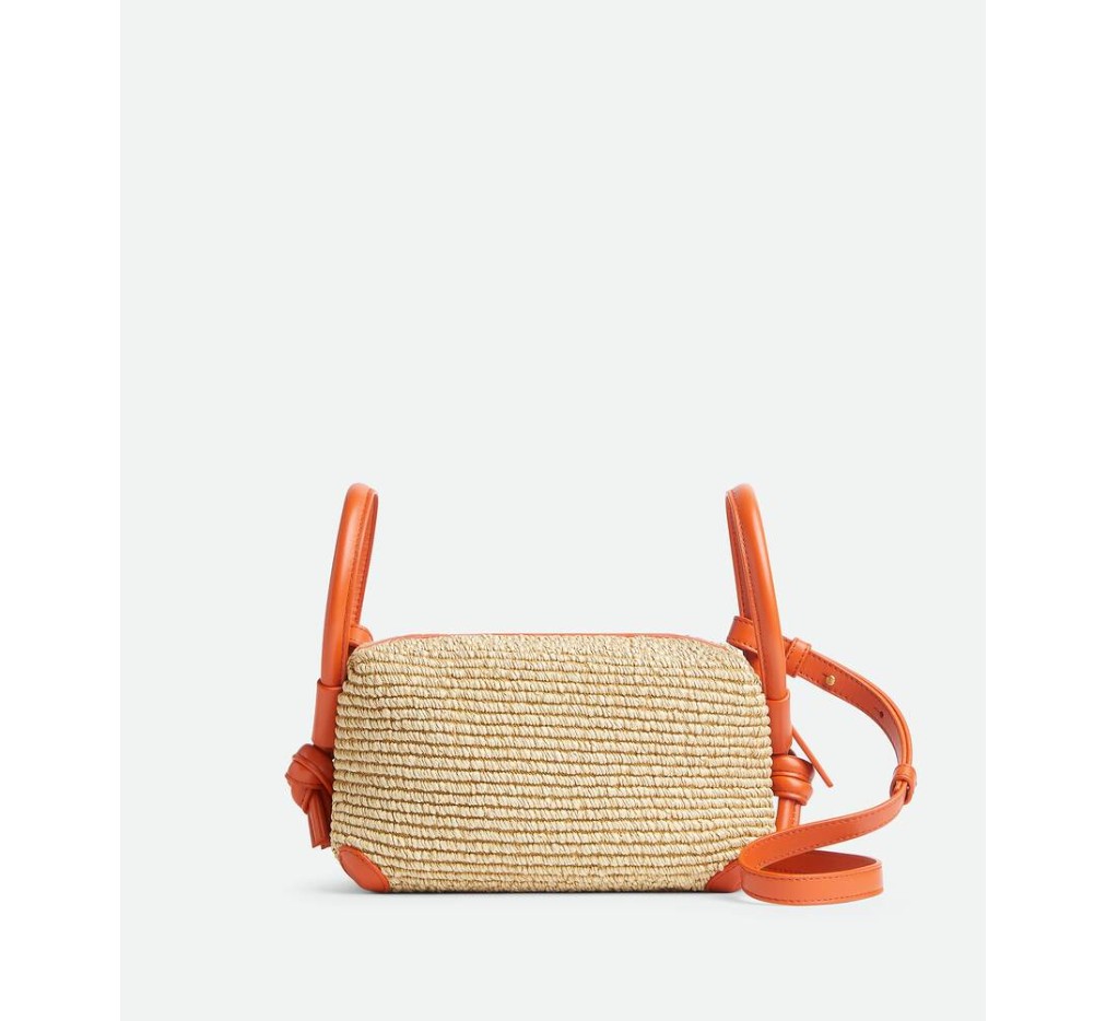 더블 가죽 핸들과 분리형 스트랩이 달린 라피아 토르숑 크로스바디 백입니다.