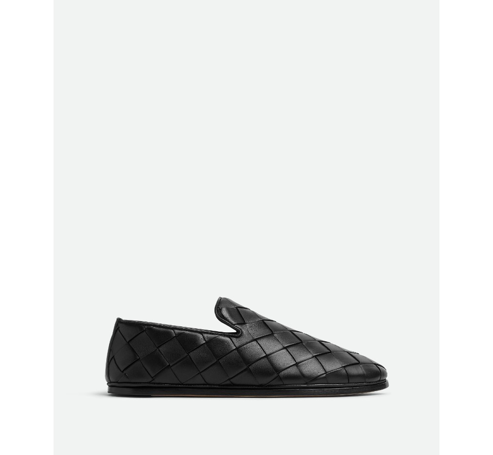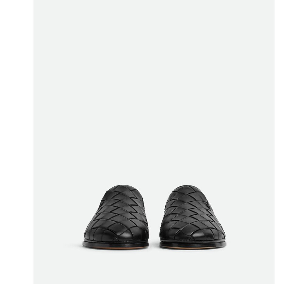 부드러운 양가죽으로 제작한 슬리퍼로, 전면 패딩 처리된 인트레치아토 기법이 돋보입니다.– 패딩 인트레치아토 가죽 슬리퍼