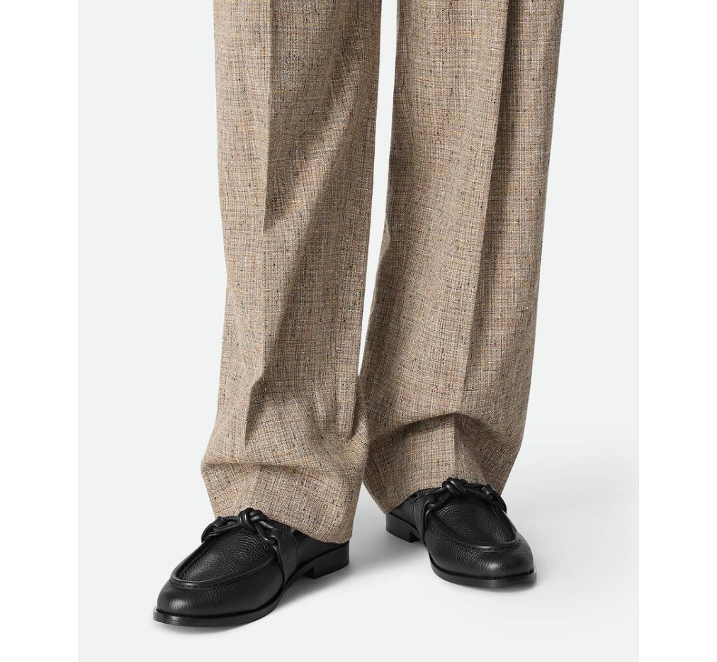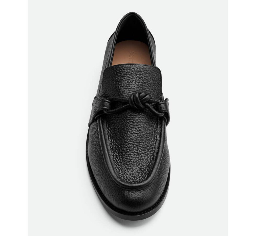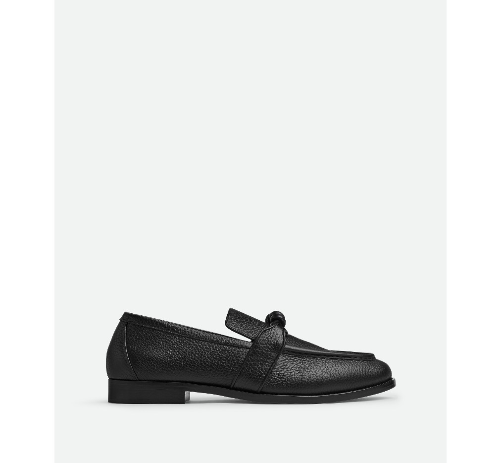 시그니처 매듭 디테일이 돋보이는 거친 송아지 가죽으로 제작된 로퍼입니다.– 그레이니 레더 로퍼