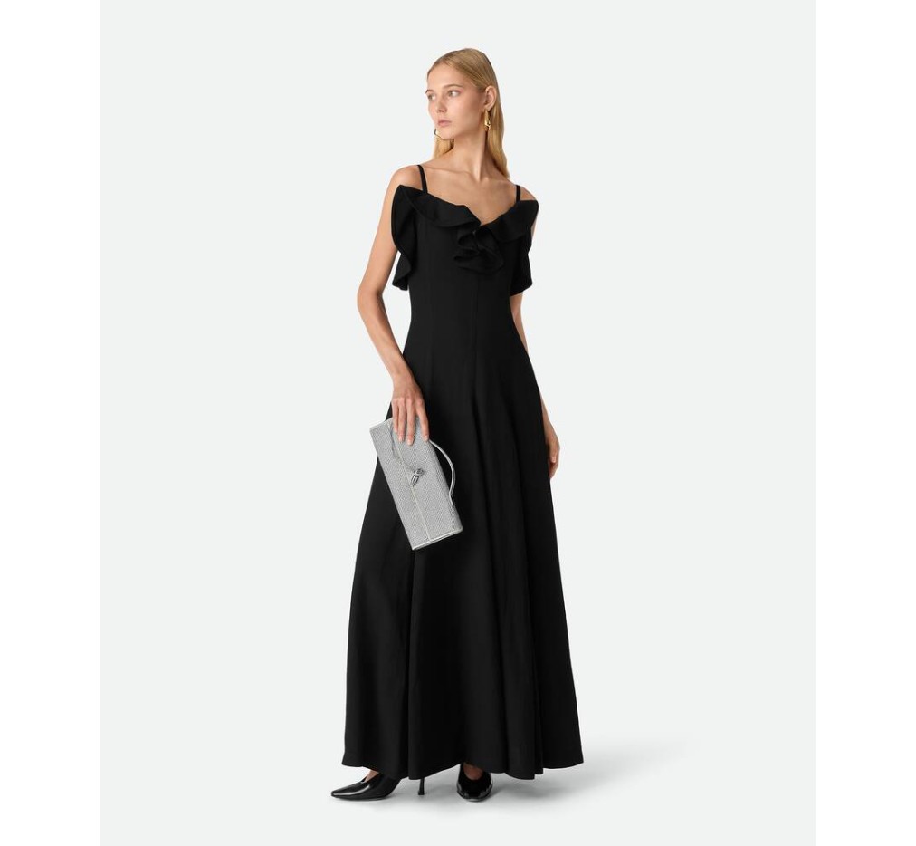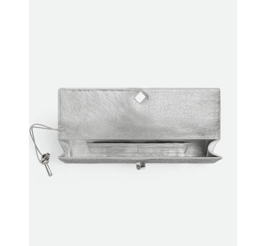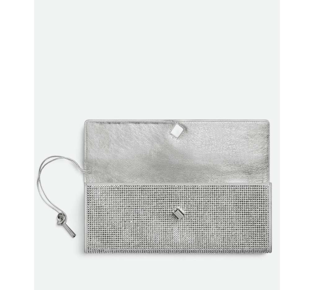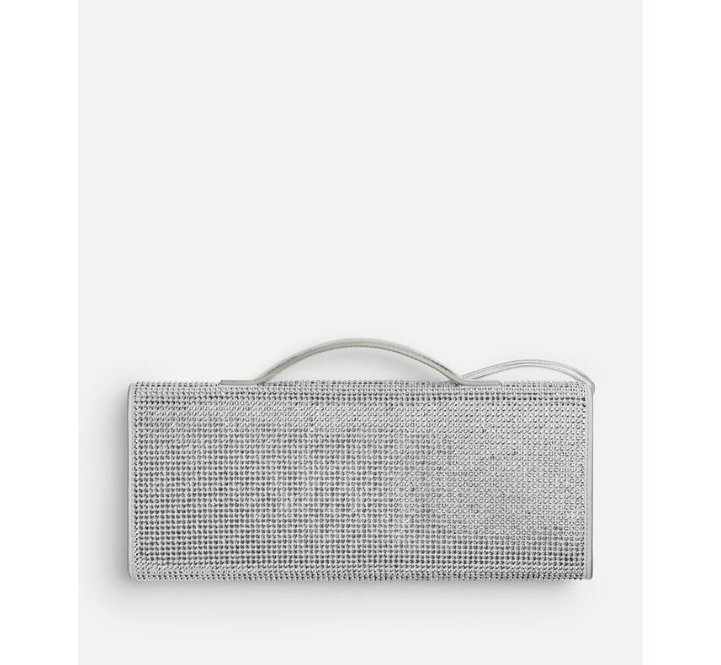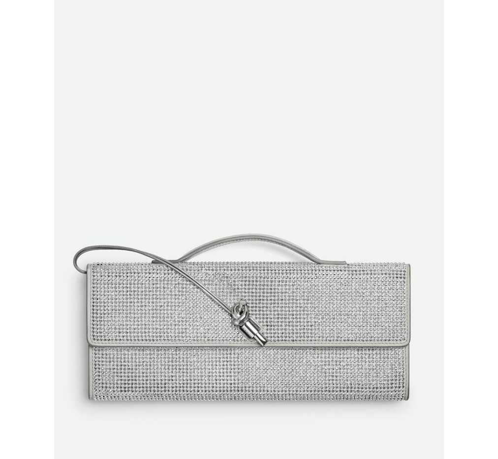 전면 크리스털 디테일과 시그니처 매듭 잠금 장치가 달린 부드러운 가죽 소재의 탑 핸들 클러치입니다.