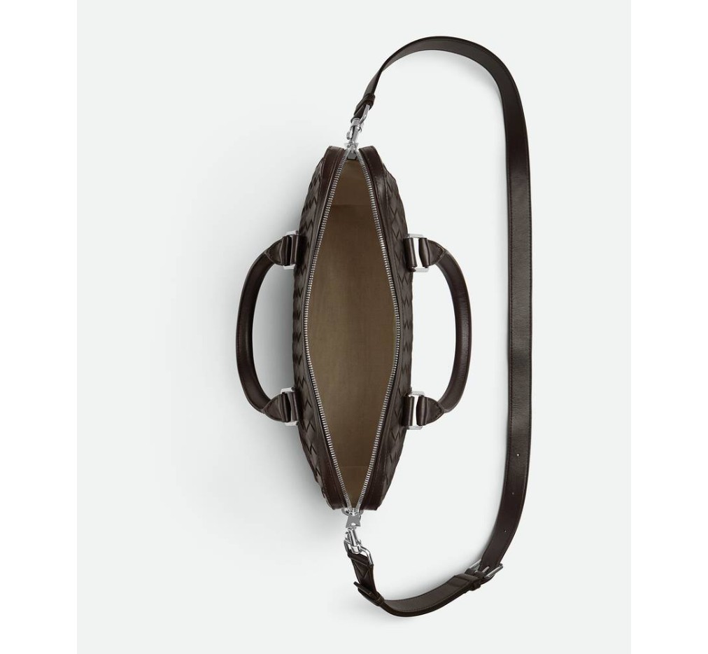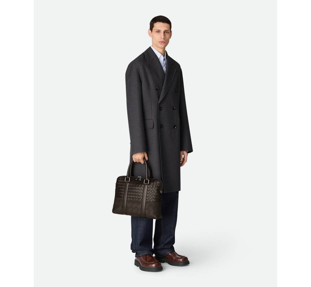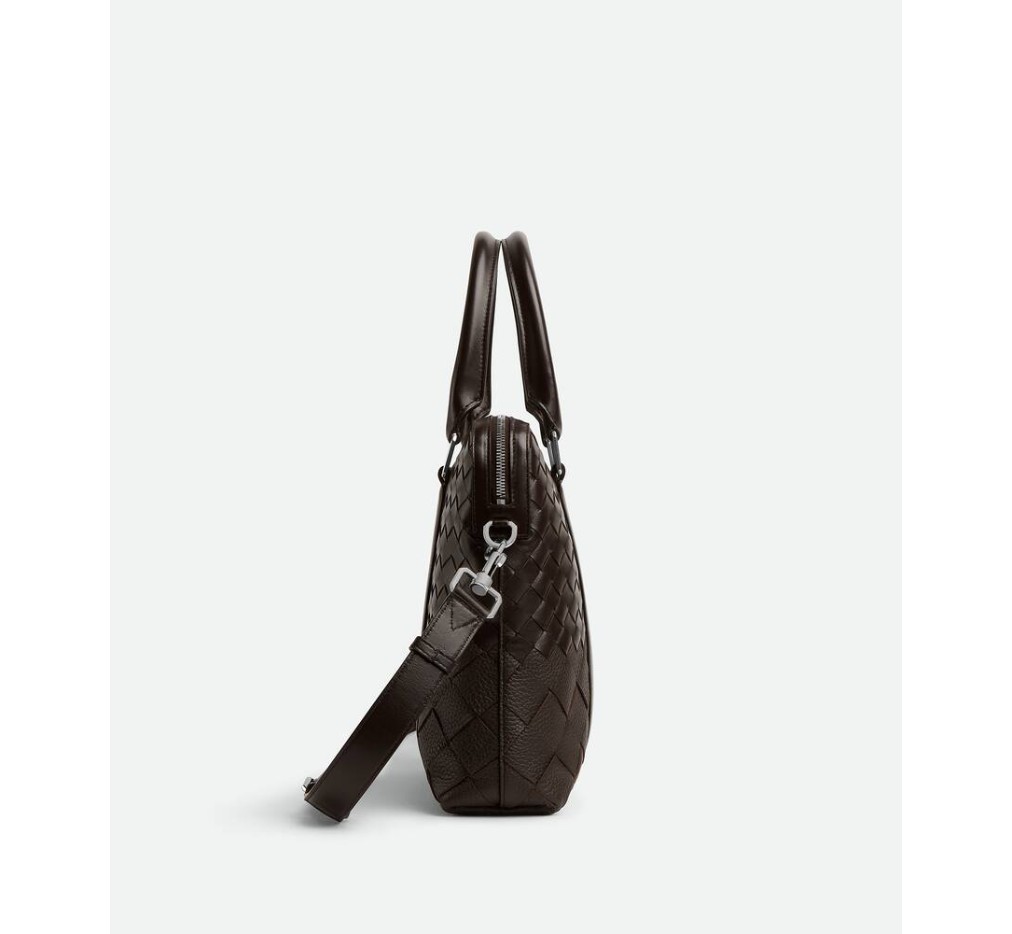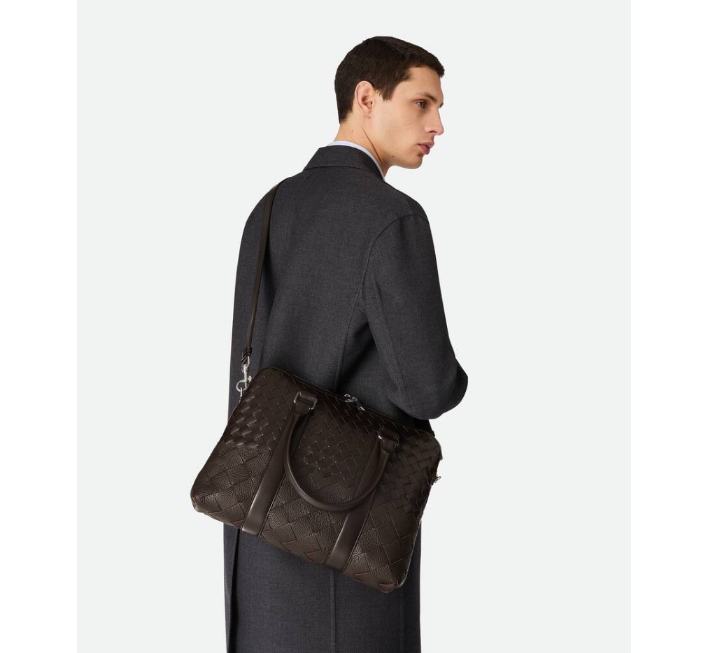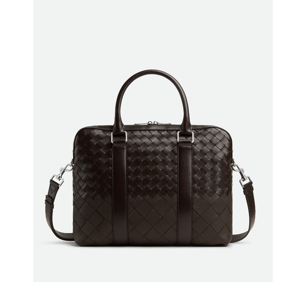 매끄럽고 무늬가 있는 인트레치아토 가죽으로 만든 드래드데 효과의 서류 가방으로, 조절 및 분리가 가능한 어깨 스트랩이 특징입니다.