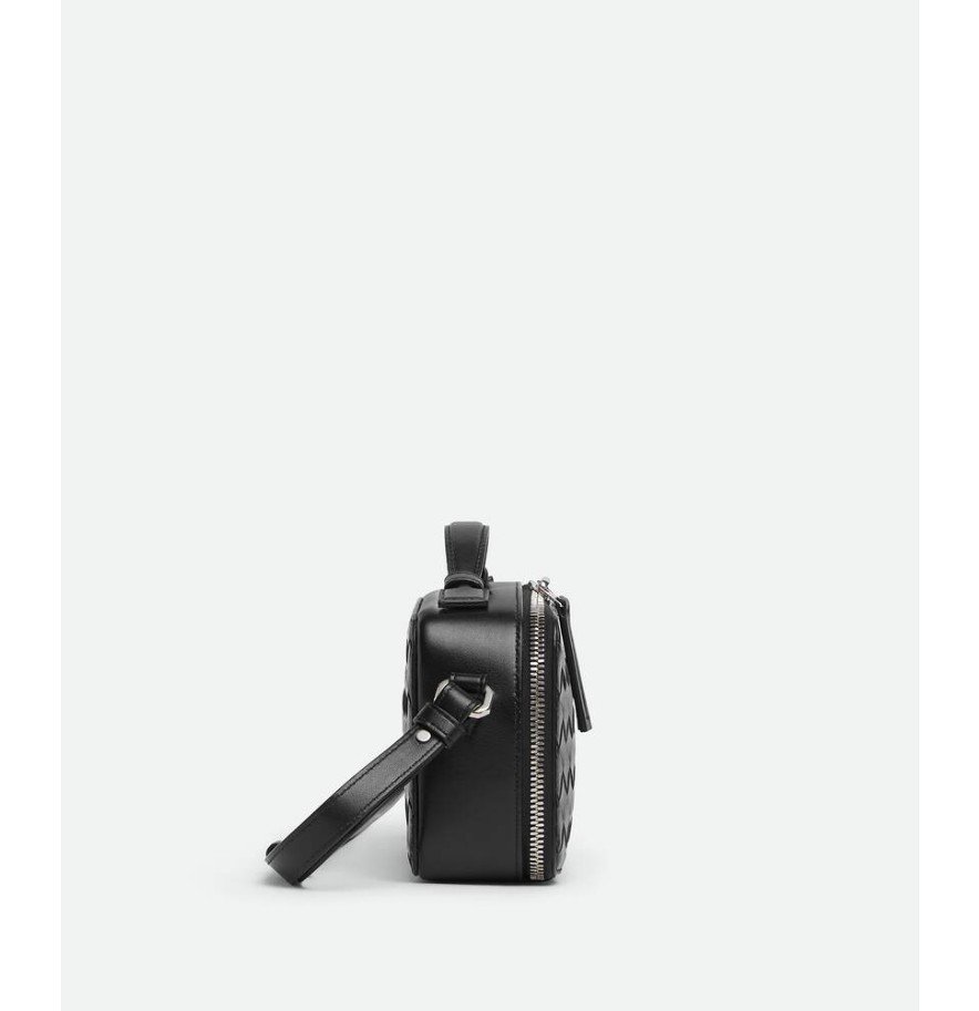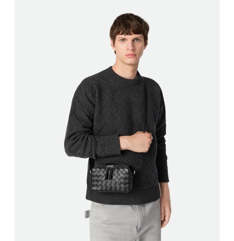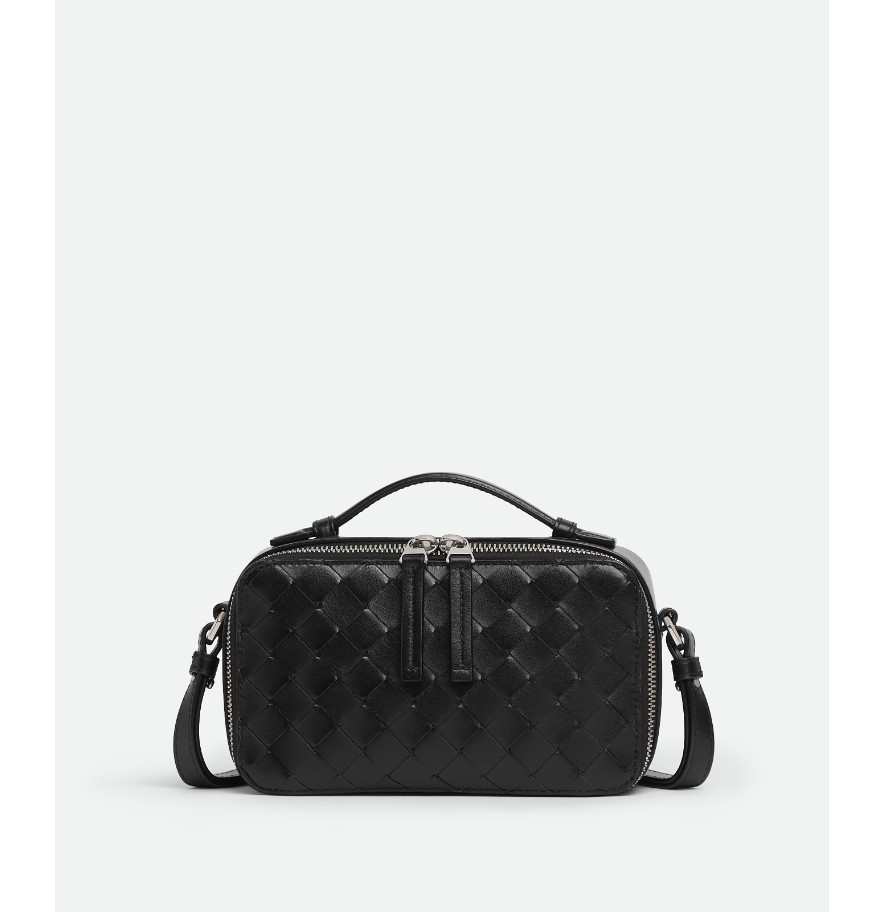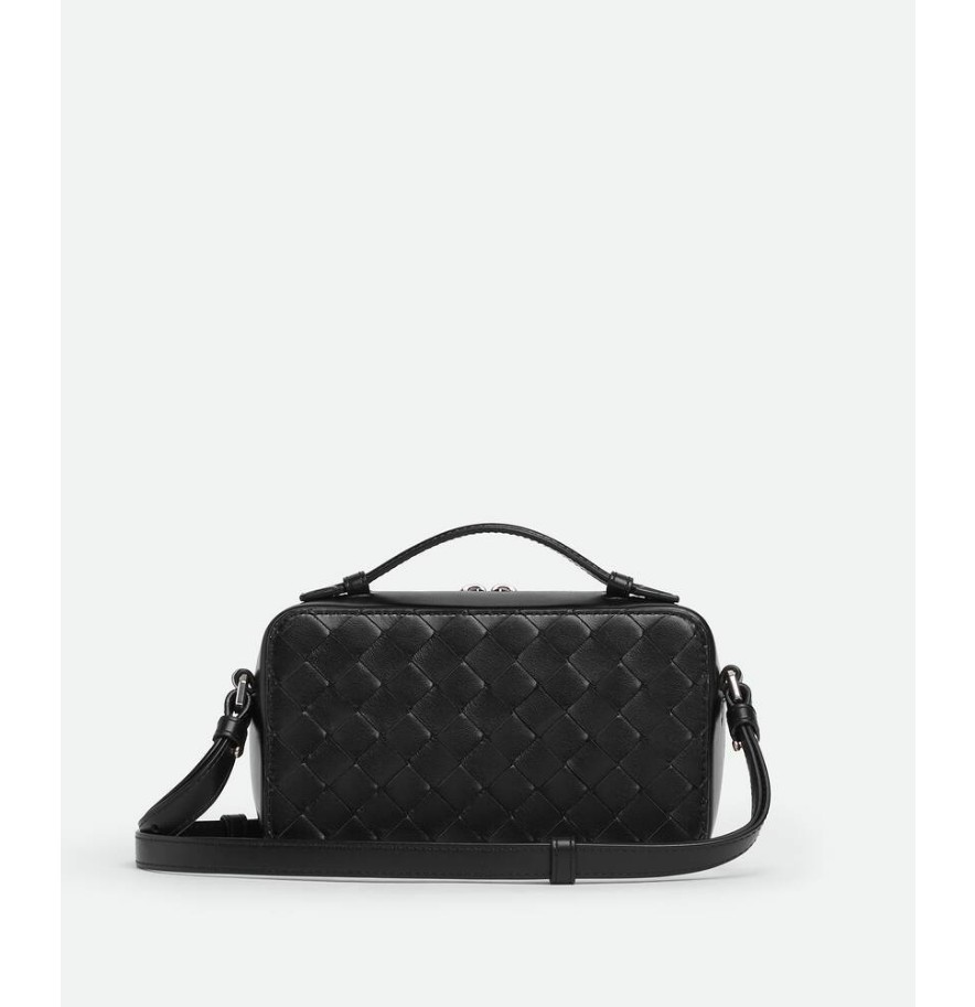 손잡이와 조절 가능한 크로스바디 스트랩이 달린 인트레치아토 송아지 가죽 소재의 휴대폰 파우치입니다.