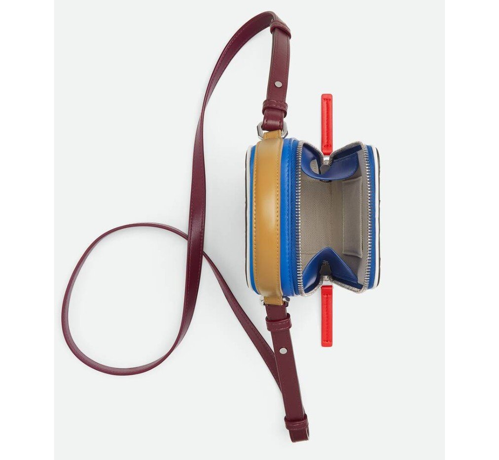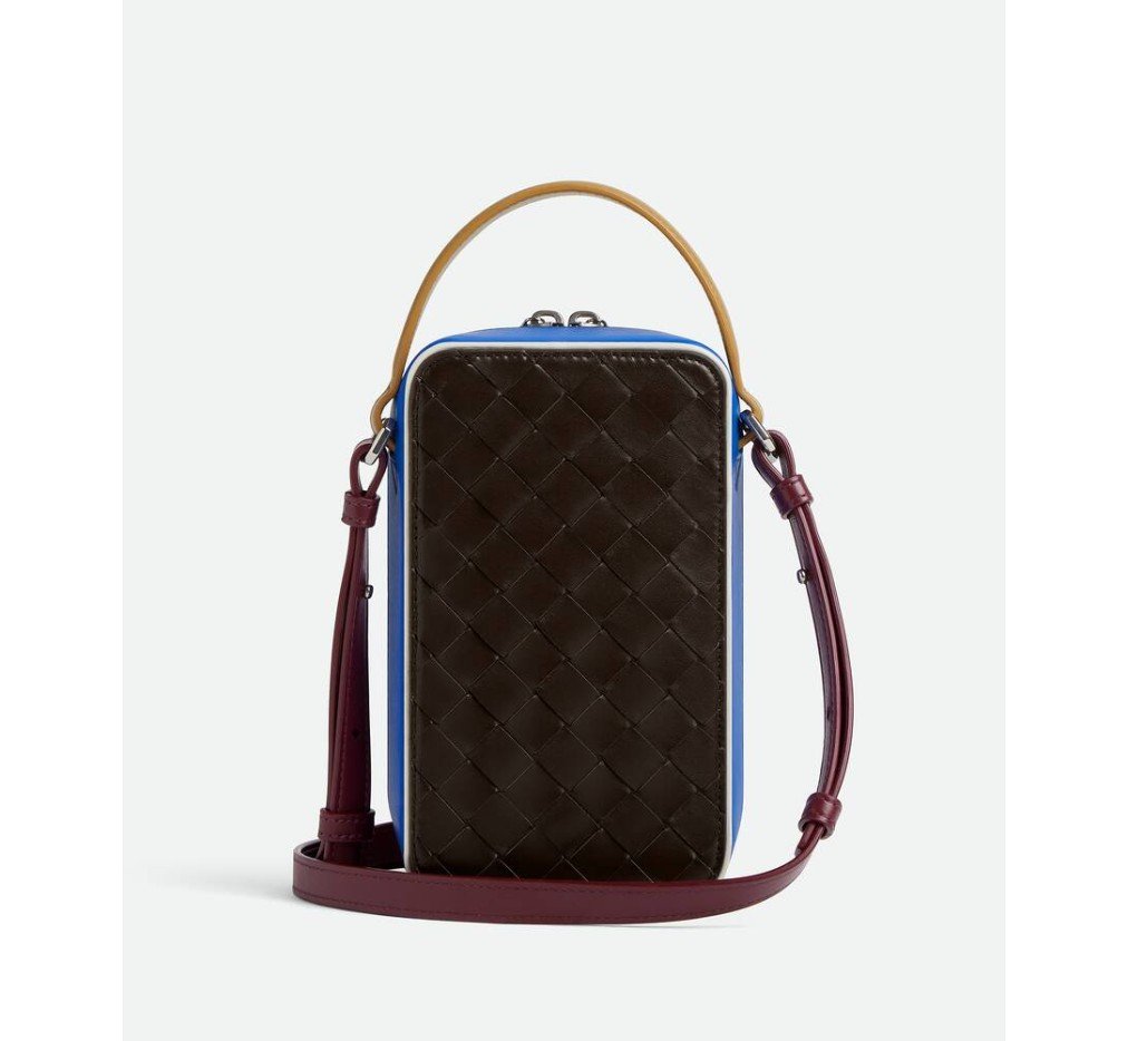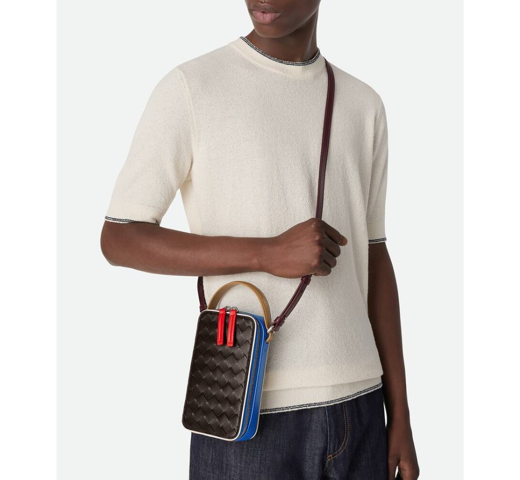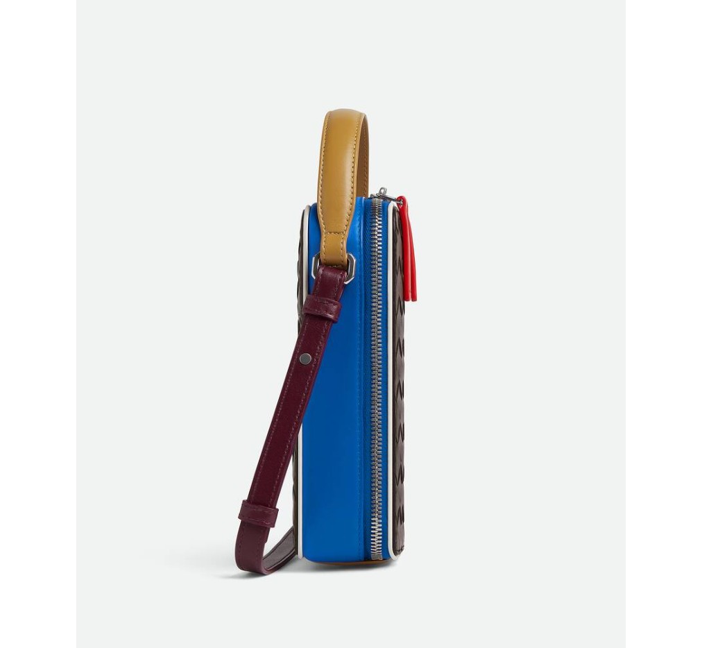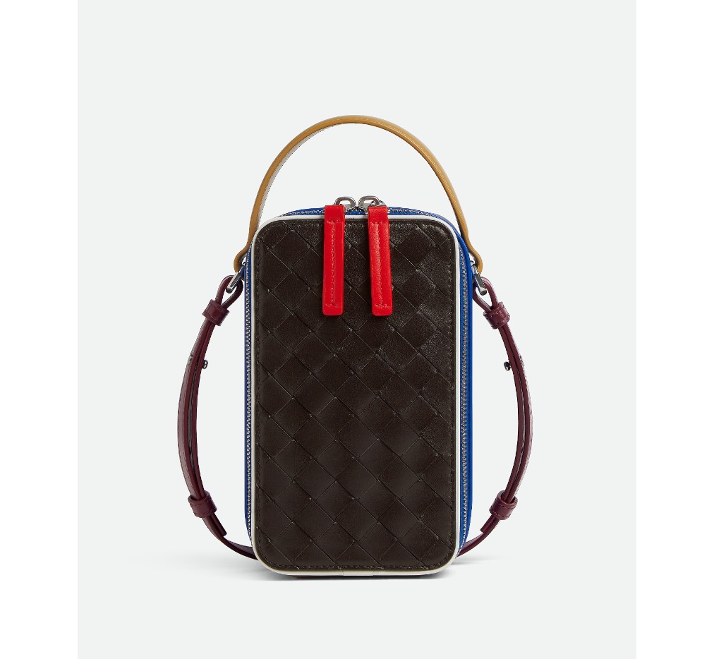 손잡이와 조절 가능한 크로스바디 스트랩이 달린 인트레치아토 송아지 가죽 소재의 휴대폰 파우치. 컬러 블록 효과가 특징입니다.