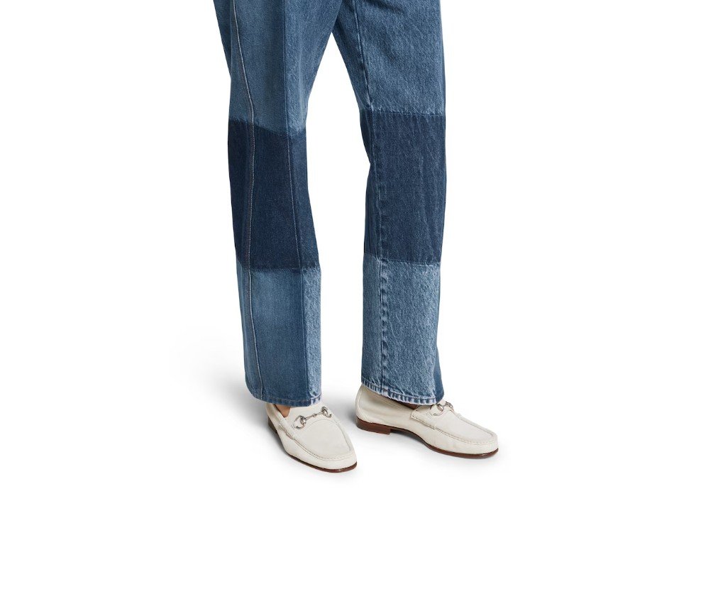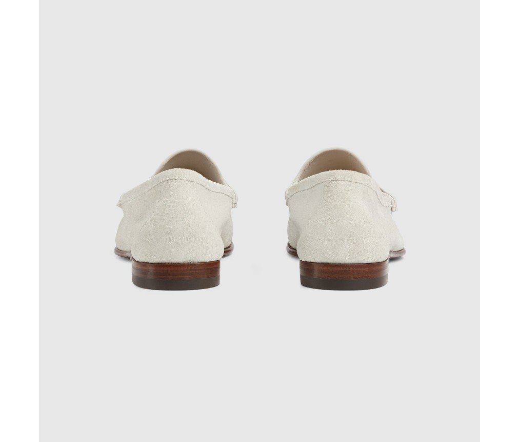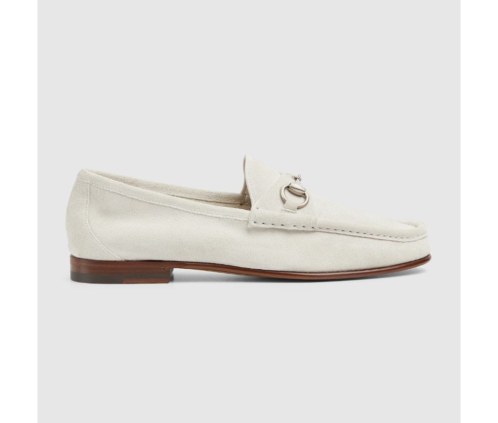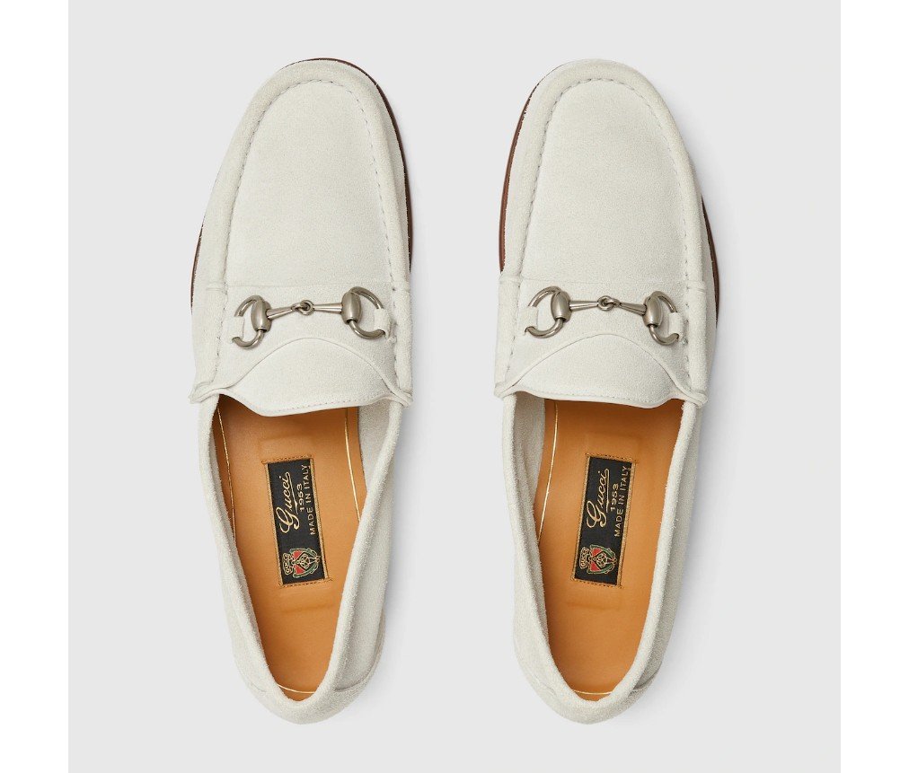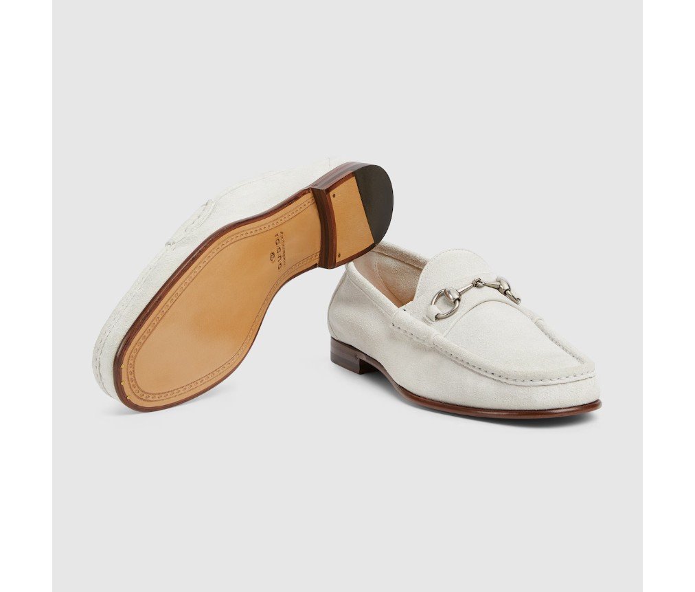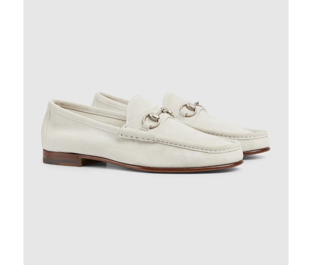 2025 봄/여름 컬렉션에서 선보이는 남성용 호스빗 1953 로퍼는 세련된 라이트 그레이 스웨이드 소재로 제작되었습니다. 우아한 실루엣이 돋보이는 이 액세서리는 실버 톤의 독특한 호스빗 장식으로 마감되었습니다.