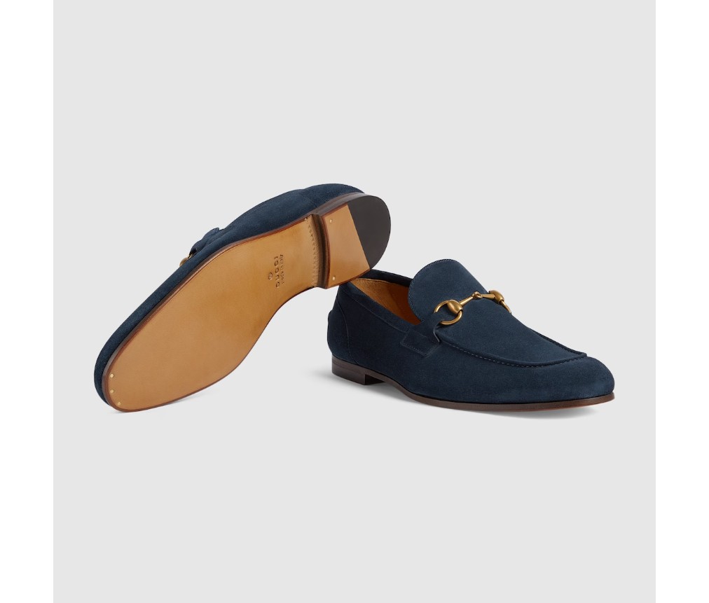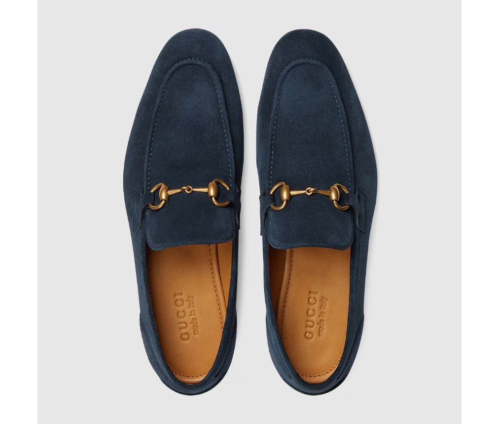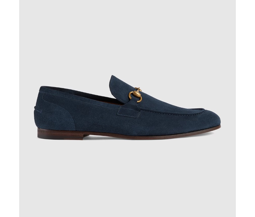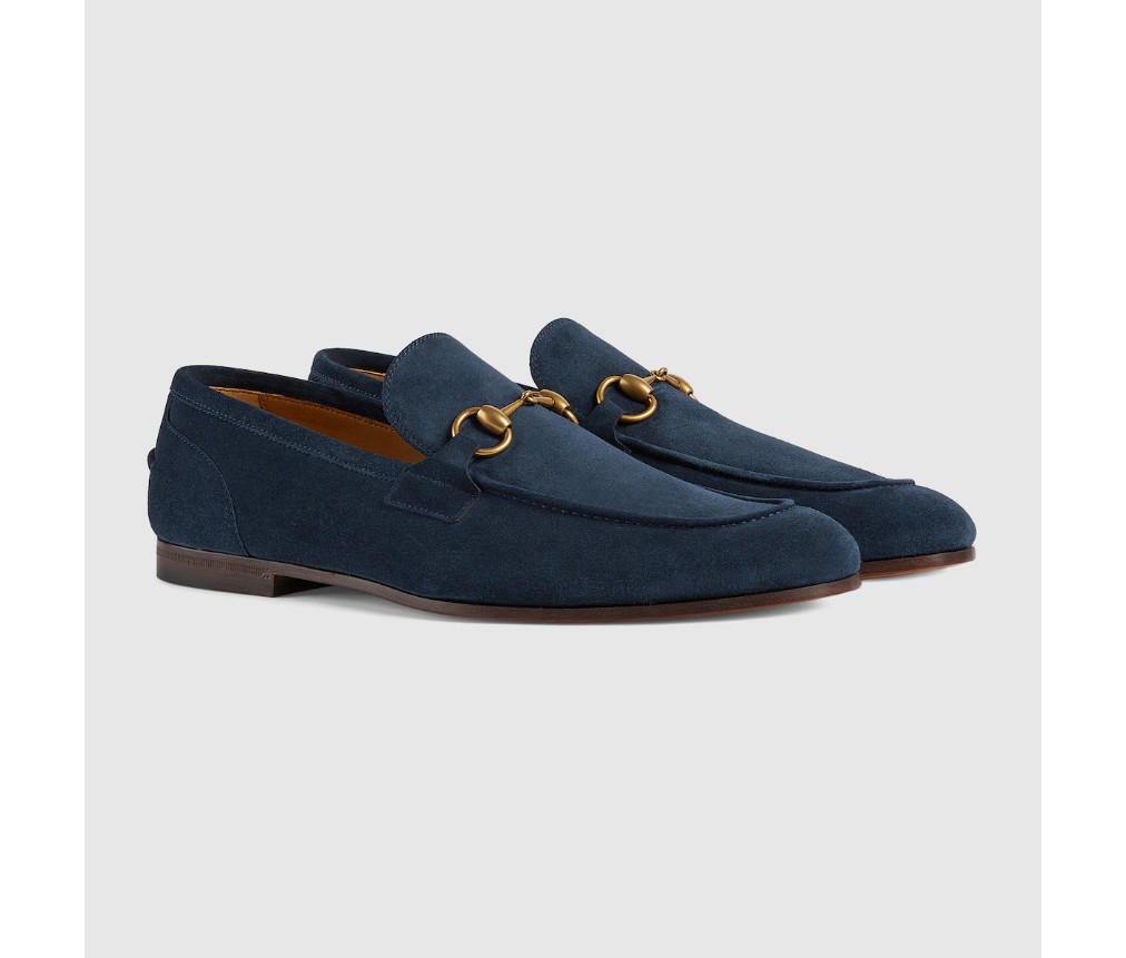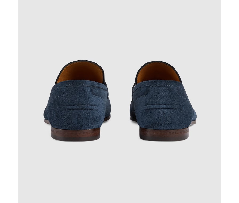 로퍼는 길쭉한 앞부분이 특징인 파란색 스웨이드 소재로 제작되었으며, 구찌의 승마 전통에 대한 오마주인 하우스의 시그니처인 호스빗 디테일로 마감되었습니다.