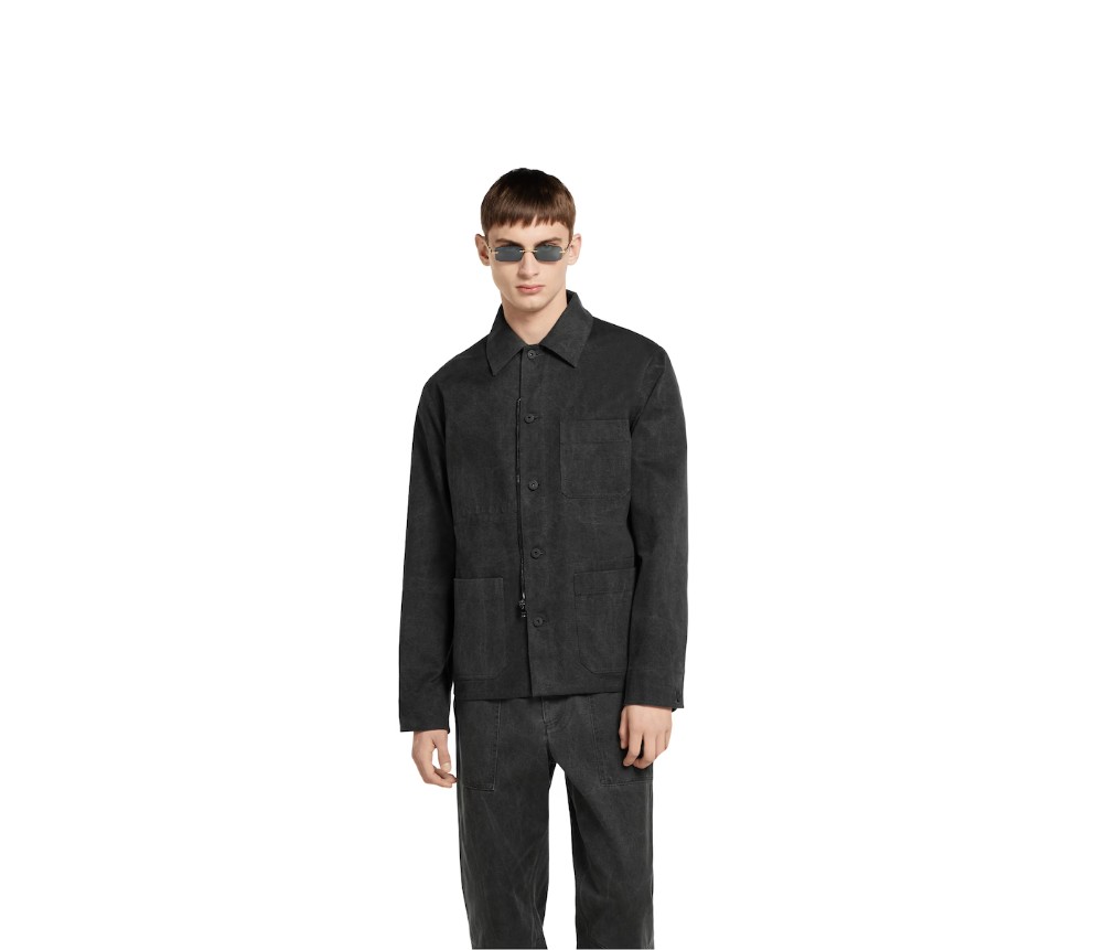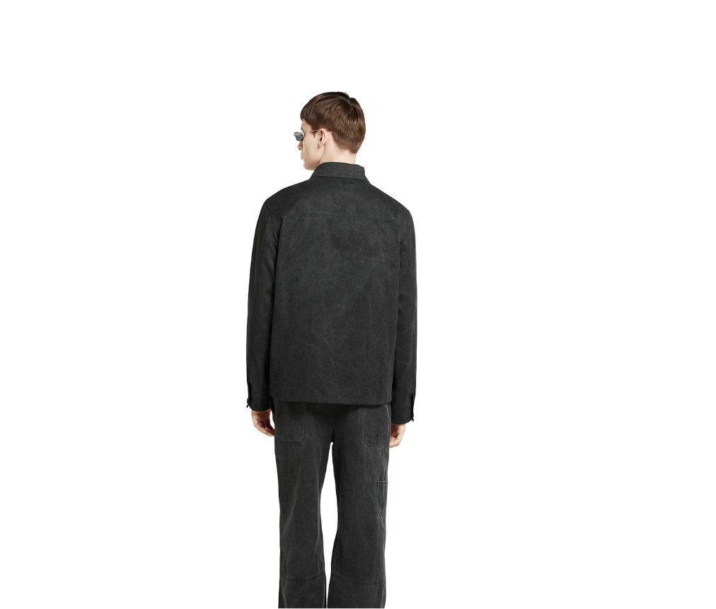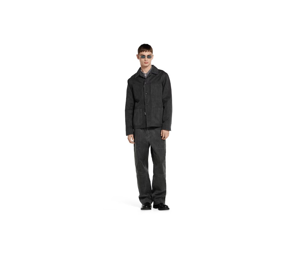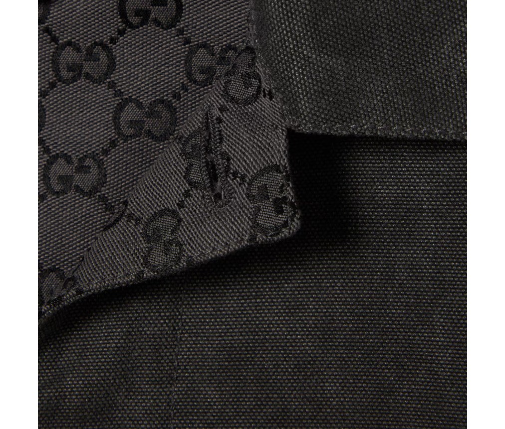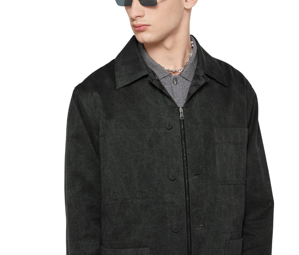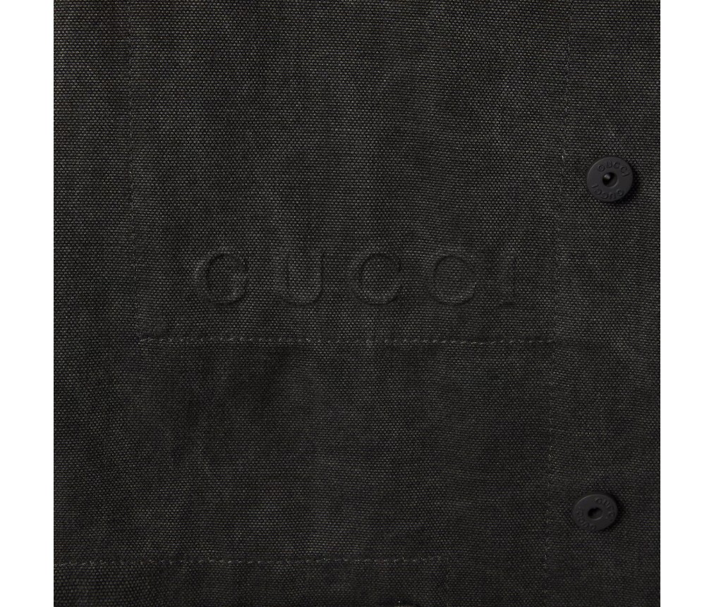 스타일 823401 ZASBD 11892025년 프리폴 컬렉션은 차분한 블랙, 그레이, 그린 톤으로 구성되어 있으며, 섬세한 플로럴 자수, 엠보싱 로고, 그리고 장인정신이 깃든 디테일이 돋보입니다. 다크 그레이 델라베 코튼 캔버스 소재로 제작된 이 재킷은 앞면의 엠보싱 구찌 로고가 특징입니다.