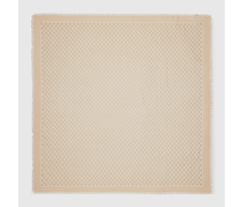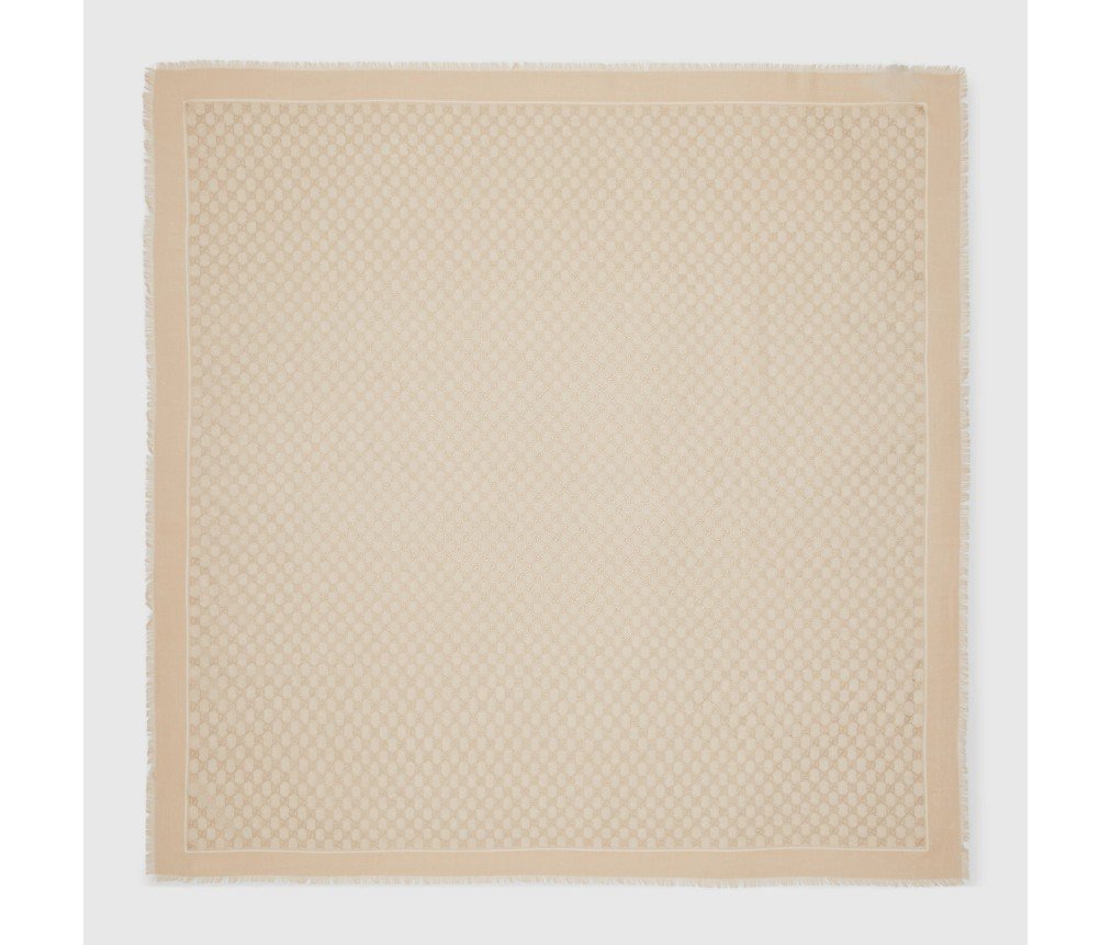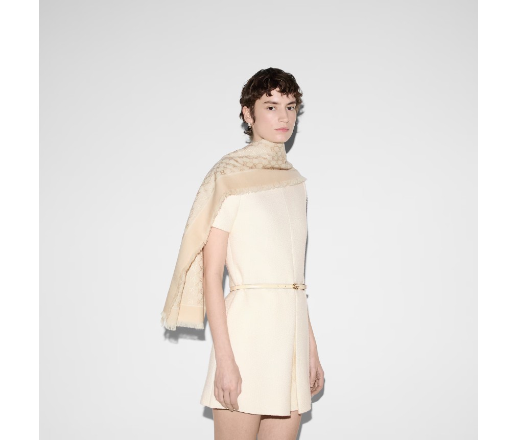 구찌 하우스의 설립자 구찌오 구찌의 이니셜이 실크와 부드러운 액세서리에 번갈아 가며 새겨져 있습니다. 이 화이트 울 숄은 반짝이는 라미네이트 GG 모티프로 장식되어 있으며, 프린지 장식이 전체적인 디자인을 완성합니다.