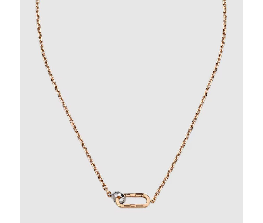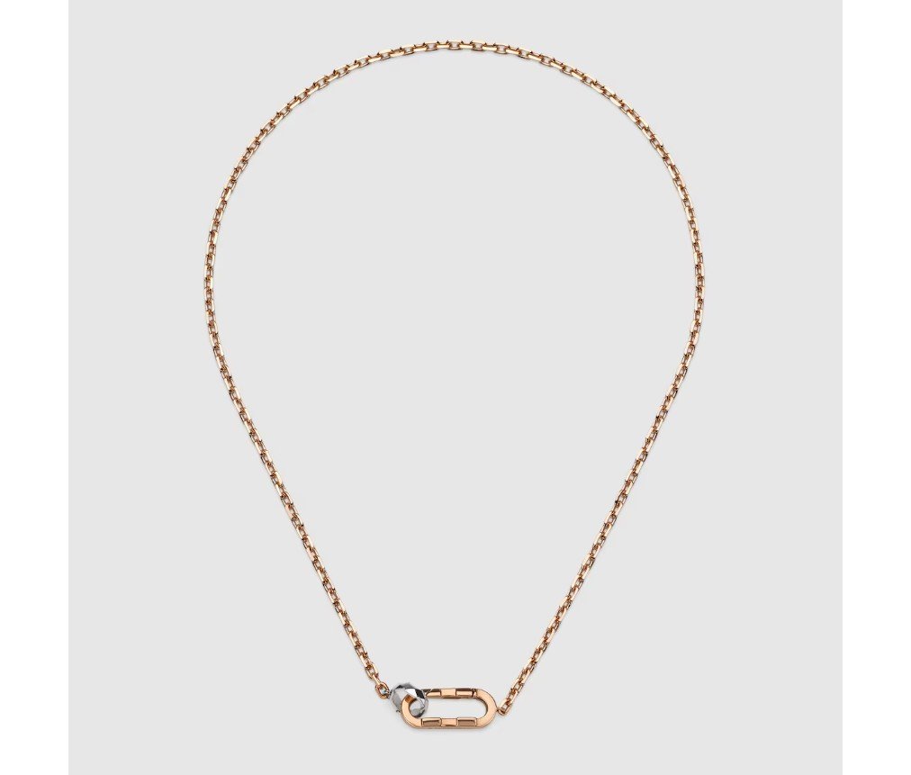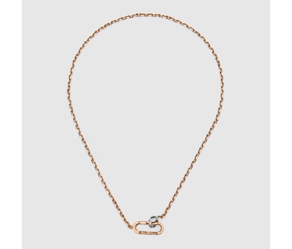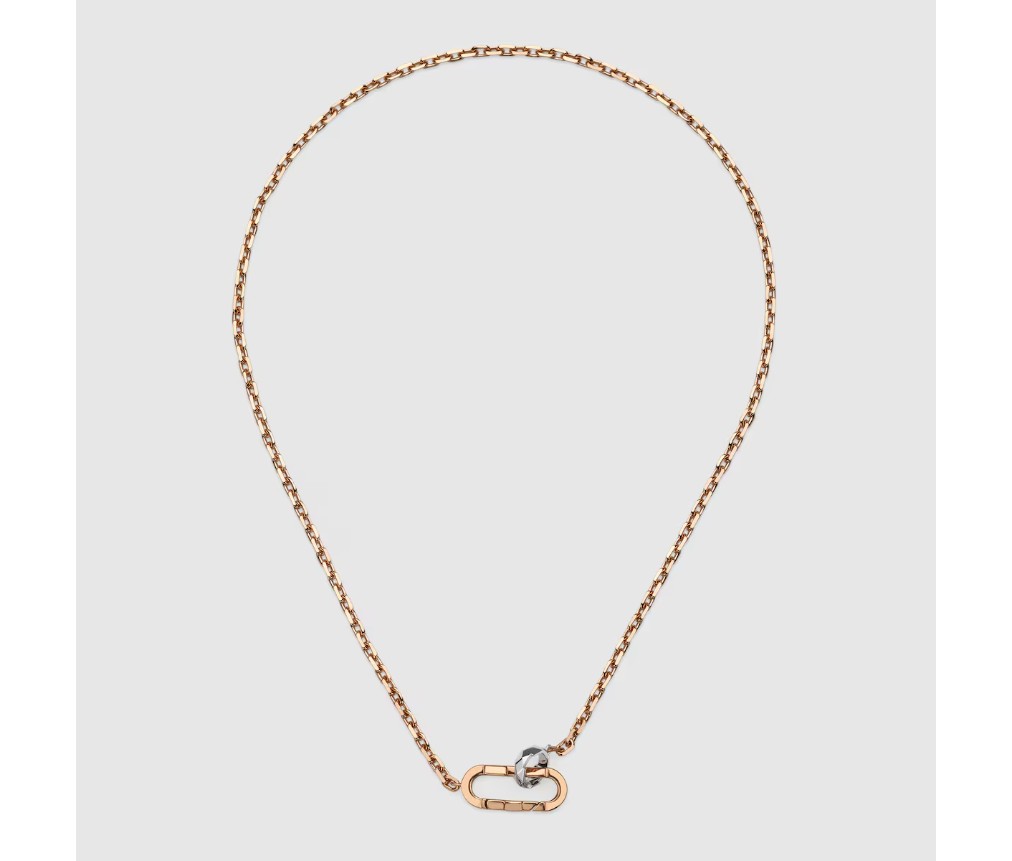 직사각형 링크와 스몰 후프가 맞물린 새로운 잠금장치는 구찌 링크 투 러브 라인의 일부로 선보입니다. 목걸이, 귀걸이, 팔찌의 핵심 요소로 자리 잡은 이 모던한 디자인은 함께라는 콘셉트를 더욱 강조합니다. 섬세한 디테일이 돋보이는 이 잠금장치는 로즈 골드와 화이트 골드 소재의 체인 목걸이와 함께 더욱 빛을 발합니다.