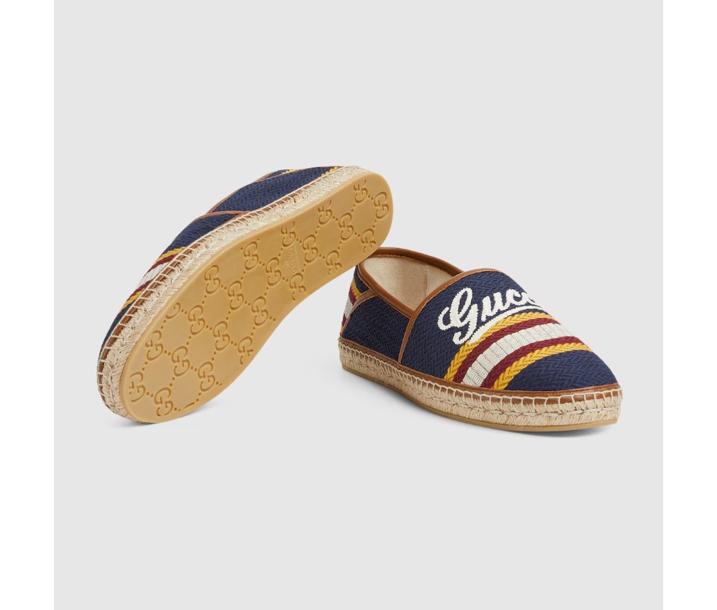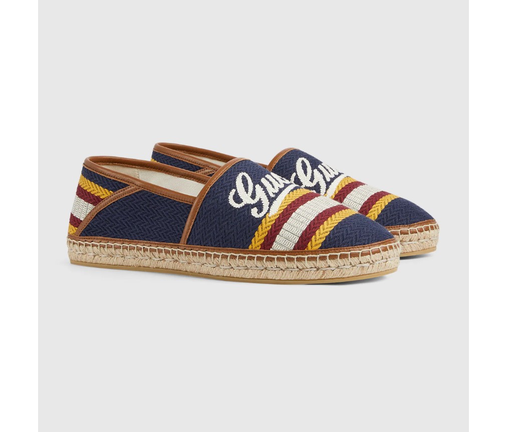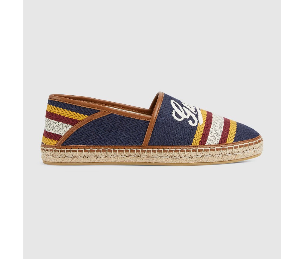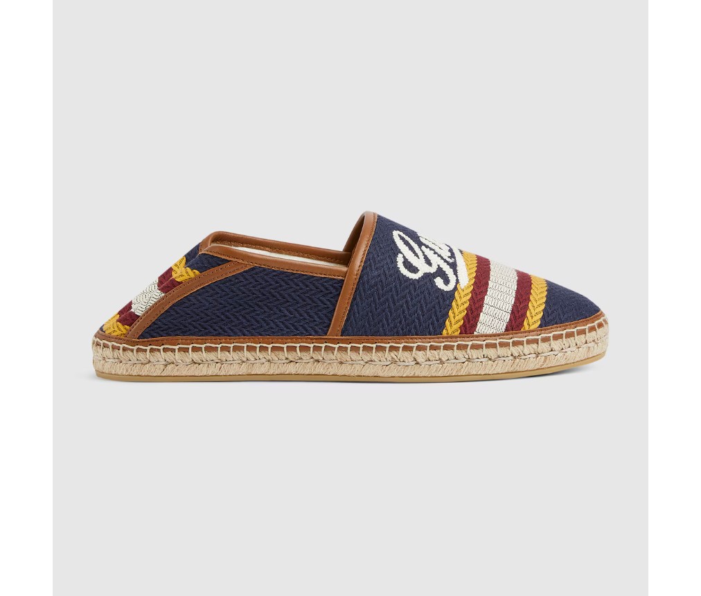 2025 봄/여름 컬렉션에서 선보이는 다양한 남성 슈즈는 생동감 넘치는 컬러 팔레트를 통해 자유와 에너지를 표현합니다. 블루와 멀티컬러 패브릭으로 제작된 이 에스파드리유는 우븐 코드 솔과 구찌 스크립트 자수로 완성되었습니다.