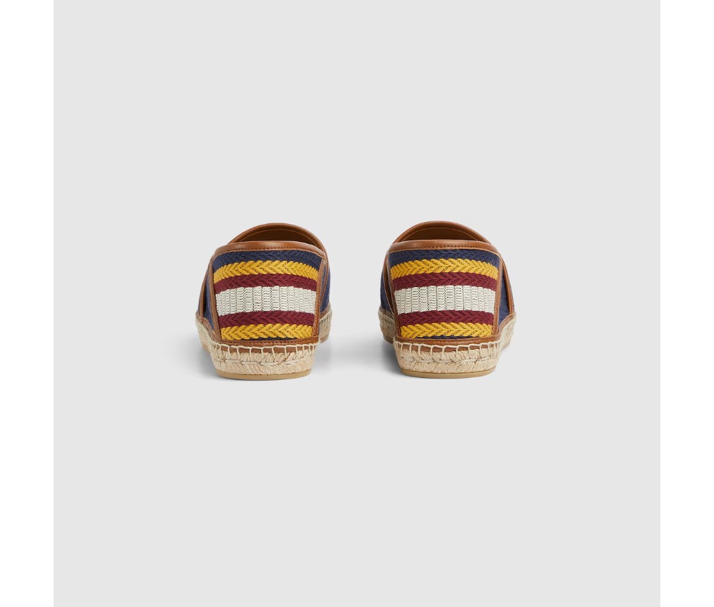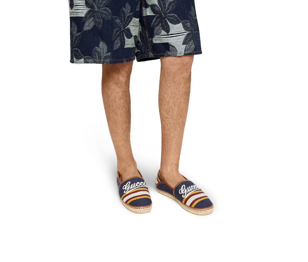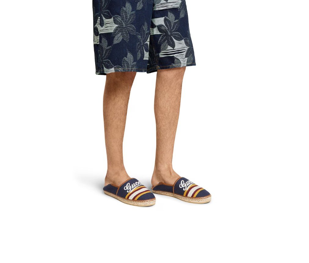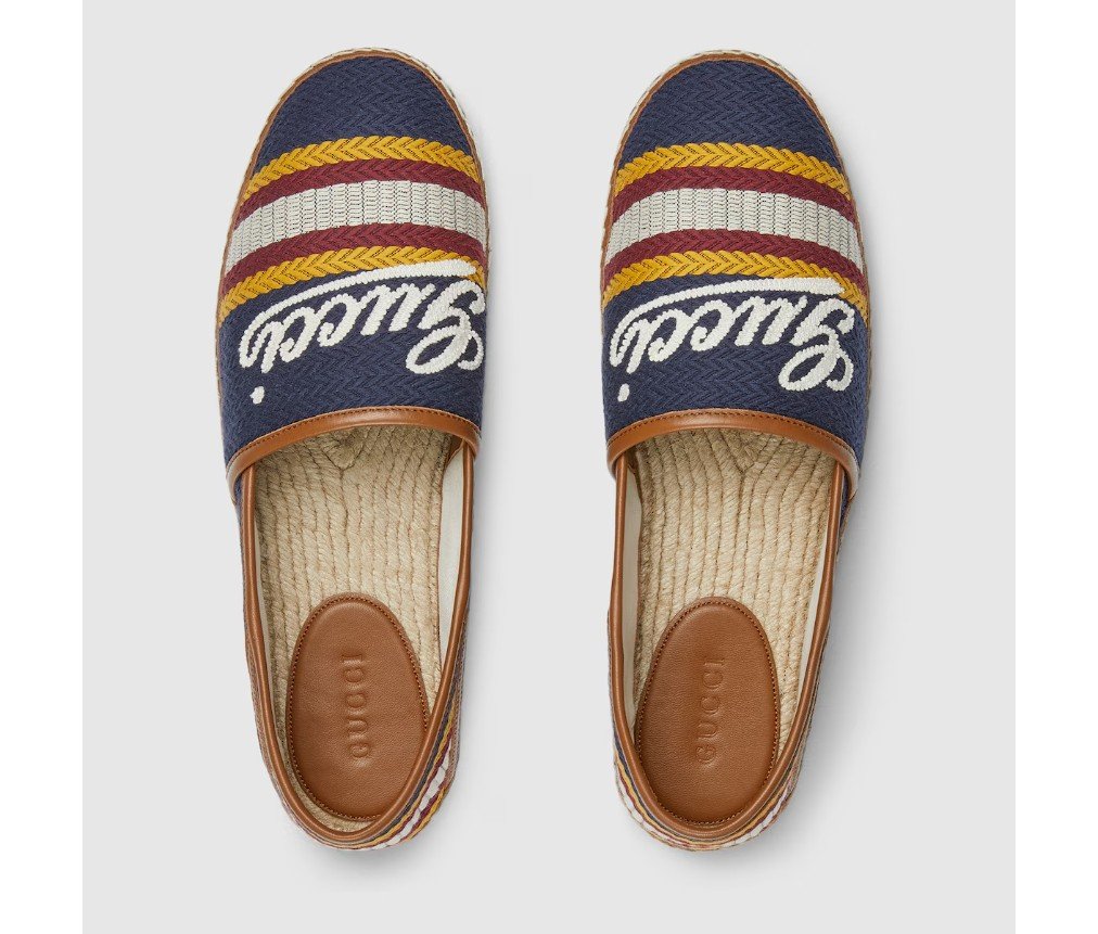 2025 봄/여름 컬렉션에서 선보이는 다양한 남성 슈즈는 생동감 넘치는 컬러 팔레트를 통해 자유와 에너지를 표현합니다. 블루와 멀티컬러 패브릭으로 제작된 이 에스파드리유는 우븐 코드 솔과 구찌 스크립트 자수로 완성되었습니다.