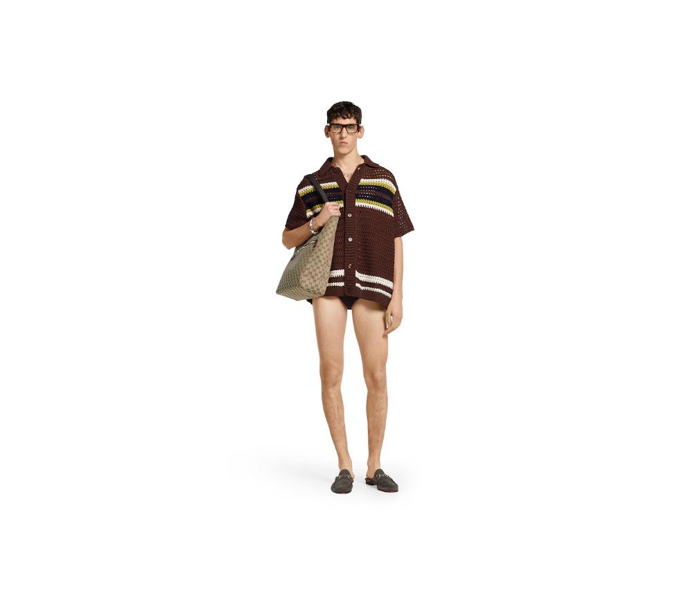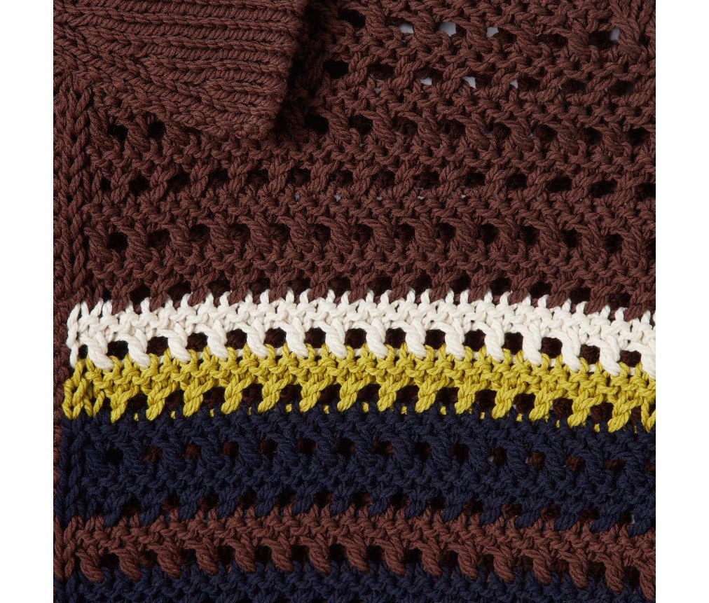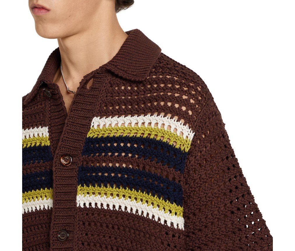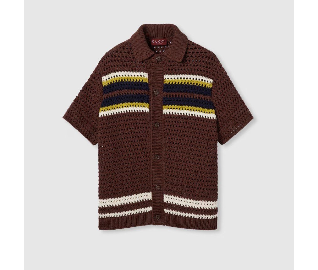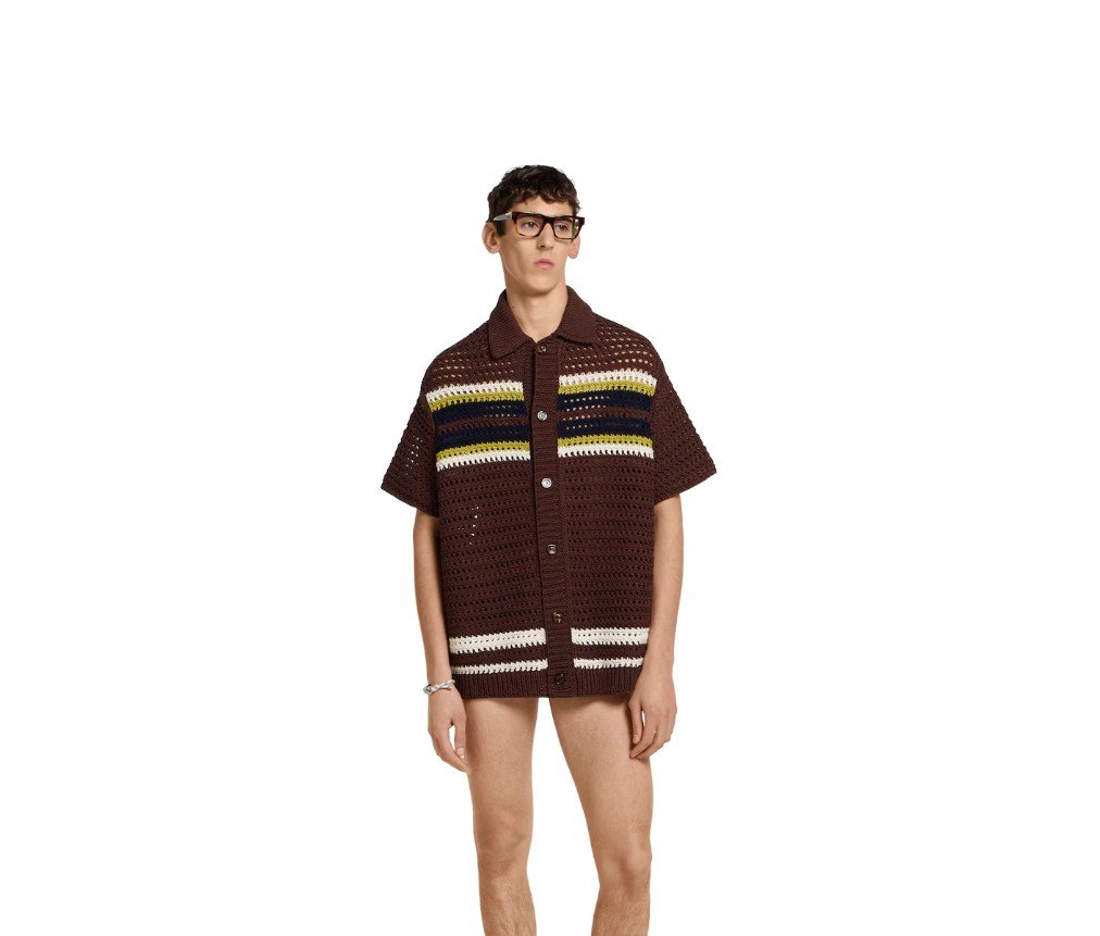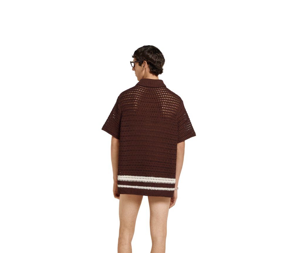 2025 프리폴 컬렉션은 호스빗 프린트 실크 세퍼레이트부터 크로셰 니트 셔츠까지, 다양한 텍스처, 모티프, 컬러 조합으로 데일리룩을 한층 더 업그레이드합니다. 브라운 크로셰 코튼 니트 소재로 제작된 이 폴로 셔츠는 다채로운 스트라이프 패턴이 특징입니다.