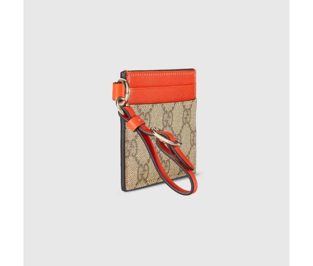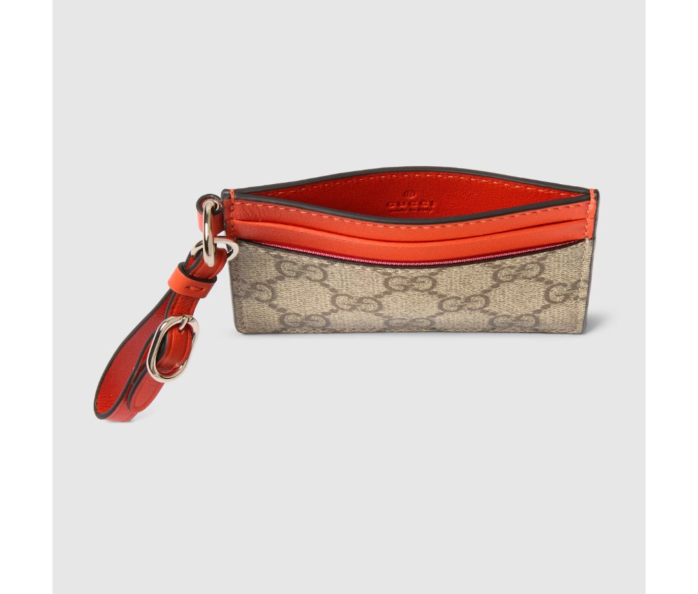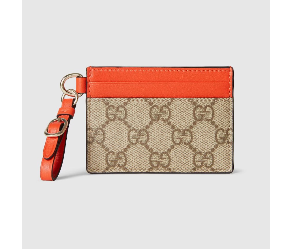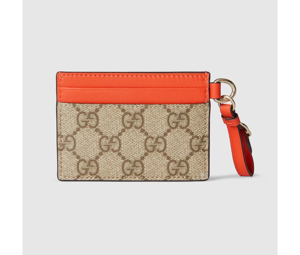 GG 엠블럼 컬렉션은 따뜻한 날씨에 어울리는 생동감 넘치는 가죽 트리밍으로 구성되어 있습니다. 이 카드 케이스는 GG 모노그램 코팅 원단과 대비되는 가죽 트리밍으로 제작되었습니다.