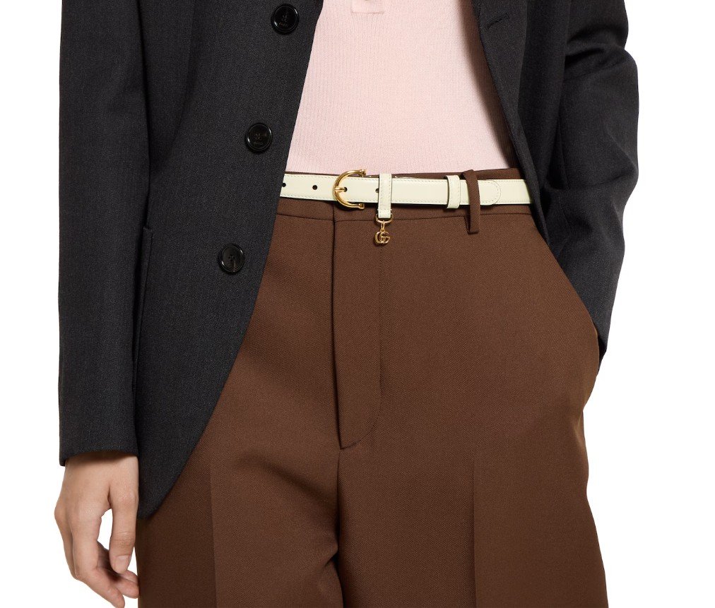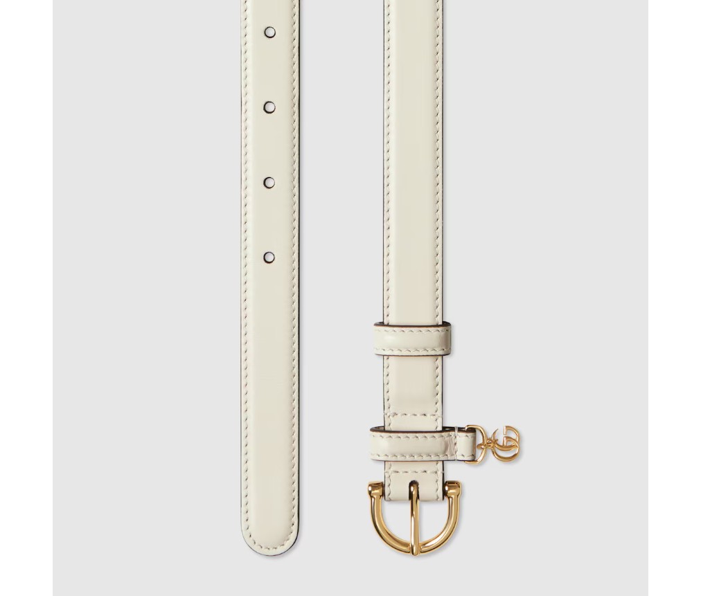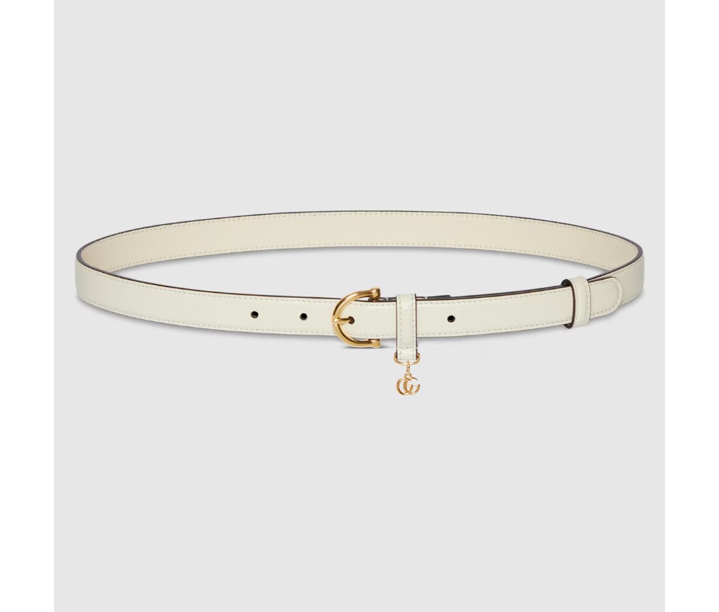 2025 가을/겨울 컬렉션에서 선보이는 이 얇은 벨트는 더블 G 참이 달린 스터럽 버클로 구찌의 헤리티지를 구현합니다. 아이보리 가죽으로 제작된 이 디자인은 우아하면서도 자연스러운 아름다움을 선사합니다.