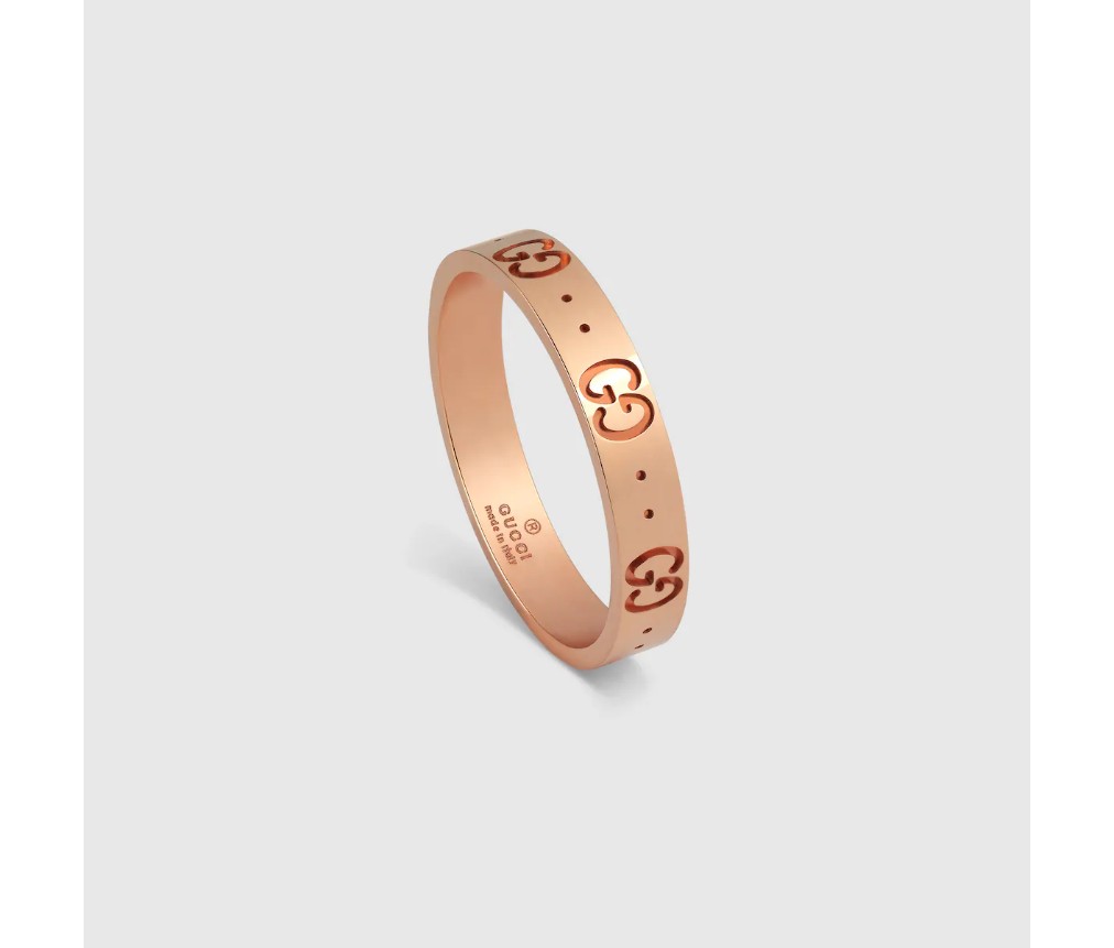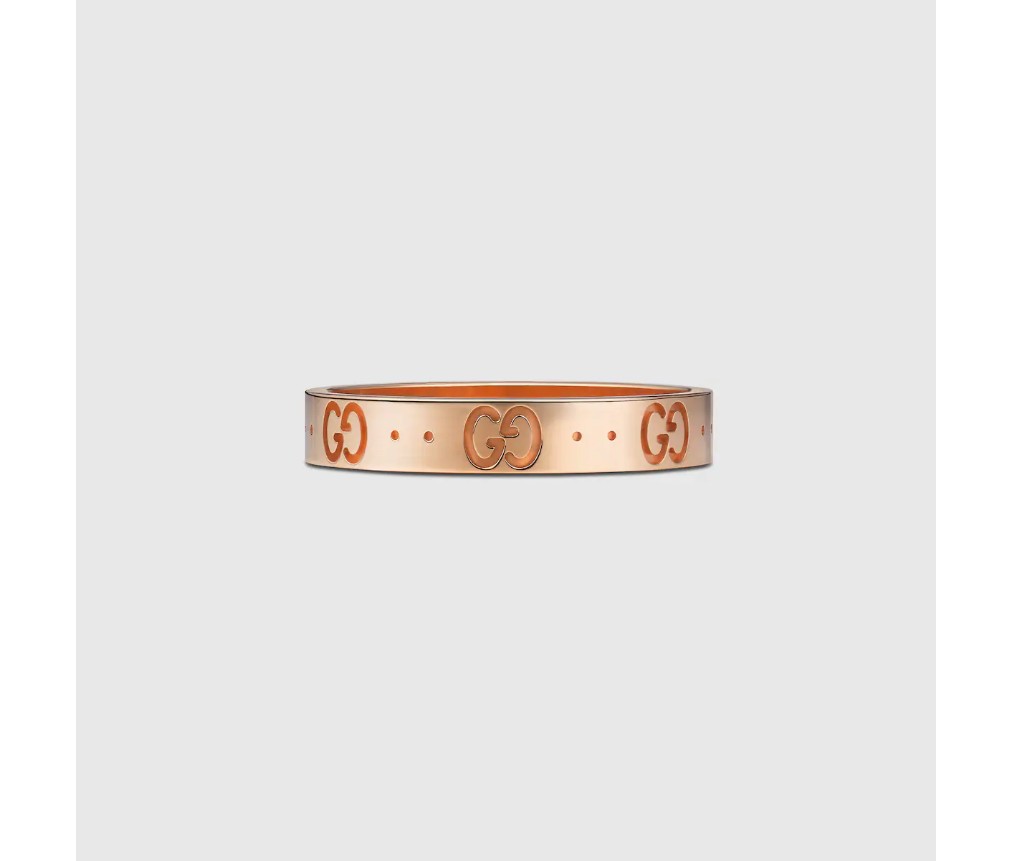 구찌오 구찌의 이니셜을 상징하는 상징적인 GG 패턴이 18k 로즈 골드로 제작된 얇은 아이콘 링에 새겨져 있습니다.