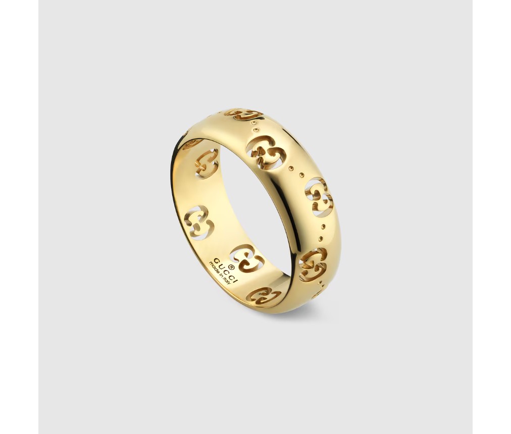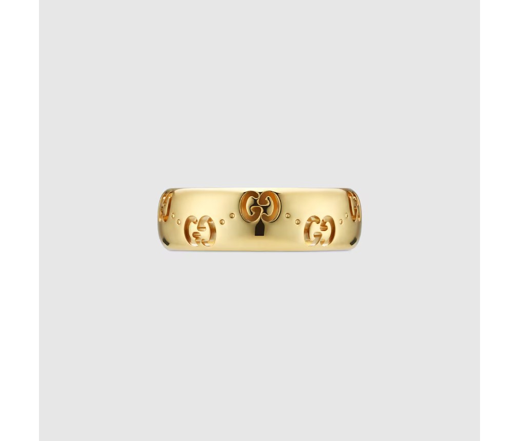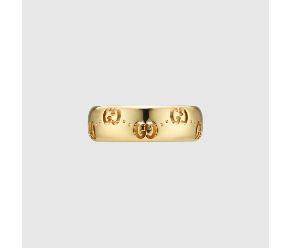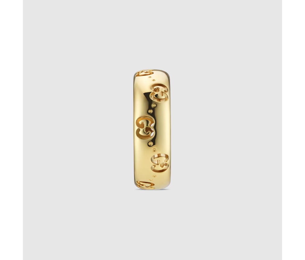 2024 가을/겨울 컬렉션을 위해 아이콘 주얼리 컬렉션은 둥근 실루엣에 새로운 GG 컷아웃 모티프를 선보입니다. 18k 옐로 골드 소재의 이 얇은 링은 하우스의 시그니처 모티프가 장식되어 있습니다.