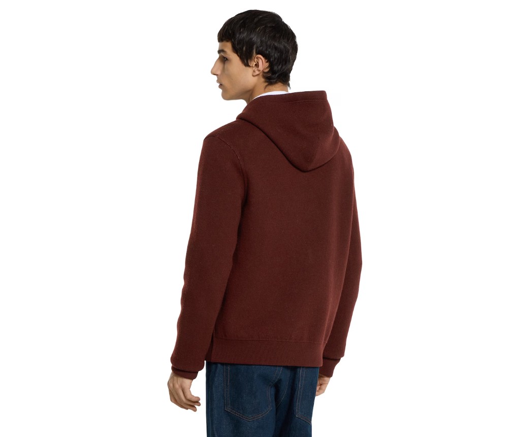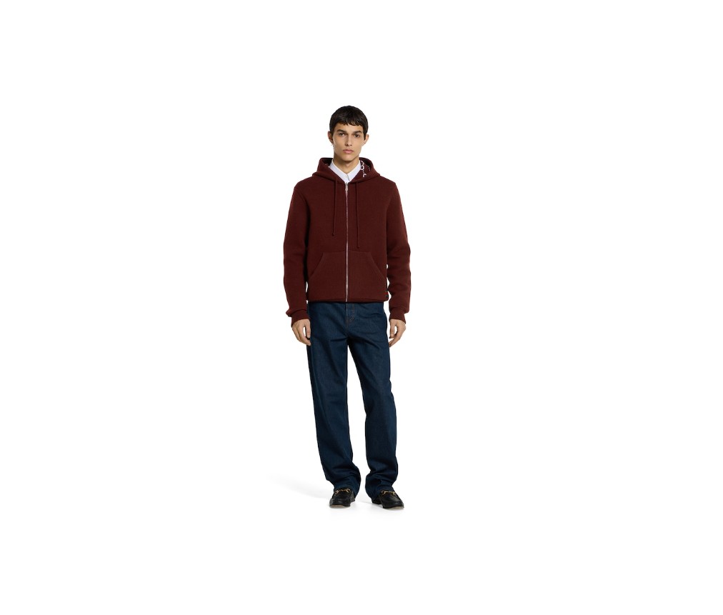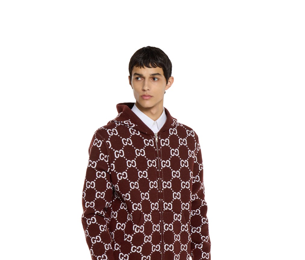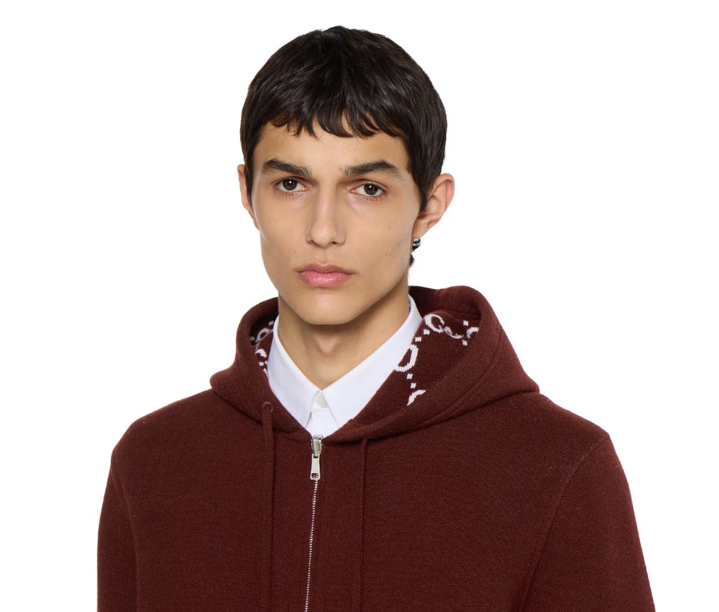 2025 프리폴 컬렉션은 봄버 재킷과 가죽 재킷 등 도시적인 필수 아웃웨어에 세련미와 고급스러운 소재를 더해 세련된 감각을 더했습니다. 버건디 울 니트 소재로 제작된 이 지퍼 재킷은 뒷면이 GG 울 자카드로 되어 있으며, 시그니처 웹(Web) 디테일로 마감되었습니다.