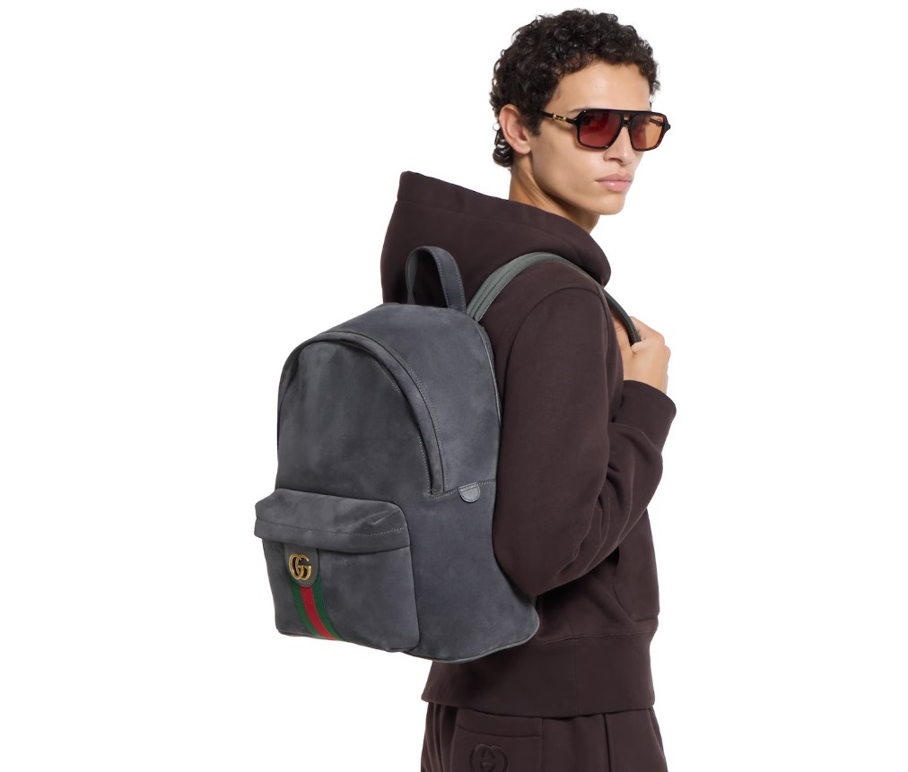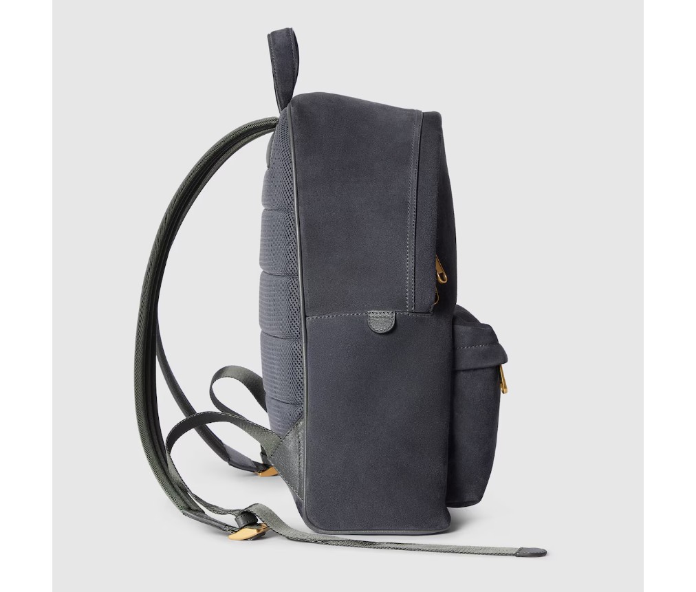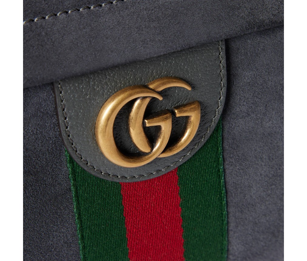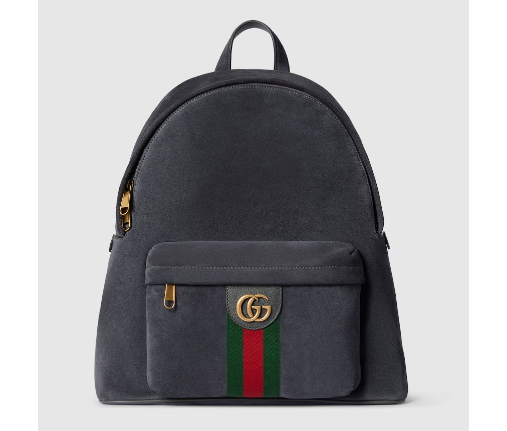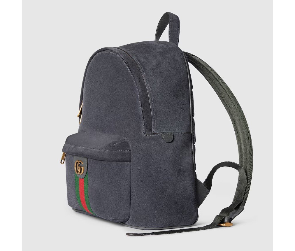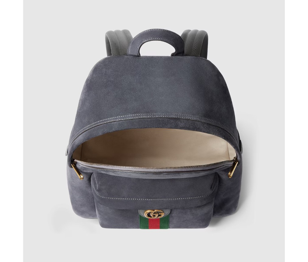 스타일 834466 AAE1E 11452025 가을/겨울 컬렉션에서 오피디아(OPHIDIA) 컬렉션은 골드 톤 마감의 웹 스트라이프와 더블 G 엠블럼을 선보입니다. 이 미디엄 백팩은 회색의 가볍고 부드러운 스웨이드 소재로 제작되었으며, 내부에는 같은 톤의 코튼 리넨 안감이 사용되었습니다.