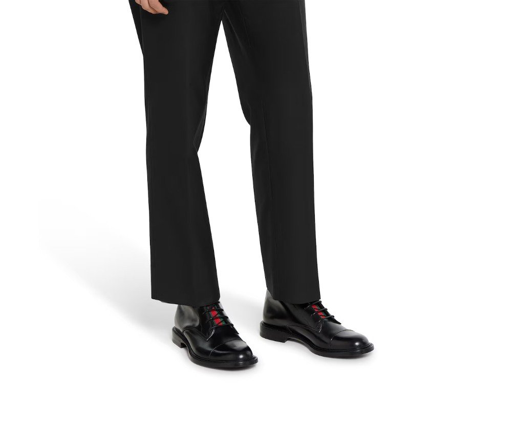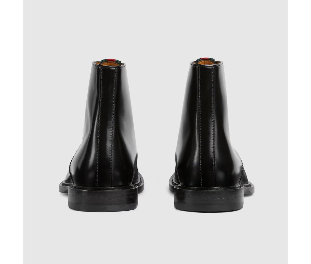 스타일 838133 AAEZI 1062이 남성용 앵클 부츠는 광택 있는 검은색 가죽으로 제작되었습니다. 세련되고 우아한 소재가 유선형 실루엣을 더욱 돋보이게 합니다. 시그니처인 녹색과 빨간색 웹(Web)은 브랜드의 독특한 상징으로, 이 디자인에 섬세한 터치를 더합니다.
