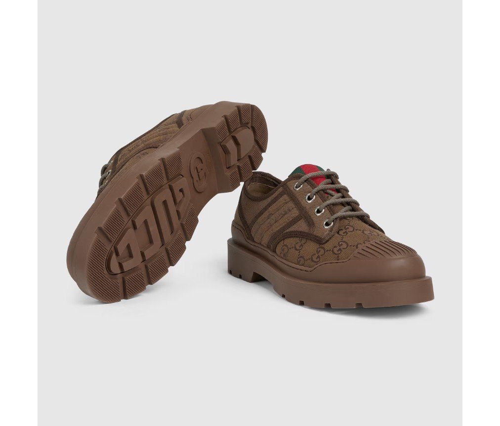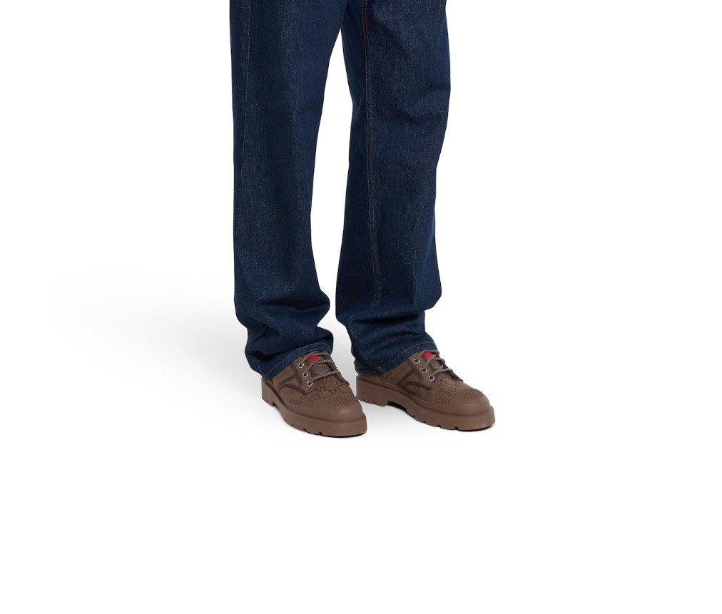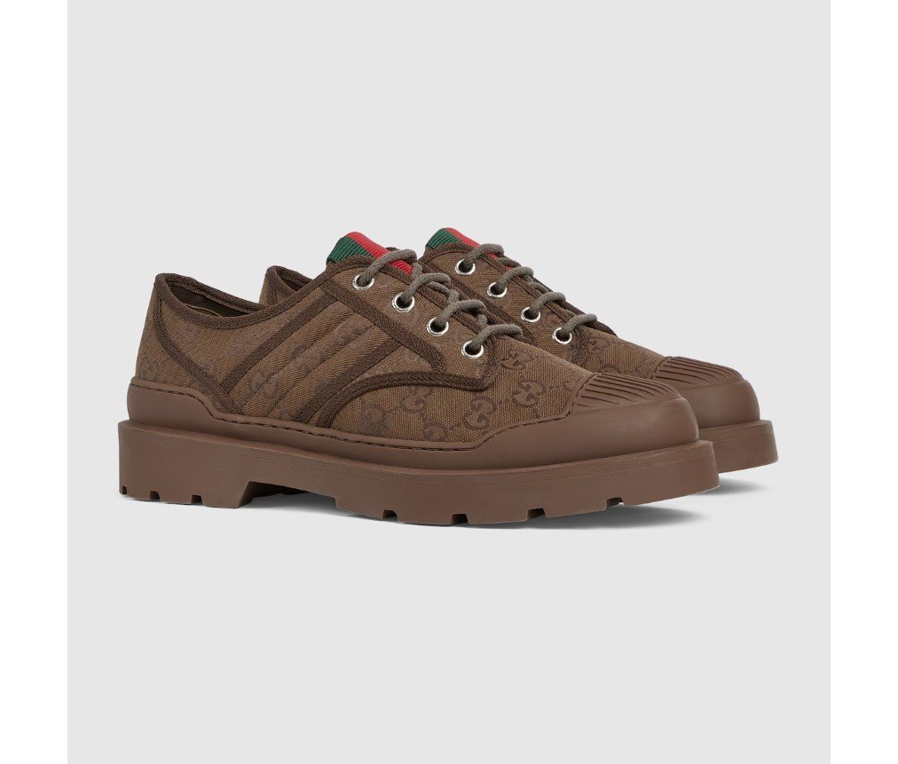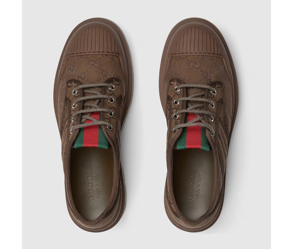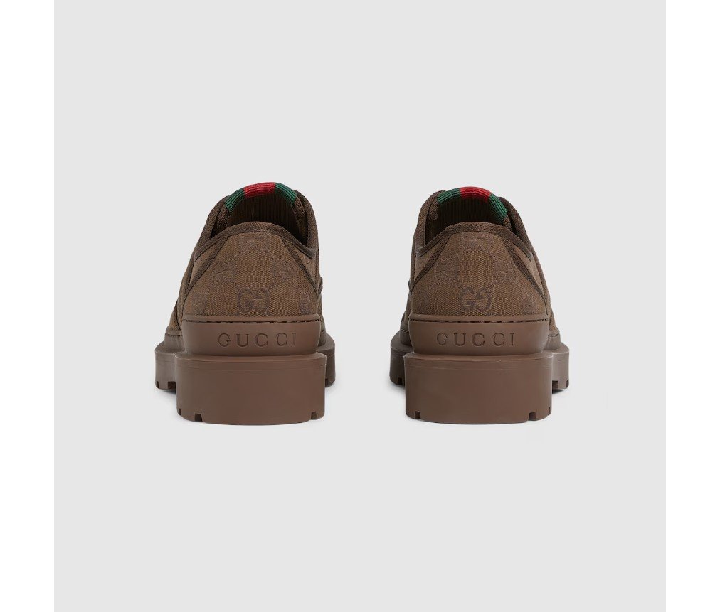 2025 가을/겨울 컬렉션에서 선보이는 그린과 레드 웹(Web) 패턴은 GG 캔버스 소재의 남성용 레이스업 슈즈를 더욱 돋보이게 합니다. 시그니처 모티프는 하우스의 역사를 떠올리게 하며, 간결한 디자인의 장인 정신을 강조합니다.
