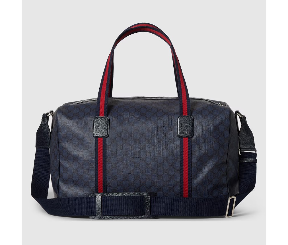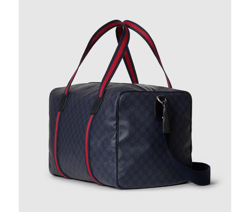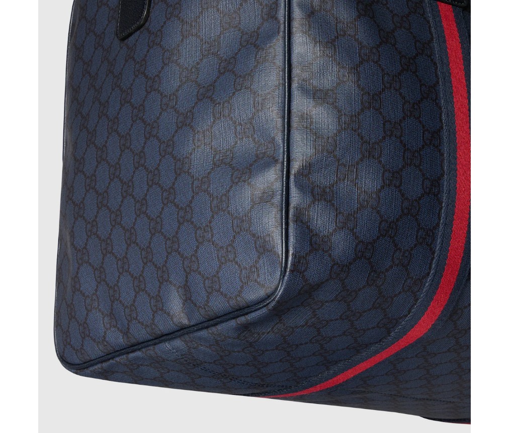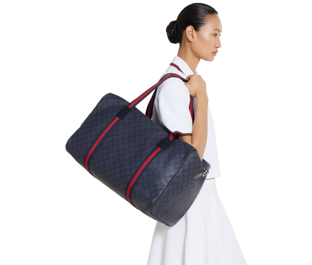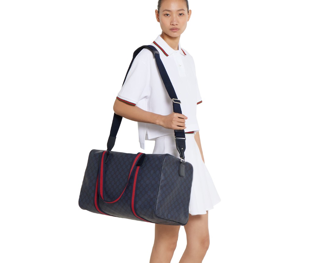 더욱 부드러운 GG 수프림 소재가 구찌 테니스 컬렉션에 새로운 다크 블루 컬러를 더했습니다. 이 더플 백은 소재 변형으로 출시되었으며, 블루와 레드 웹 스트라이프와 다크 블루 가죽 트리밍으로 더욱 풍성해졌습니다.