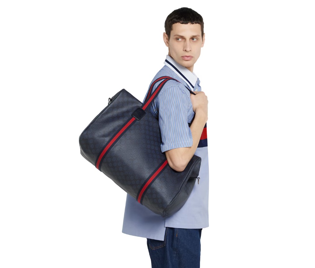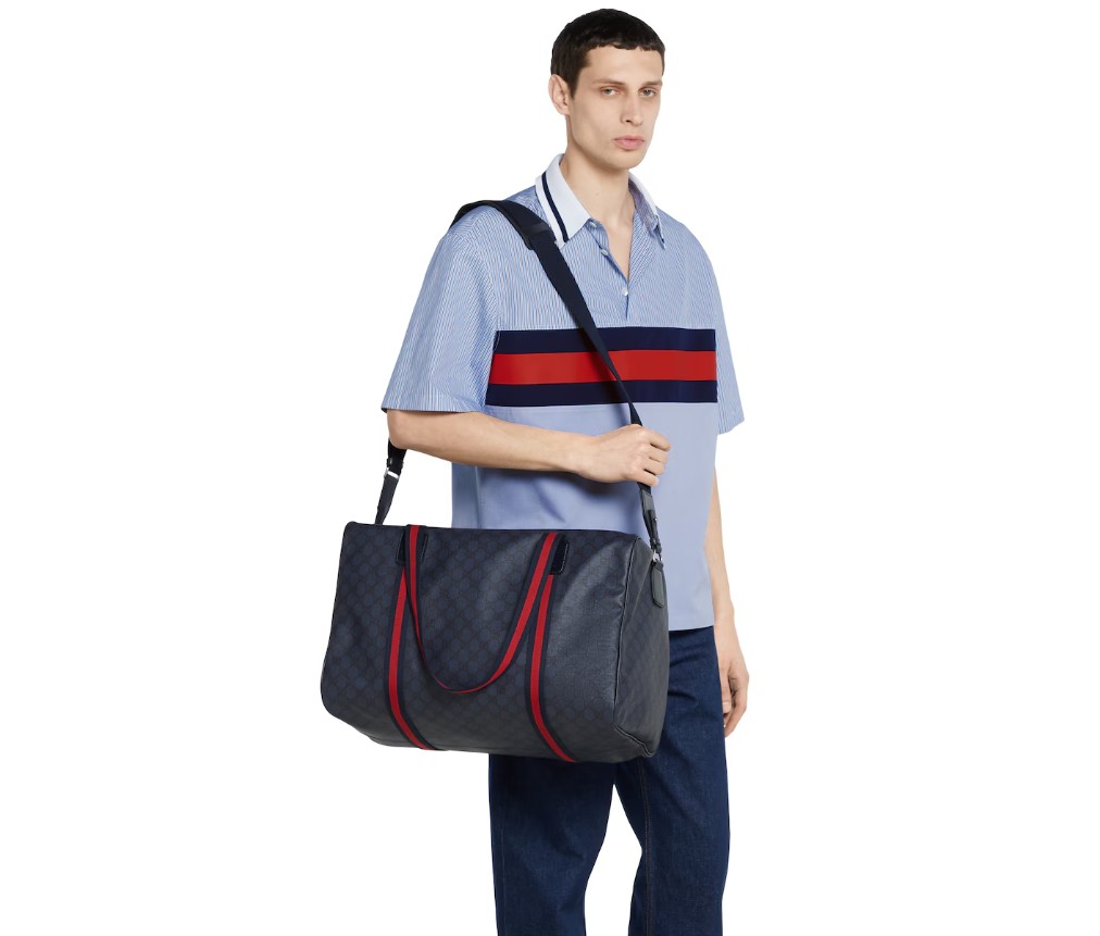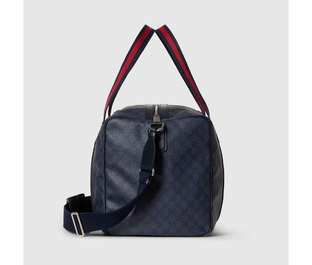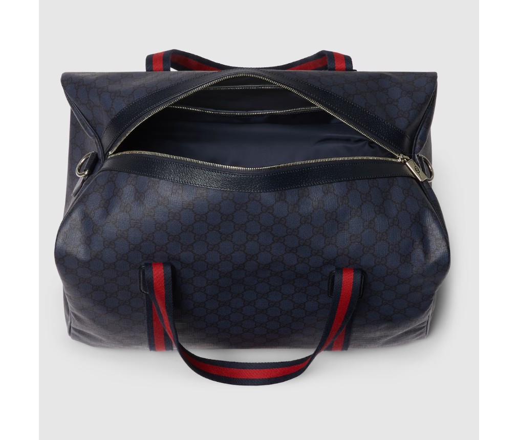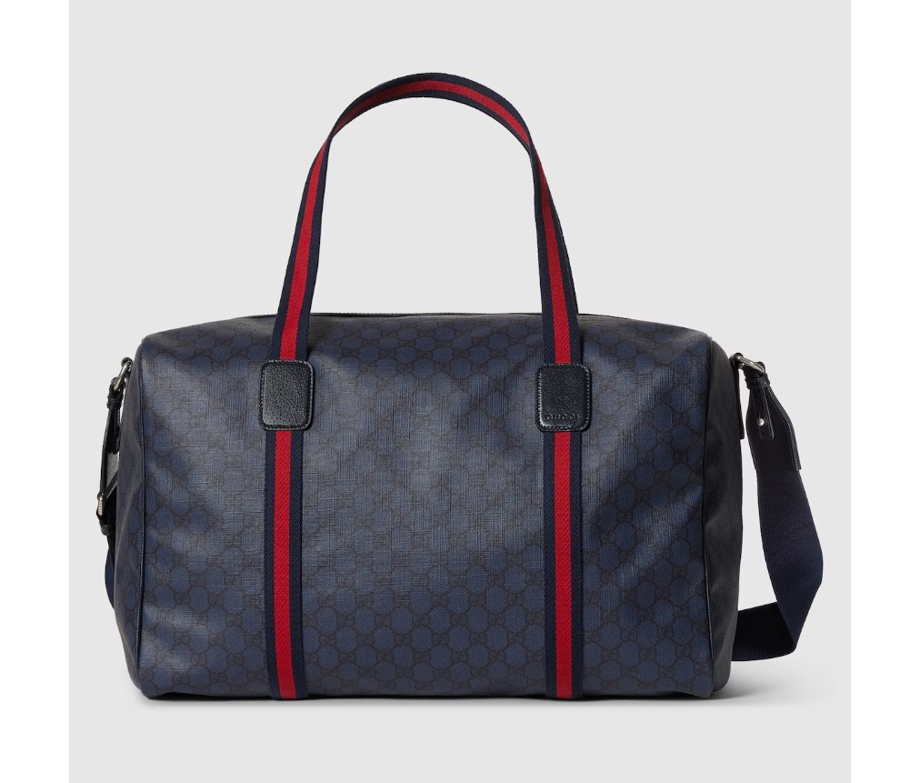 더욱 부드러운 GG 수프림 소재가 구찌 테니스 컬렉션에 새로운 다크 블루 컬러를 더했습니다. 이 더플 백은 소재 변형으로 출시되었으며, 블루와 레드 웹 스트라이프와 다크 블루 가죽 트리밍으로 더욱 풍성해졌습니다.