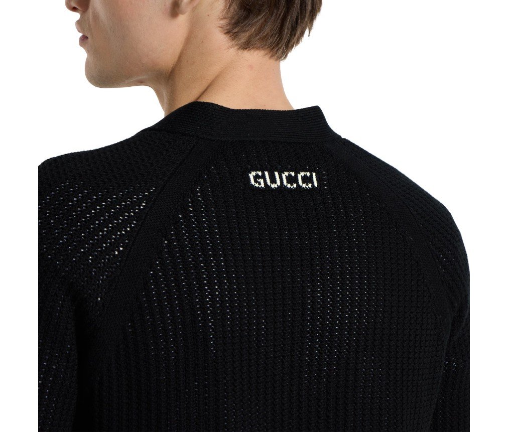 스타일 788009 XKD15 10602025 프리폴 컬렉션은 데이웨어부터 이브닝 웨어까지, 상징적인 디테일과 함께 필수적인 실루엣을 강조합니다. 이 카디건은 블랙 코튼 니트 소재로 제작되었으며, 구찌 인타시아 장식이 특징입니다.