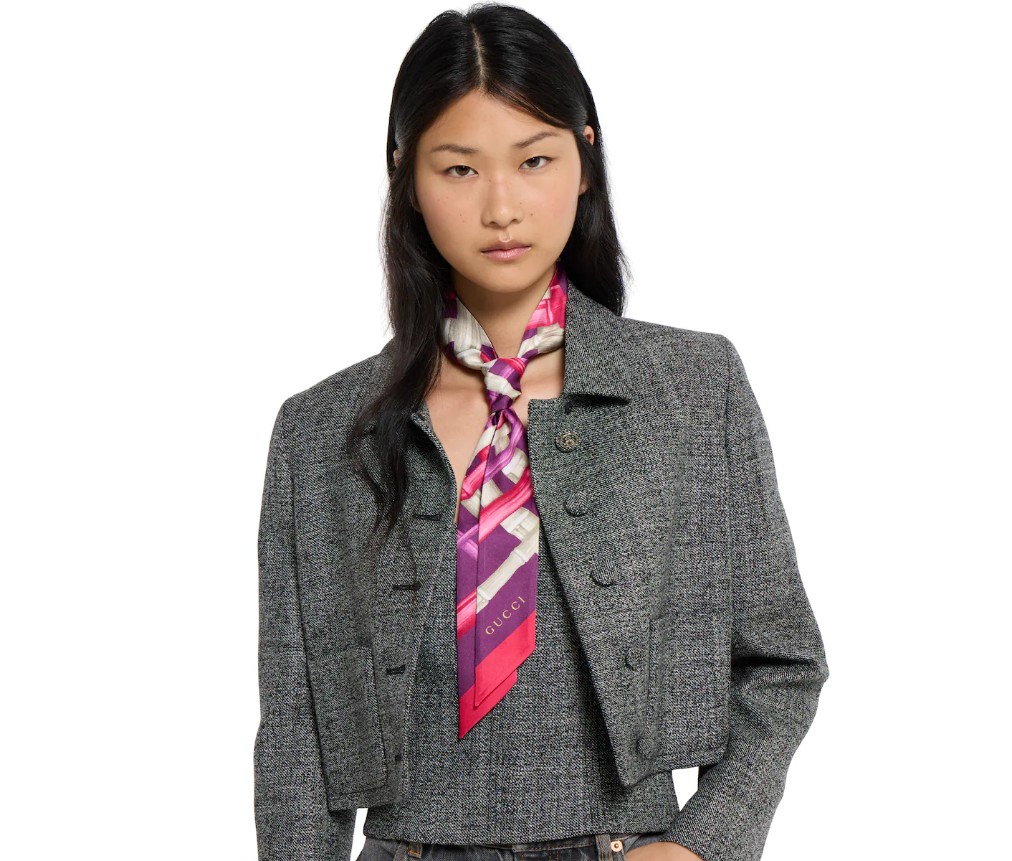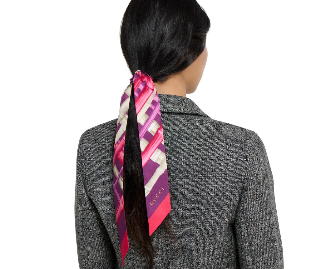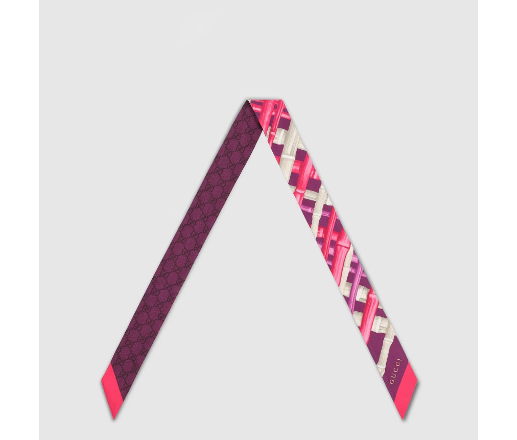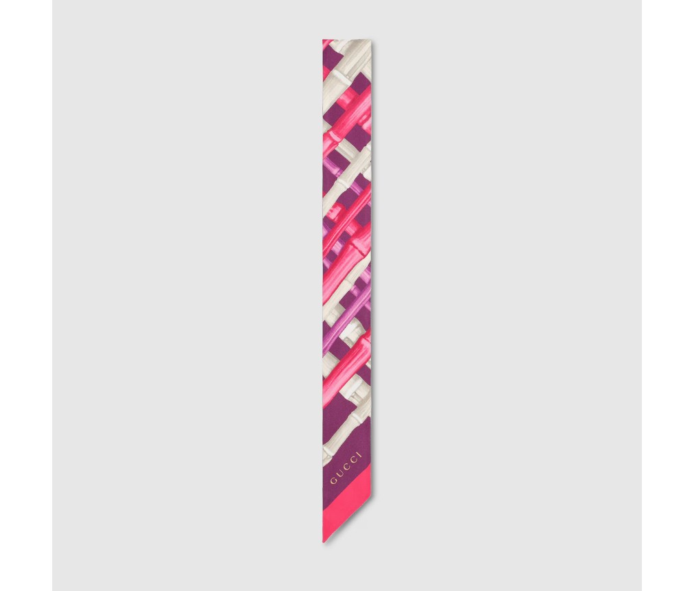 2026 크루즈 여성 실크 액세서리 컬렉션은 혁신적인 프린트로 아카이브 모티프를 재해석했습니다. 실크 트윌 소재로 제작된 이 리본은 전면 GG 대나무 프린트를 드러냅니다.