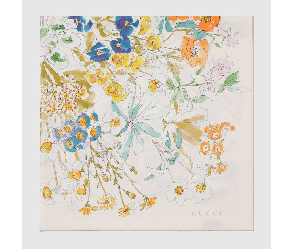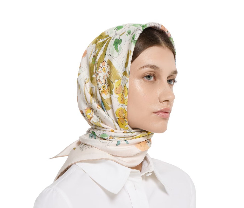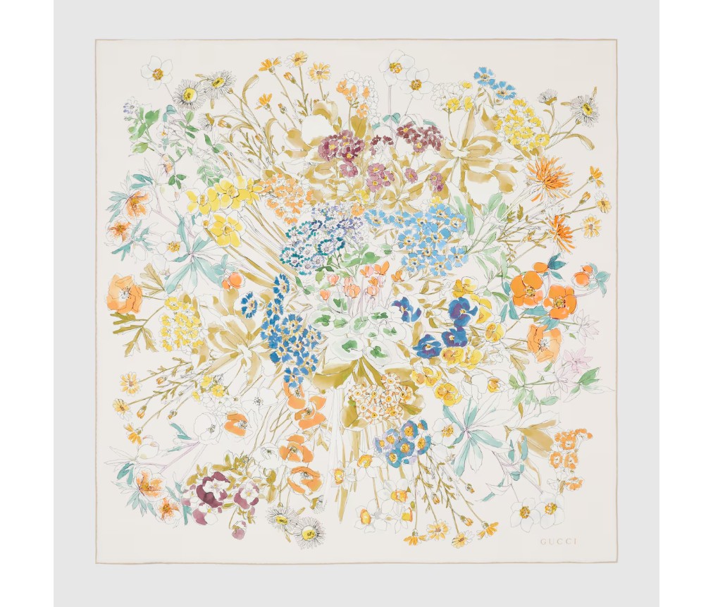 2025 프리폴 컬렉션의 일부로 선보이는 이 카레는 실크 트윌 소재로 제작되었으며, 전면에 플로럴 프린트가 특징입니다. 생동감 넘치는 모티프는 꽃다발을 표현하여 컬렉션의 색조와 어울리는 수채화 효과를 자아냅니다.