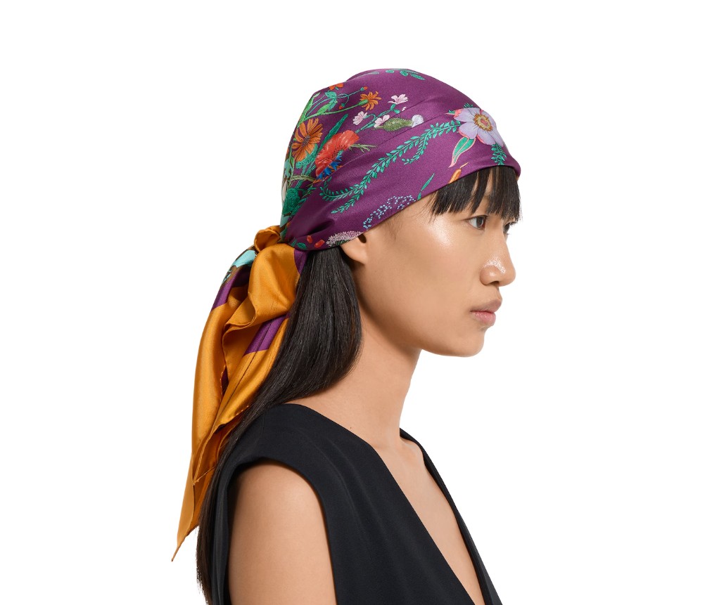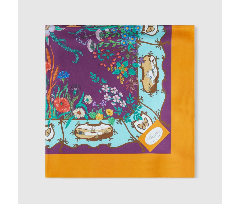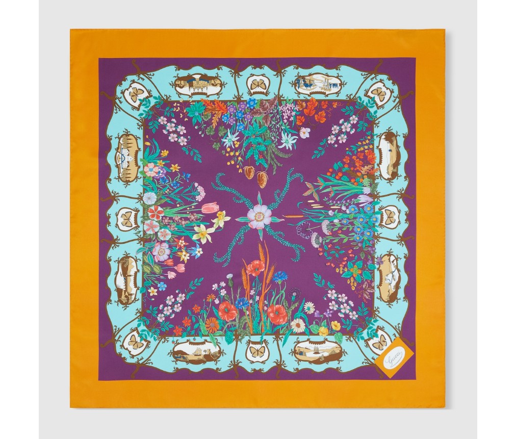 2025년 가을/겨울 컬렉션에서 이 실크 트윌 카레는 전면에 구찌 이탈리아 정원 프린트가 특징입니다.