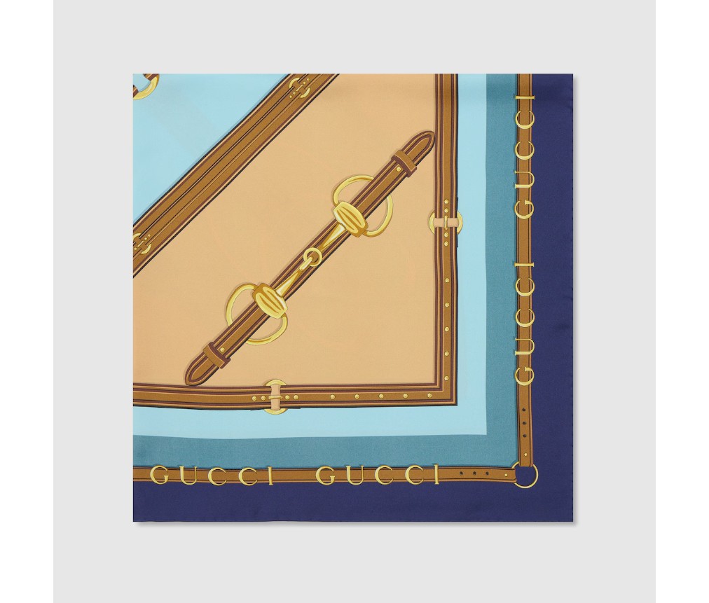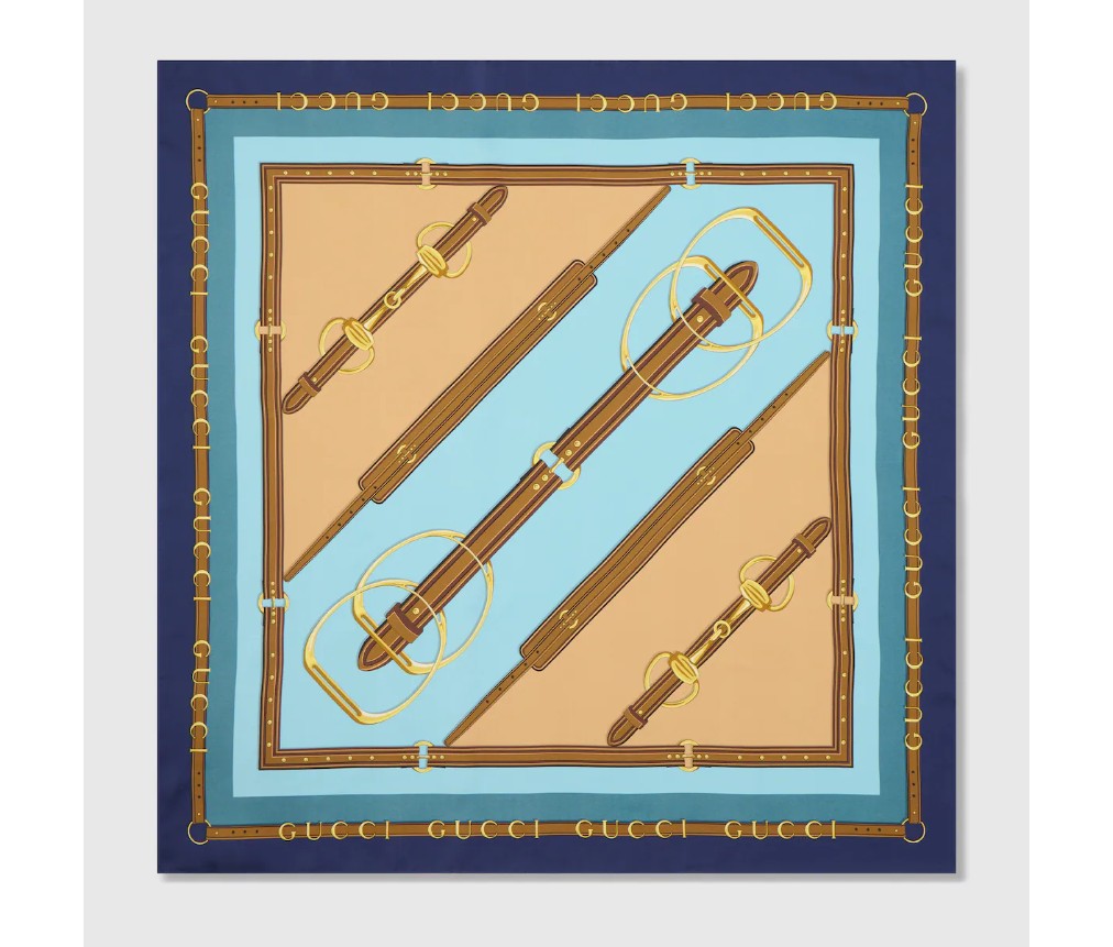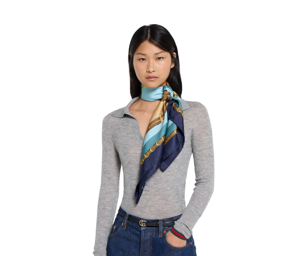 2025년 가을/겨울 컬렉션에서 구찌는 브랜드의 뿌리를 기념하는데, 여기에는 구찌 승마 프린트가 전면에 프린트된 실크 카레도 포함됩니다.
