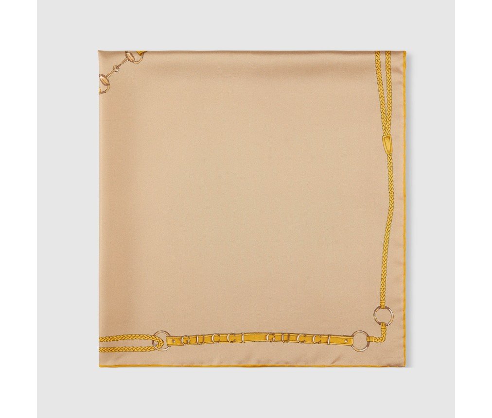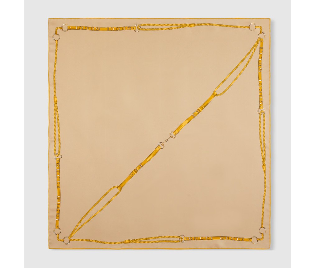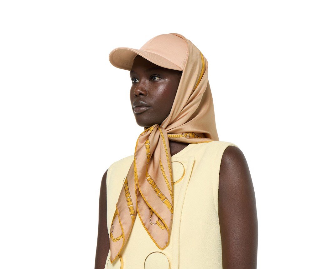 2025년 가을/겨울 컬렉션에서 구찌는 풍부한 승마 유산을 기념하는데, 여기에는 구찌 벨트와 호스빗 프린트가 들어간 실크 카레가 포함됩니다.