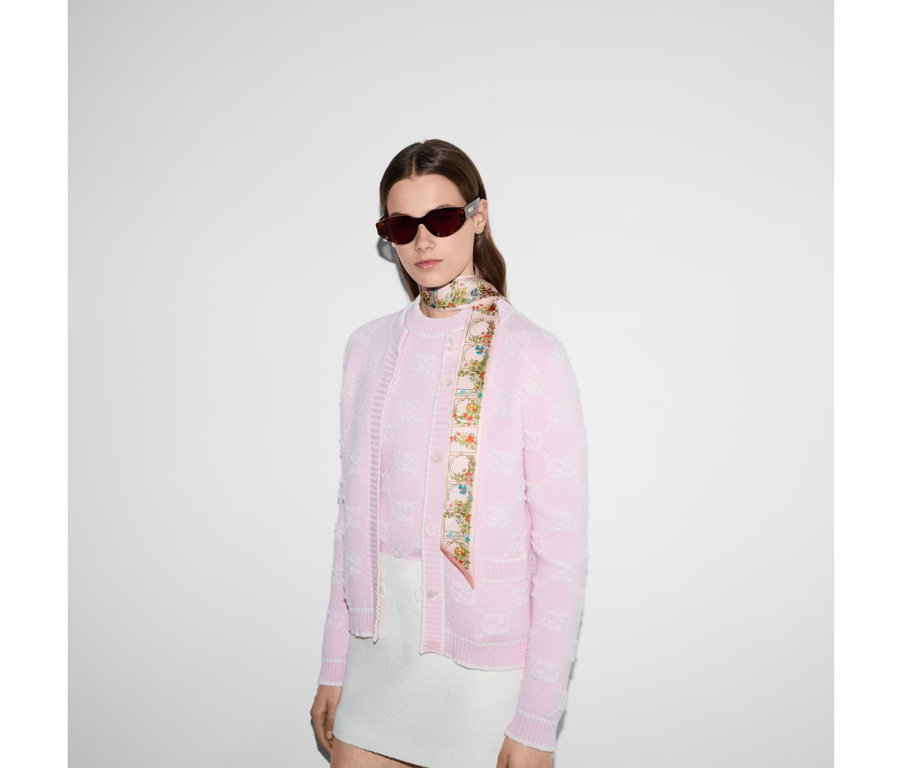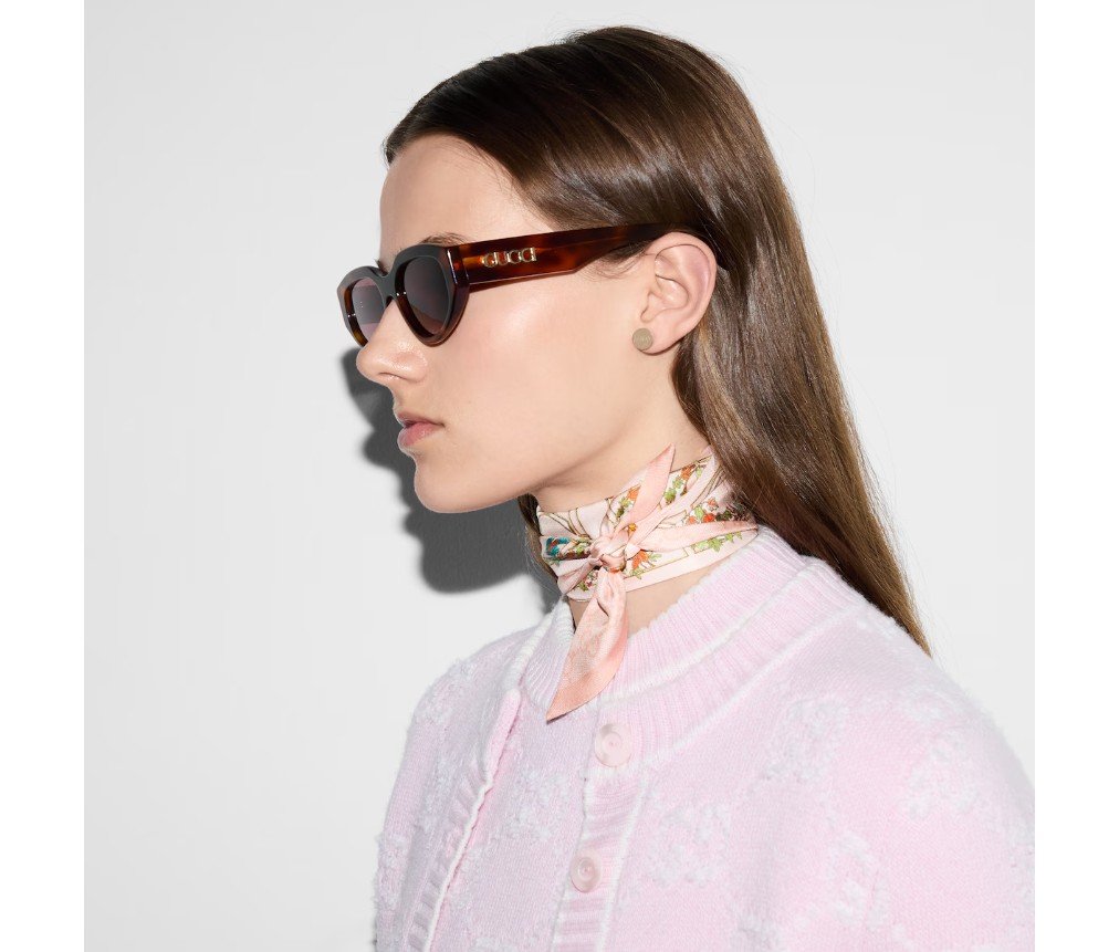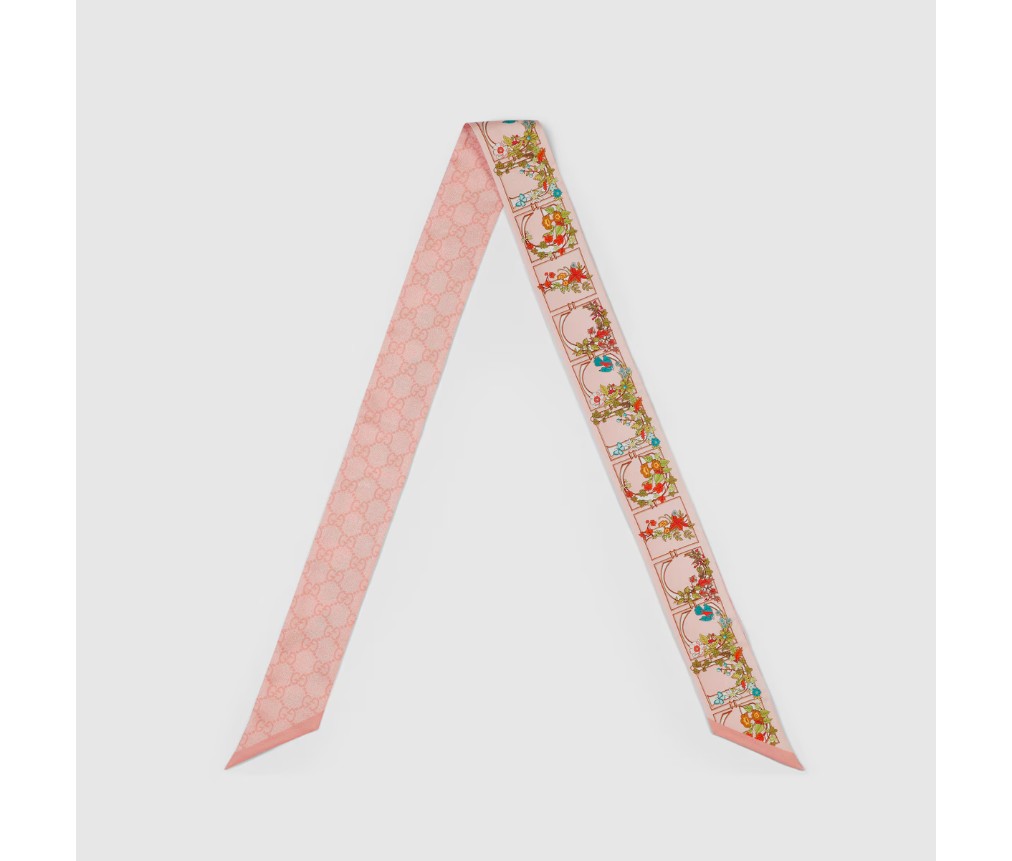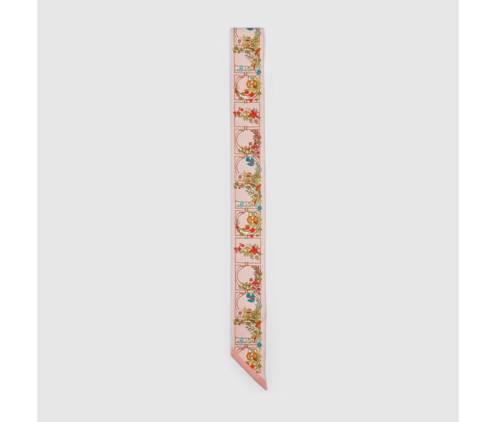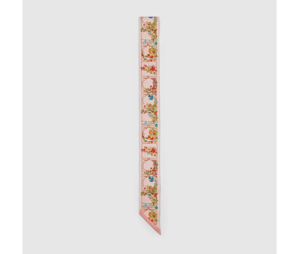 2025 크루즈 컬렉션을 위해 역사적인 플로라 프린트가 새롭게 재해석되었습니다. 파스텔 톤의 실크와 부드러운 액세서리에 플로럴 패턴이 더해져 로맨틱한 분위기를 더합니다. 이 리본은 실크 소재로 제작되었으며, 구찌 로고와 꽃, 그리고 정원 속 동물 프린트가 전면에 새겨져 있습니다.
