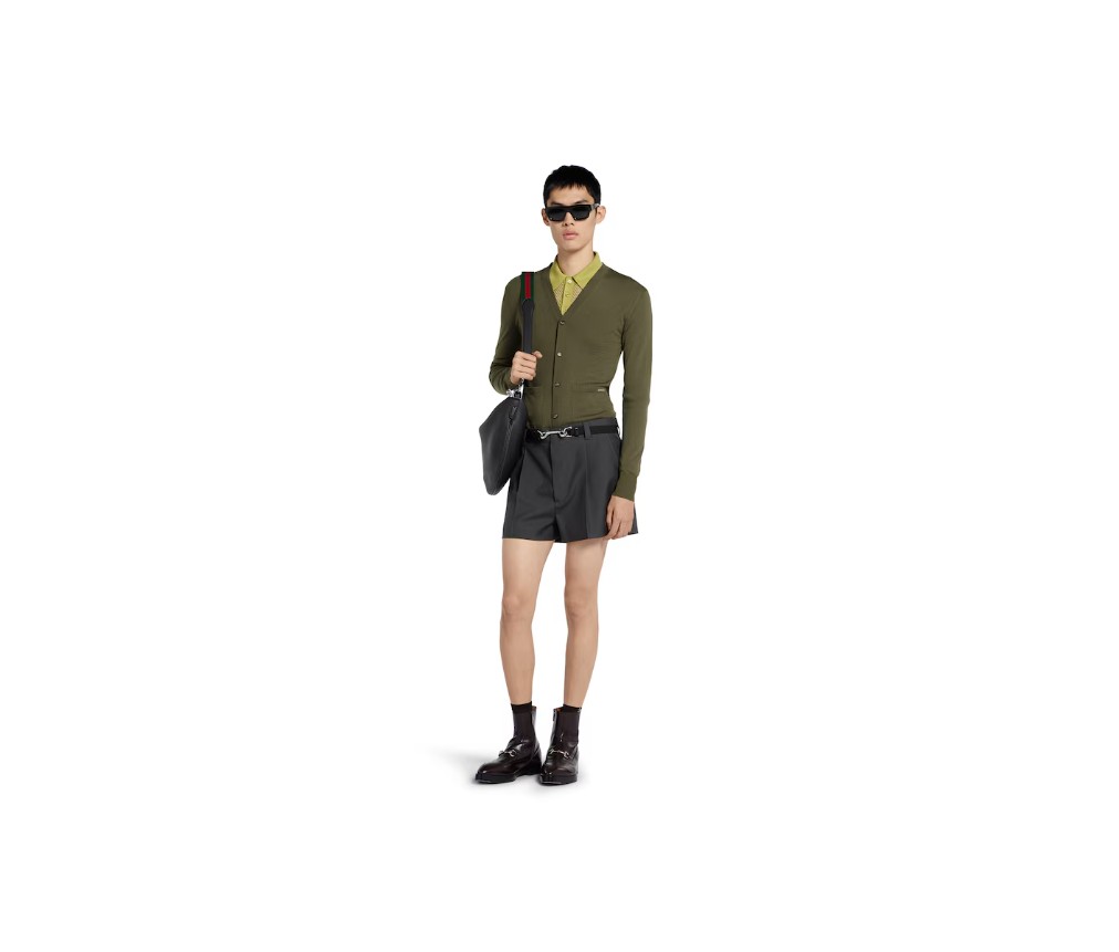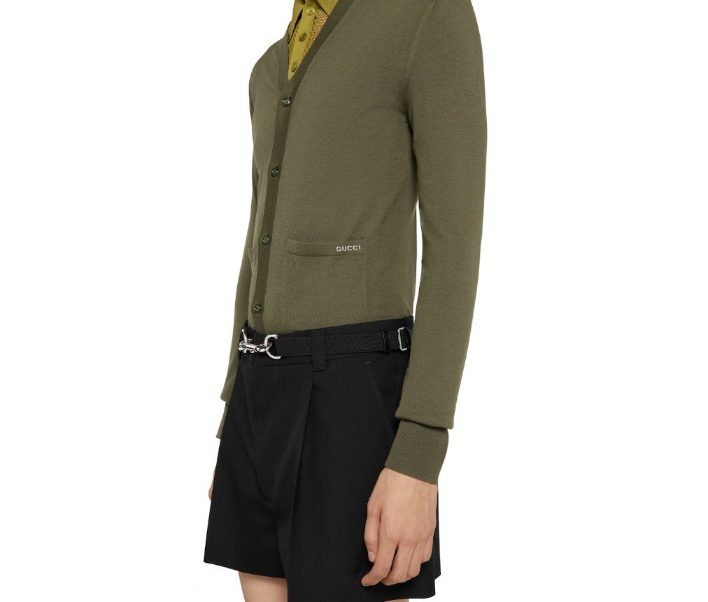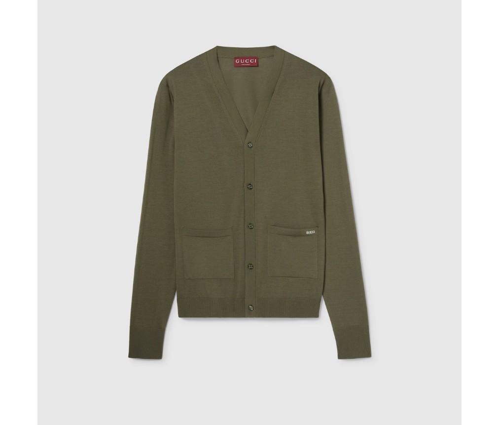 스타일 822599 XKEP1 30512025 봄/여름 컬렉션에서는 인타르시아 디테일이 두드러지게 나타납니다. 이 고급 울 니트 카디건은 앞면에 섬세한 구찌 인타르시아가 특징입니다. V넥라인과 단추 여밈이 디자인을 완성합니다.