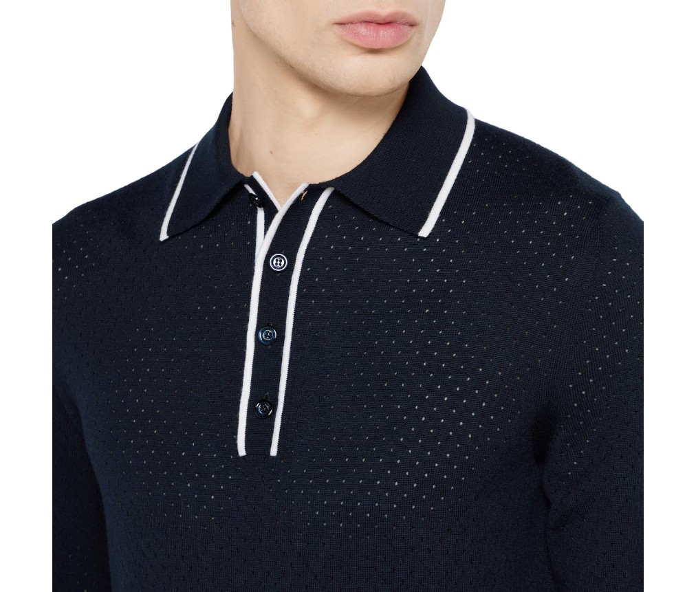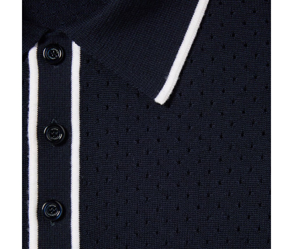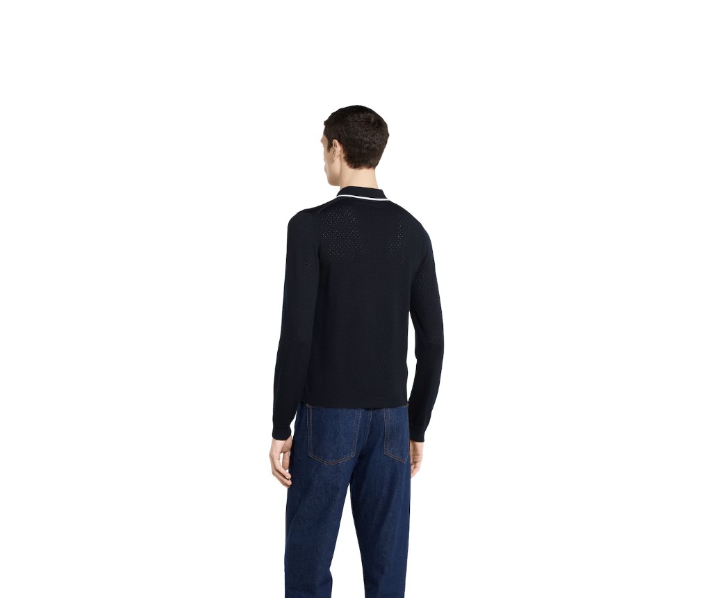 2025 프리폴 컬렉션에서는 캐주얼한 감성의 포멀웨어가 새로운 실루엣과 컷으로 선보입니다. 시그니처 디테일과 세련된 디테일이 조화를 이룹니다. 이 퍼포레이티드 파인 울 폴로 셔츠는 구찌 인타르시아 디테일이 특징입니다.