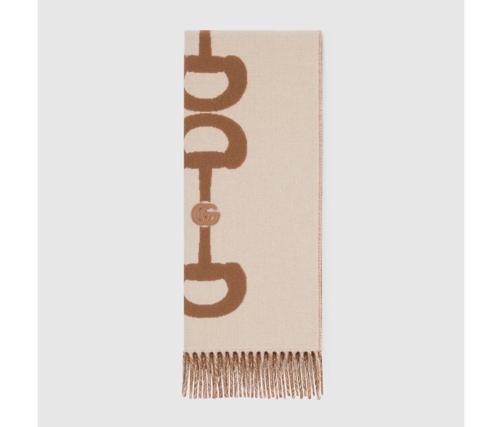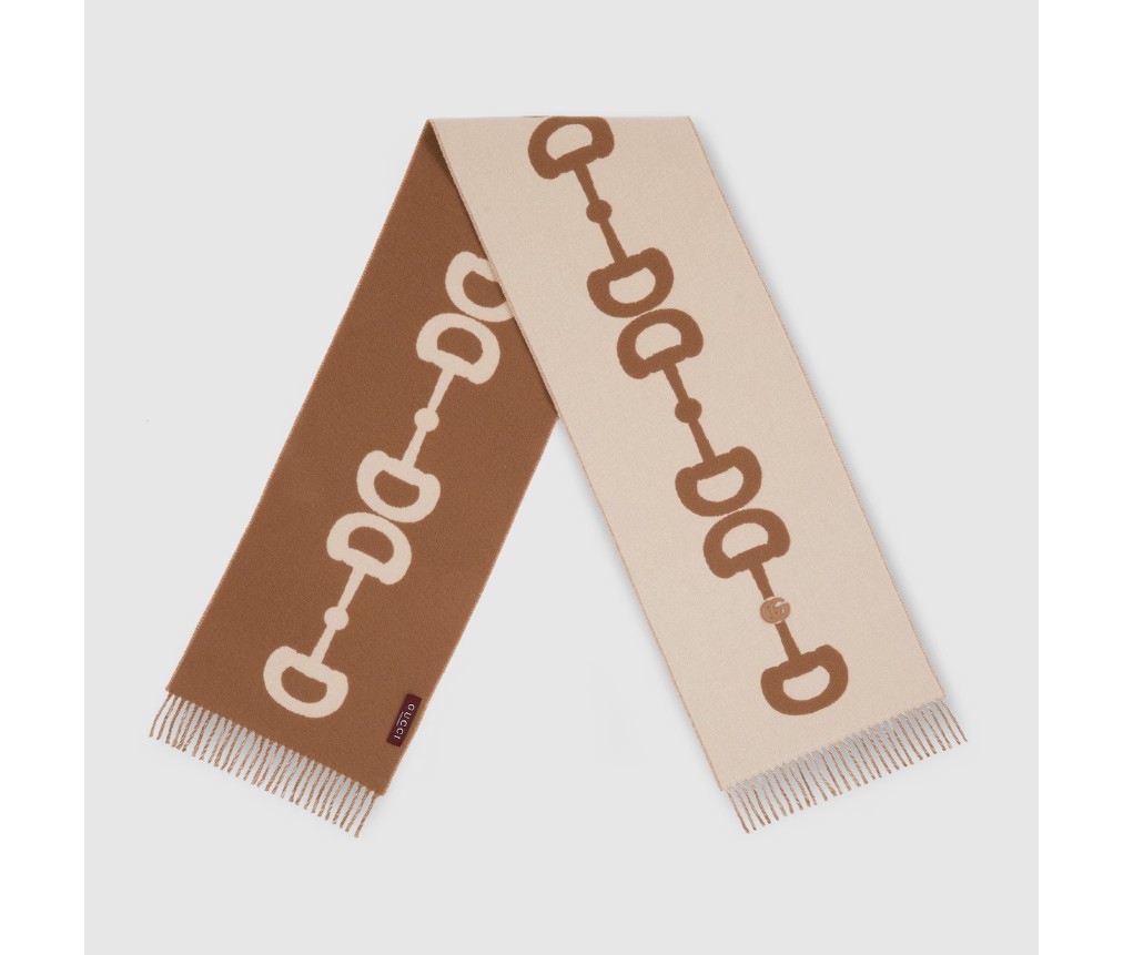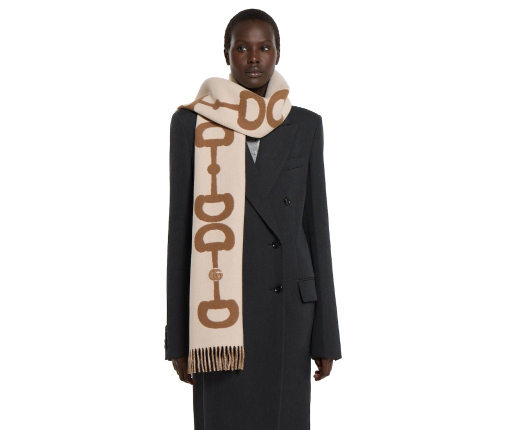2025 프리폴 소프트 & 실크 액세서리 컬렉션은 세련된 트리밍, 로고 패치, 그리고 은은한 자수 장식을 통해 하우스의 코드를 생동감 있게 표현합니다. 이 울 캐시미어 스카프는 호스빗 인타르시아 패턴을 선보이며, 프린지 트리밍으로 마감되었습니다.