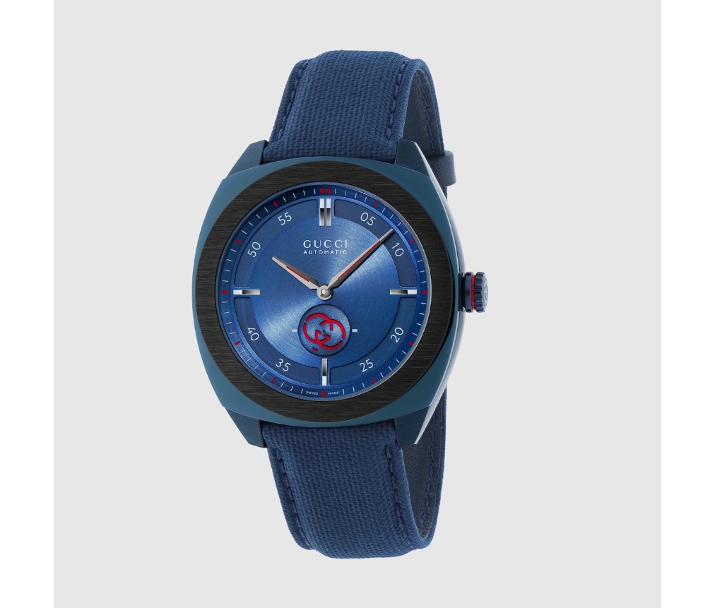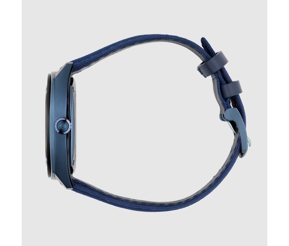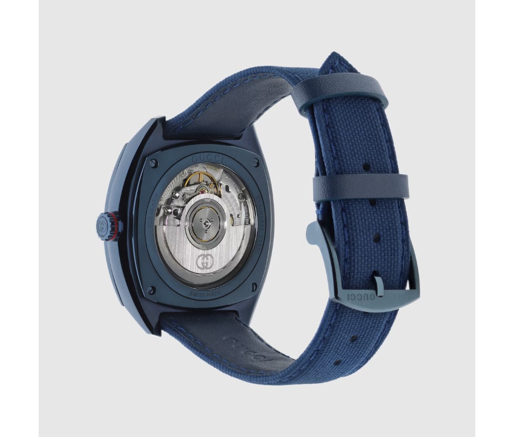 – 블루 PVD 코팅 41mm 스테인리스 스틸 케이스, 블루 다이얼, 인터로킹 G 스몰 세컨즈 디스플레이, 블랙 PVD 베젤, 텍스타일 효과 블루 러버 스트랩– 반사 방지 코팅이 된 사파이어 유리