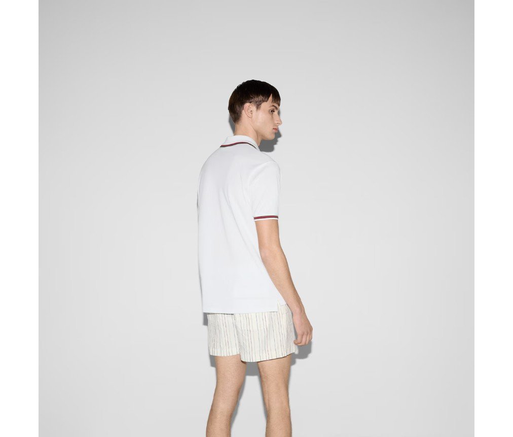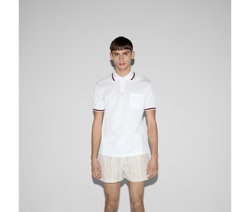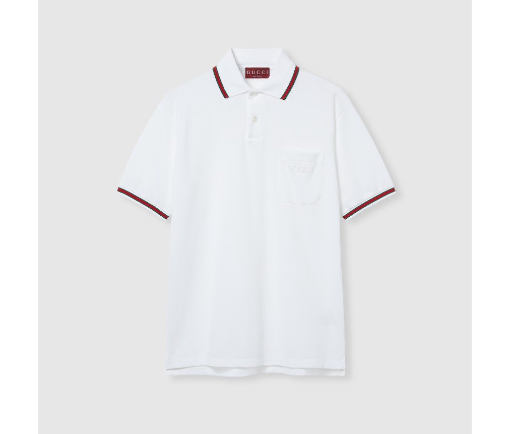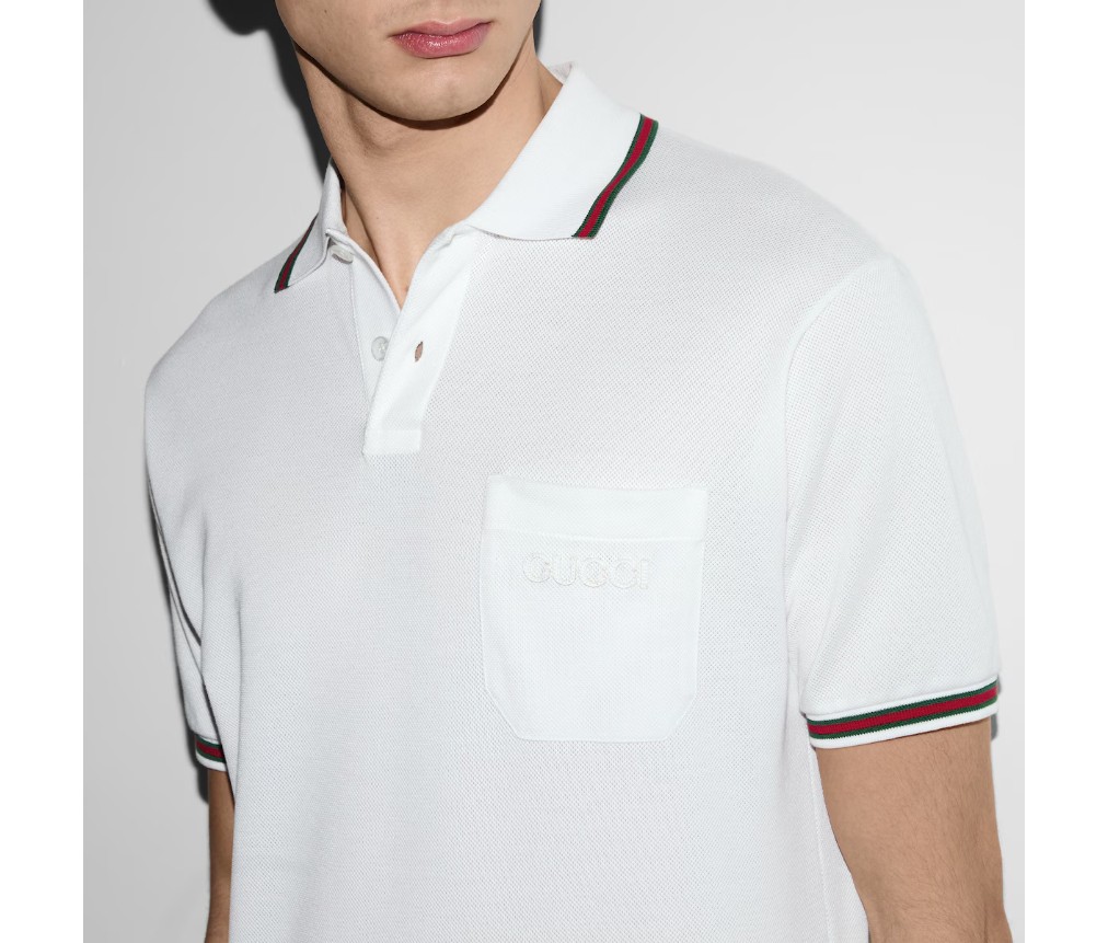 스타일 795174 XJG5C 9733크루즈 2025 컬렉션의 부드러운 니트웨어와 폴로 셔츠와 같은 클래식 아이템들은 데일리룩을 한층 더 돋보이게 하는 섬세한 디테일로 시선을 사로잡습니다. 이 레귤러 핏 폴로 셔츠는 스트레치 코튼 피케 소재에 구찌 자수와 칼라의 웹 디테일이 더해져 더욱 풍성한 느낌을 줍니다.