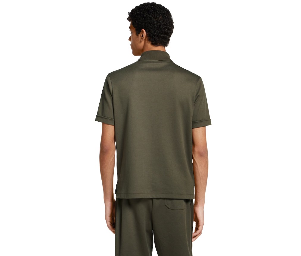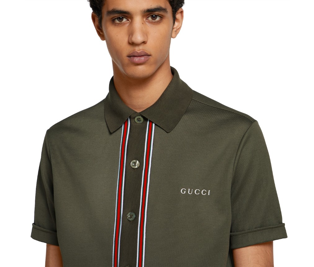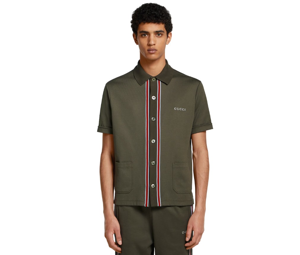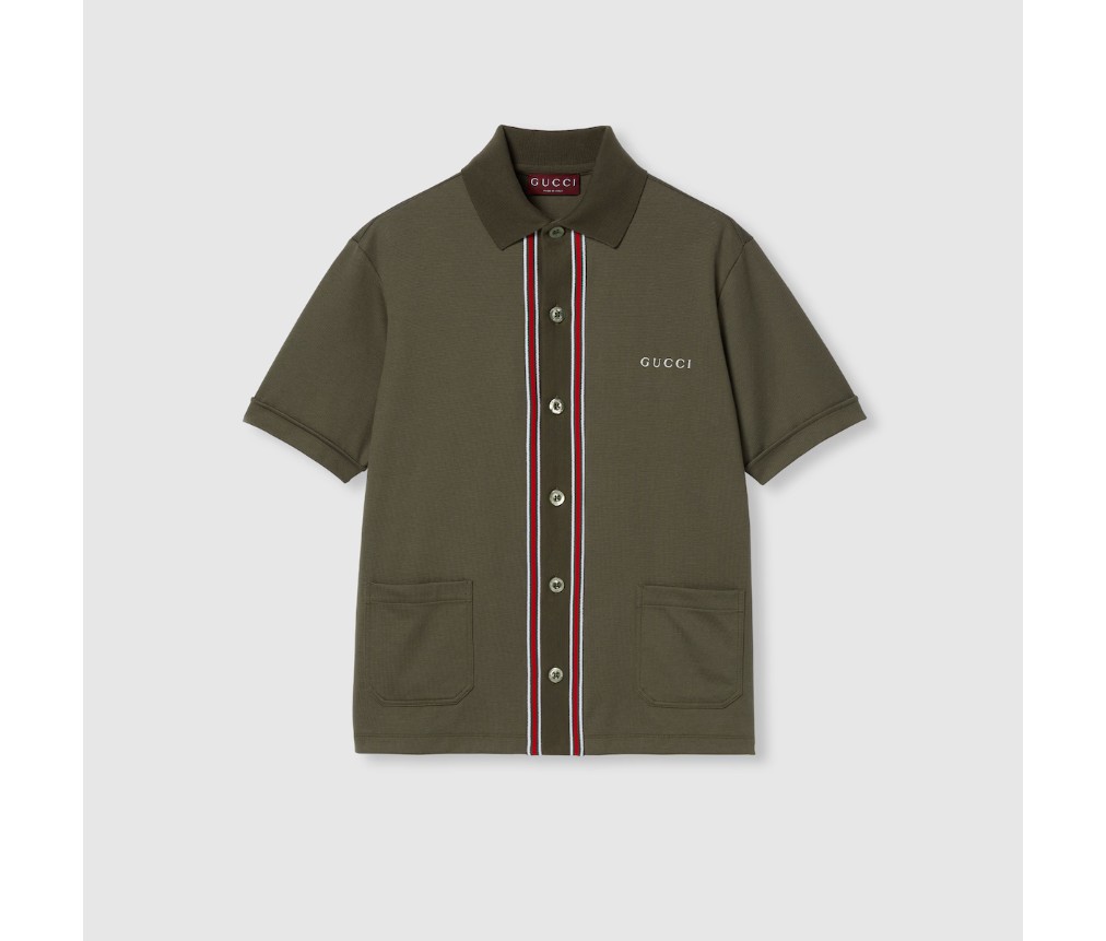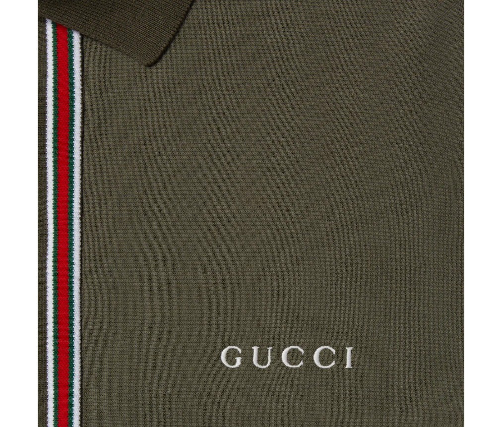 2025년 프리폴 컬렉션은 차분한 블랙, 그레이, 그린 톤으로 구성되어 있으며, 섬세한 플로럴 자수, 엠보싱 로고, 그리고 장인정신이 깃든 디테일이 돋보입니다. 포레스트 그린 스트레치 코튼 피케 소재로 제작된 이 폴로 셔츠는 구찌 자수와 세로 스트라이프 패턴이 특징입니다.