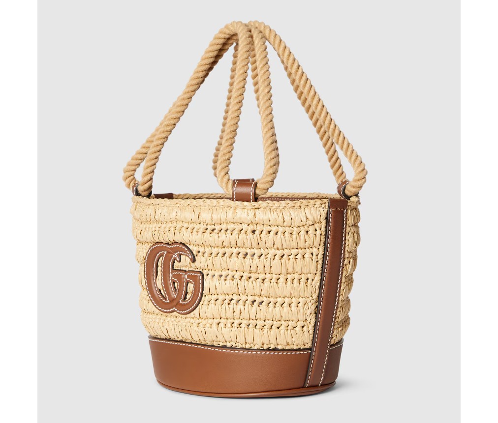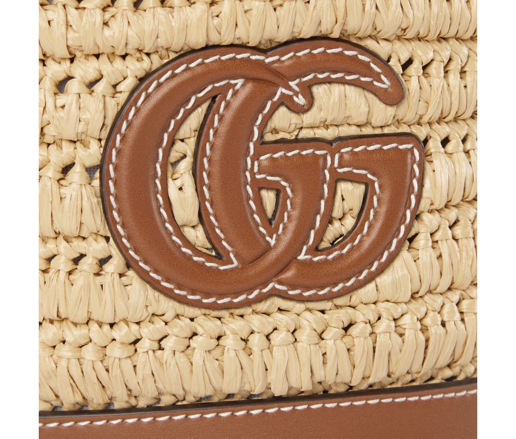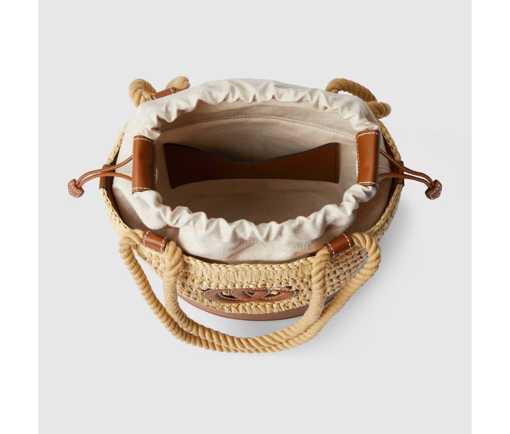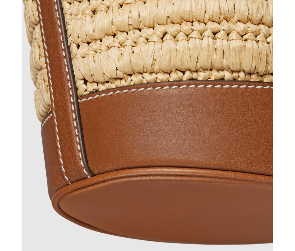 따뜻한 날씨에 어울리는 독특한 라피아 디테일과 부드러운 가죽 트리밍이 가방의 포인트를 더합니다. 이 미니 버킷 백은 천연 라피아 효과의 비스코스 소재로 제작되었으며, 앞면에는 더블 G 가죽 패치가 장식되어 있습니다.
