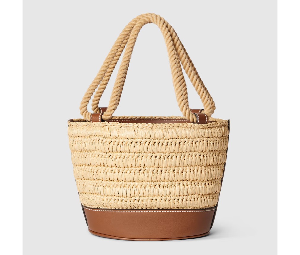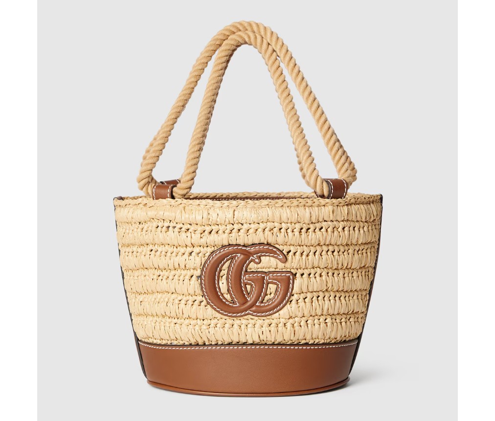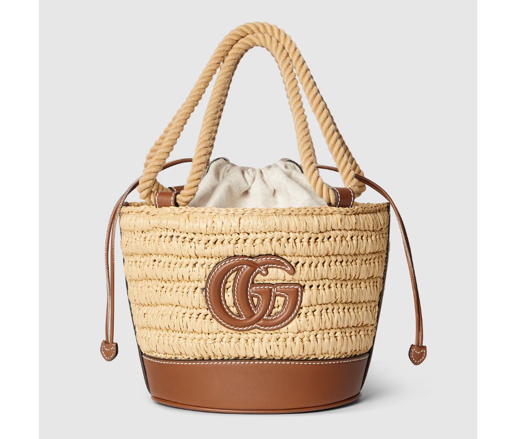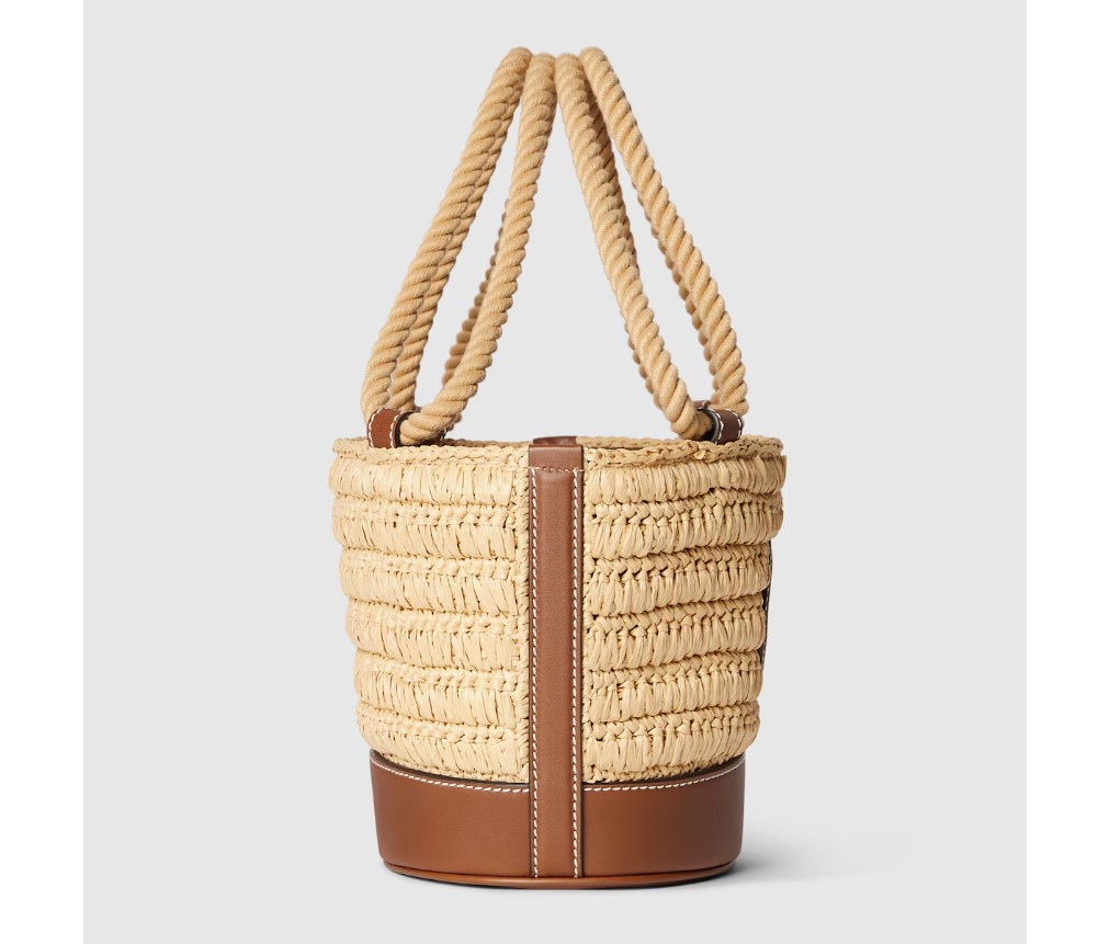 따뜻한 날씨에 어울리는 독특한 라피아 디테일과 부드러운 가죽 트리밍이 가방의 포인트를 더합니다. 이 미니 버킷 백은 천연 라피아 효과의 비스코스 소재로 제작되었으며, 앞면에는 더블 G 가죽 패치가 장식되어 있습니다.