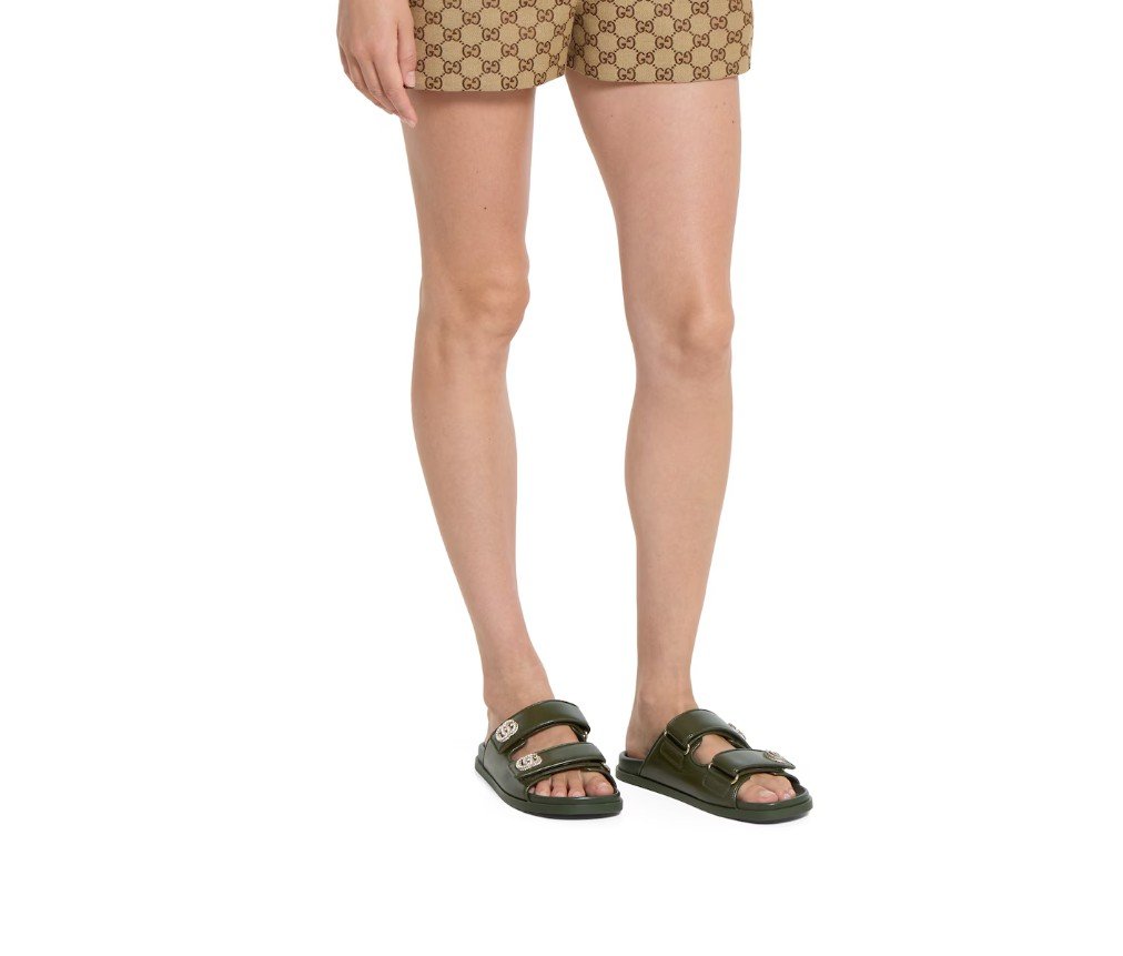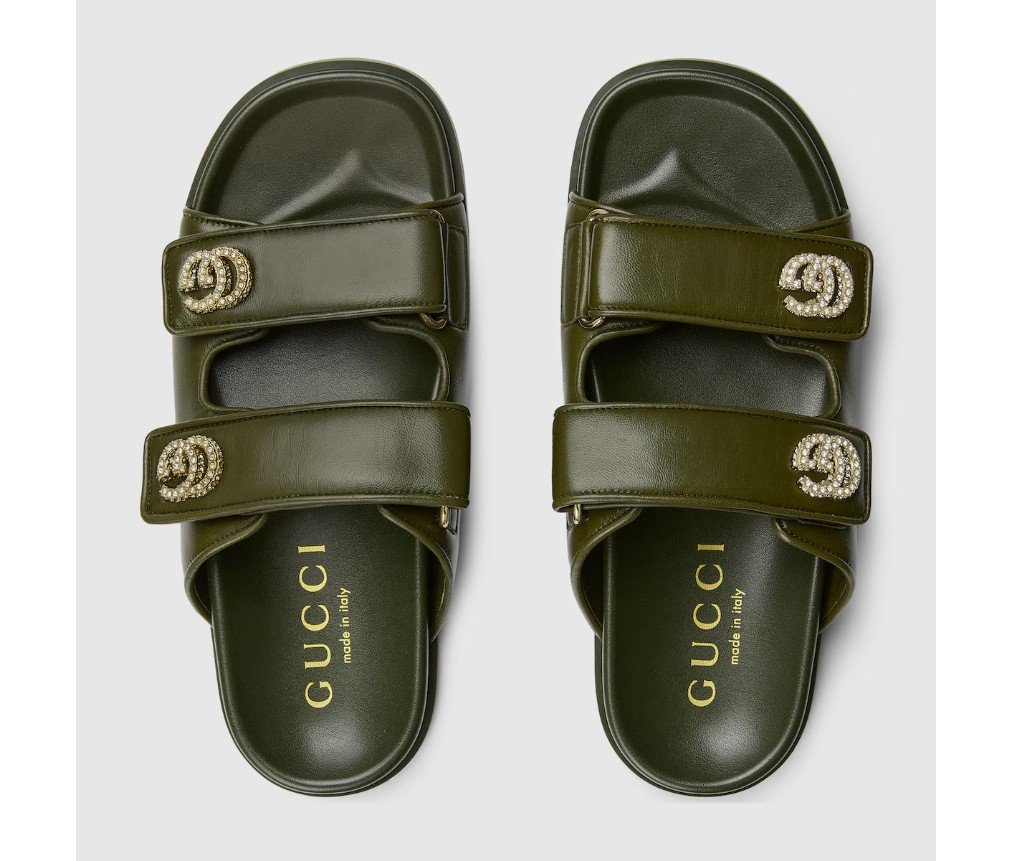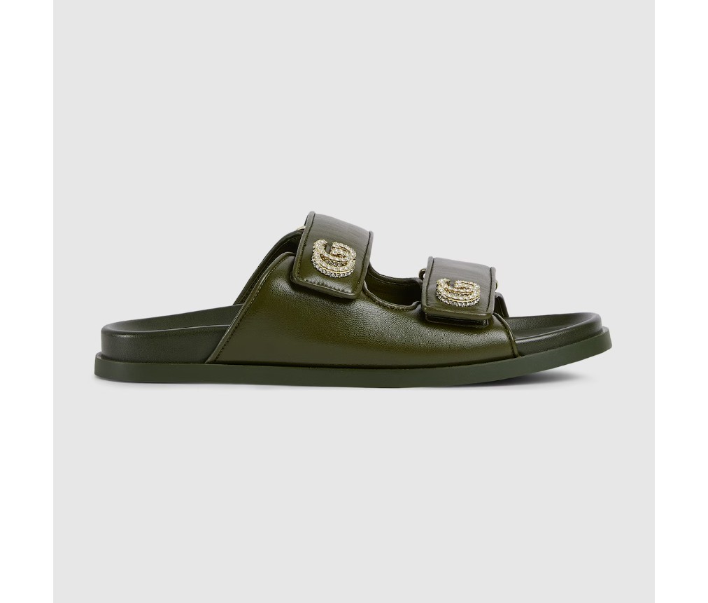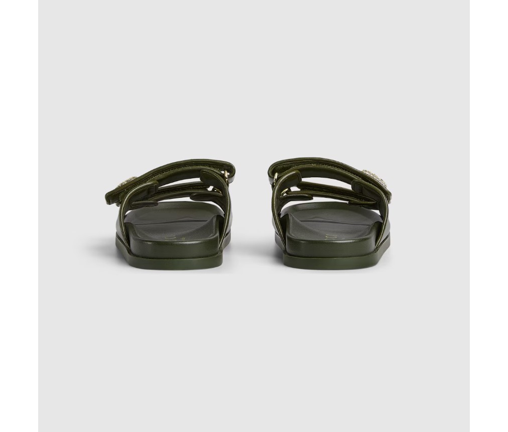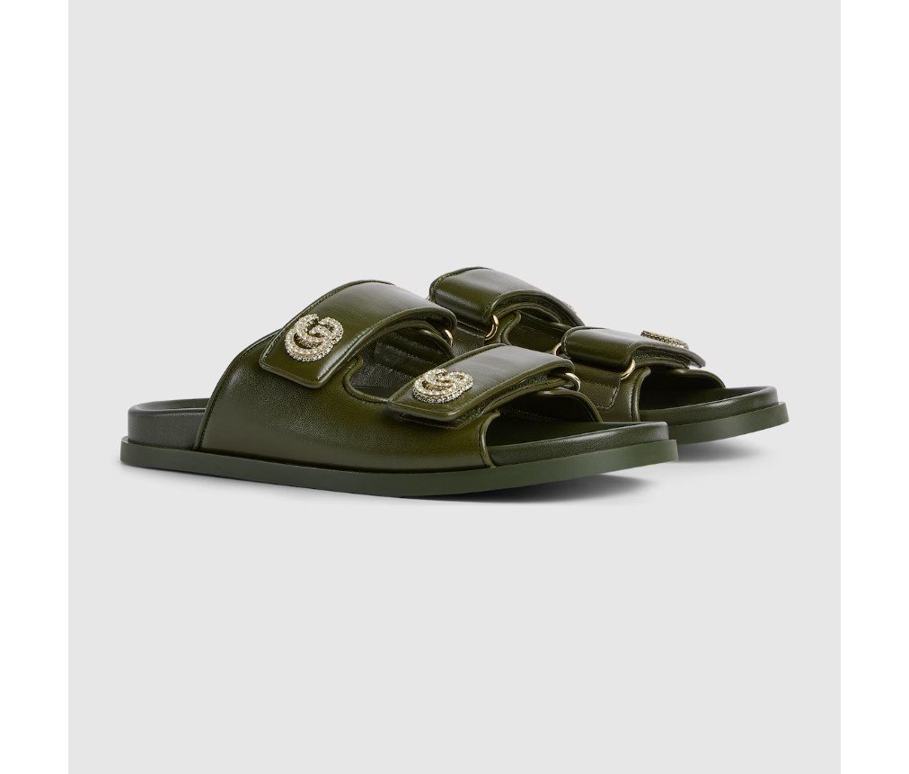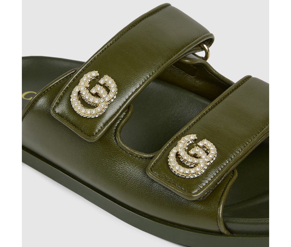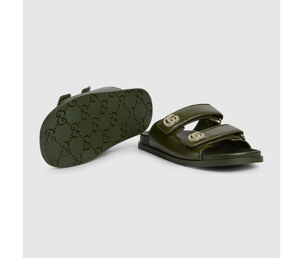 가죽으로 제작된 이 샌들은 밝은 금색 하드웨어에 반짝이는 크리스털로 장식된 틀림없는 Double G 로고가 특징으로, 세련된 우아함을 더해줍니다.