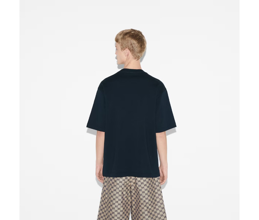 스타일 784361 XJGKA 4735이탈리아 해안의 비치 클럽과 여름 정신에서 영감을 받은 이 아이템은 구찌 리도(Gucci LIDO) 컬렉션의 일부입니다. 구찌의 상징적인 코드와 세련된 패턴이 프리폴 컬렉션을 위해 현대적인 방식으로 재해석되었습니다. 네이비 코튼 저지 소재로 선보이는 이 티셔츠는 구찌 인터로킹 G 프린트가 특징입니다.