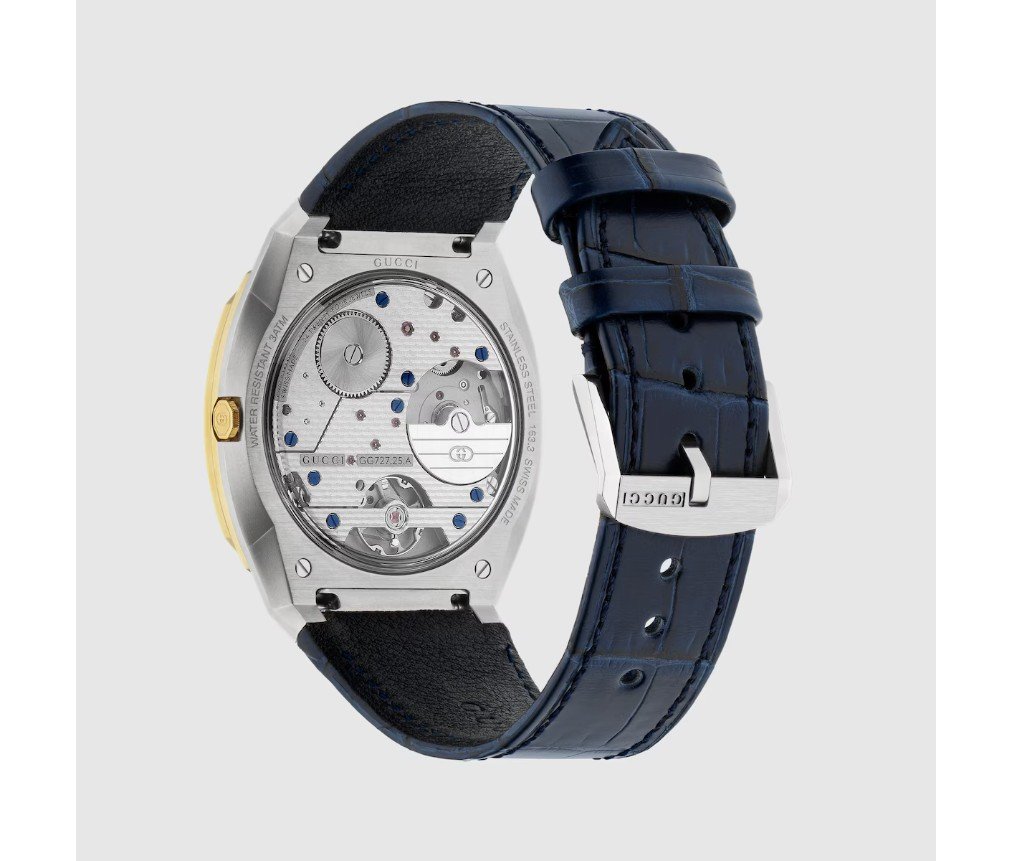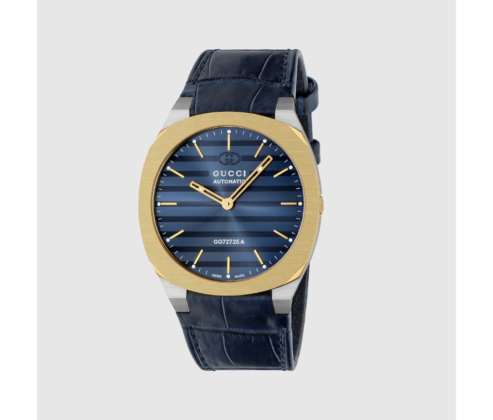 구찌 25H 컬렉션은 아카이브의 상징을 혁신적인 방식으로 재해석해 왔습니다. 이 오토매틱 시계는 역사적인 인터로킹 G 모티프가 돋보이는 블루 다이얼로 디자인되었습니다. 블루 악어 가죽 스트랩이 이 액세서리의 매력을 더욱 돋보이게 합니다.