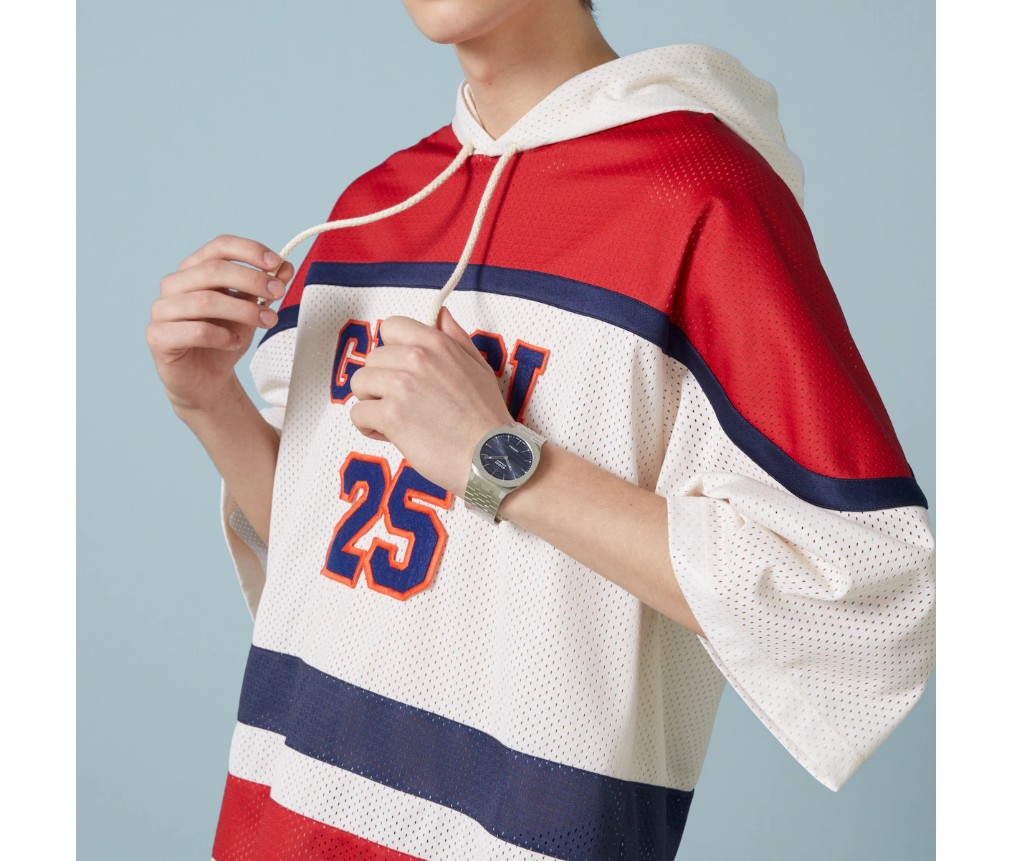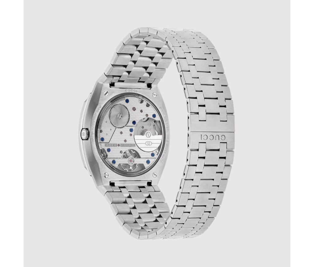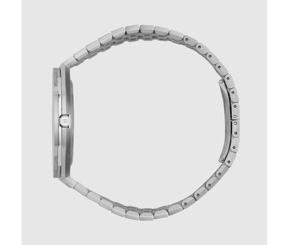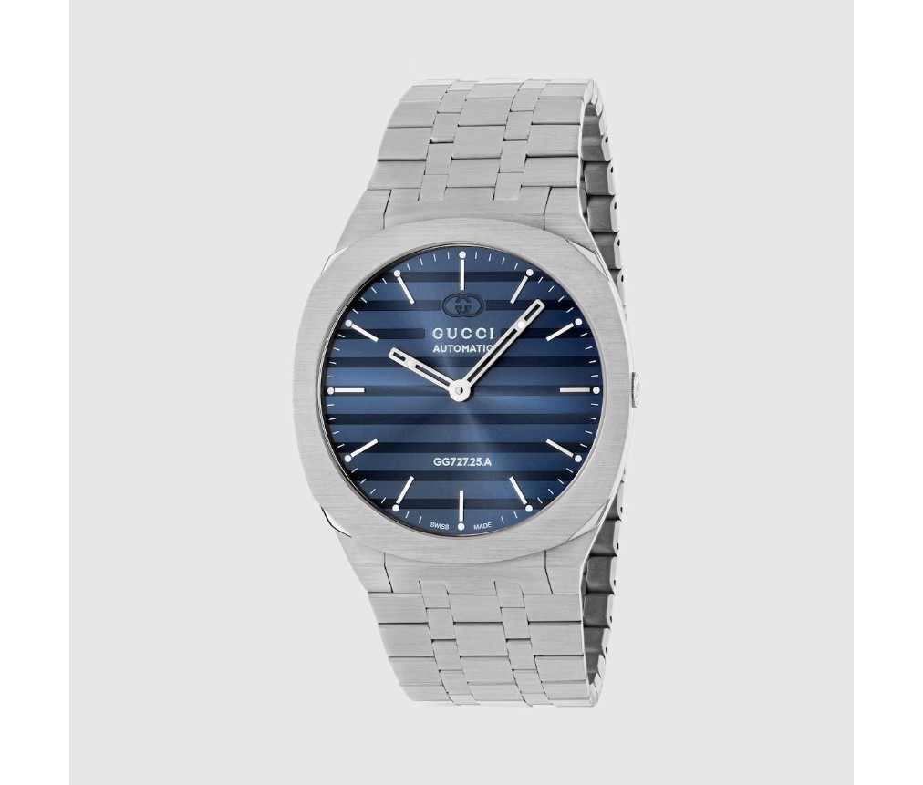 구찌 25H의 유선형 실루엣은 현대 건축의 매끈한 형태에서 영감을 받았습니다. 이 오토매틱 시계는 다층 케이스와 5링크 스틸 브레이슬릿으로 선보입니다. 블루 다이얼과 인터로킹 G 모티프가 디자인을 완성합니다.